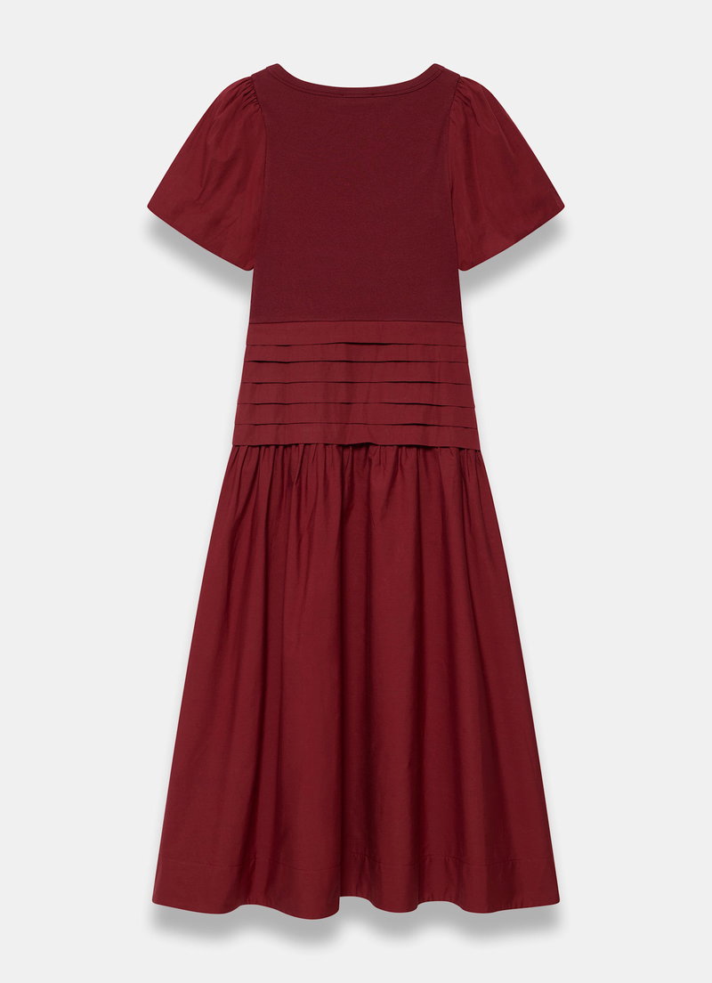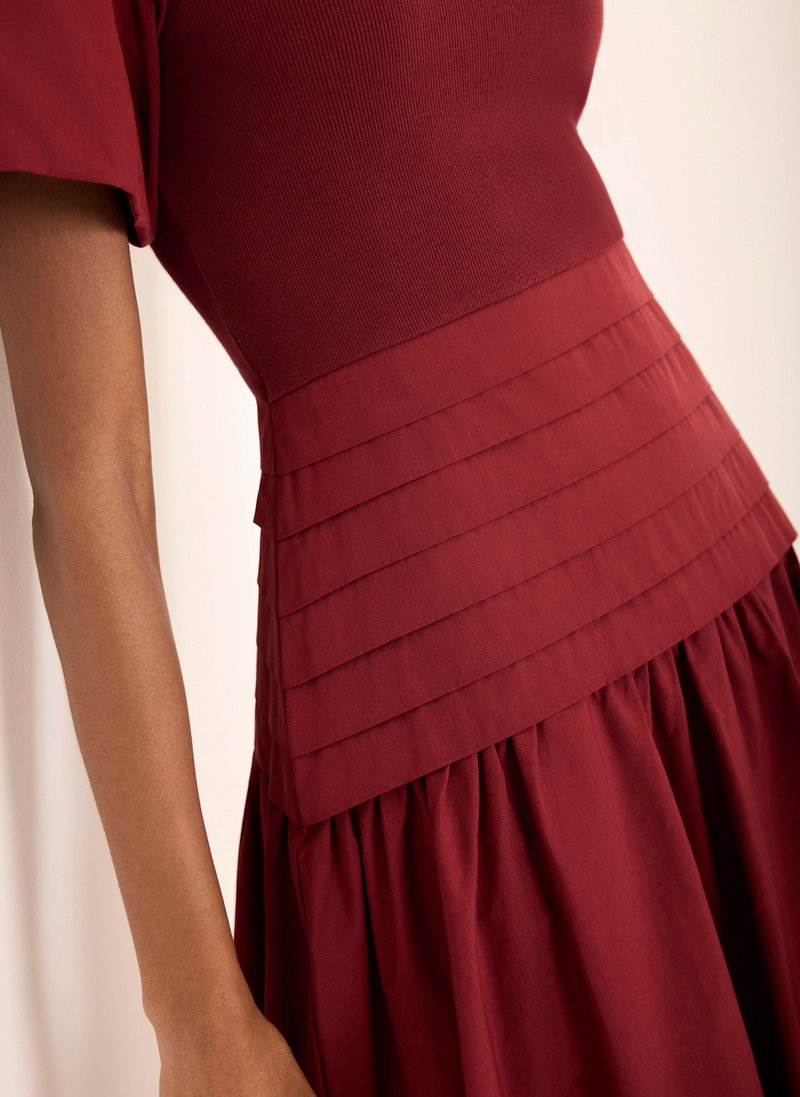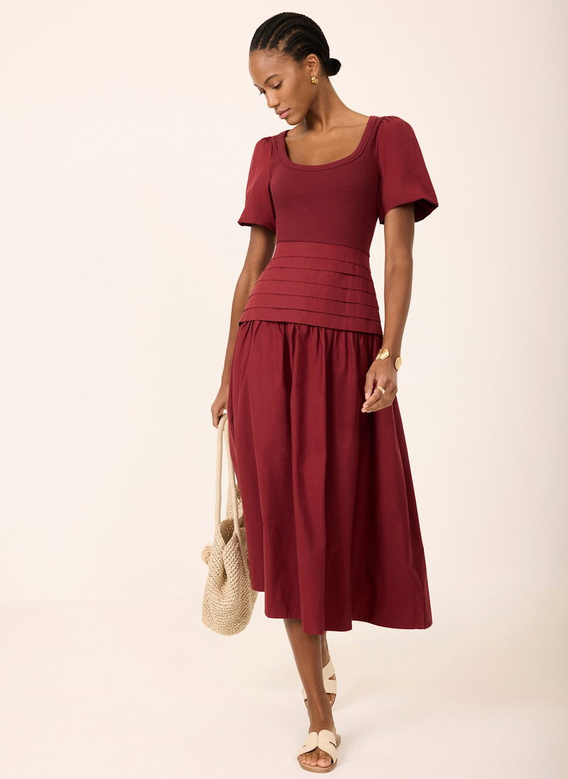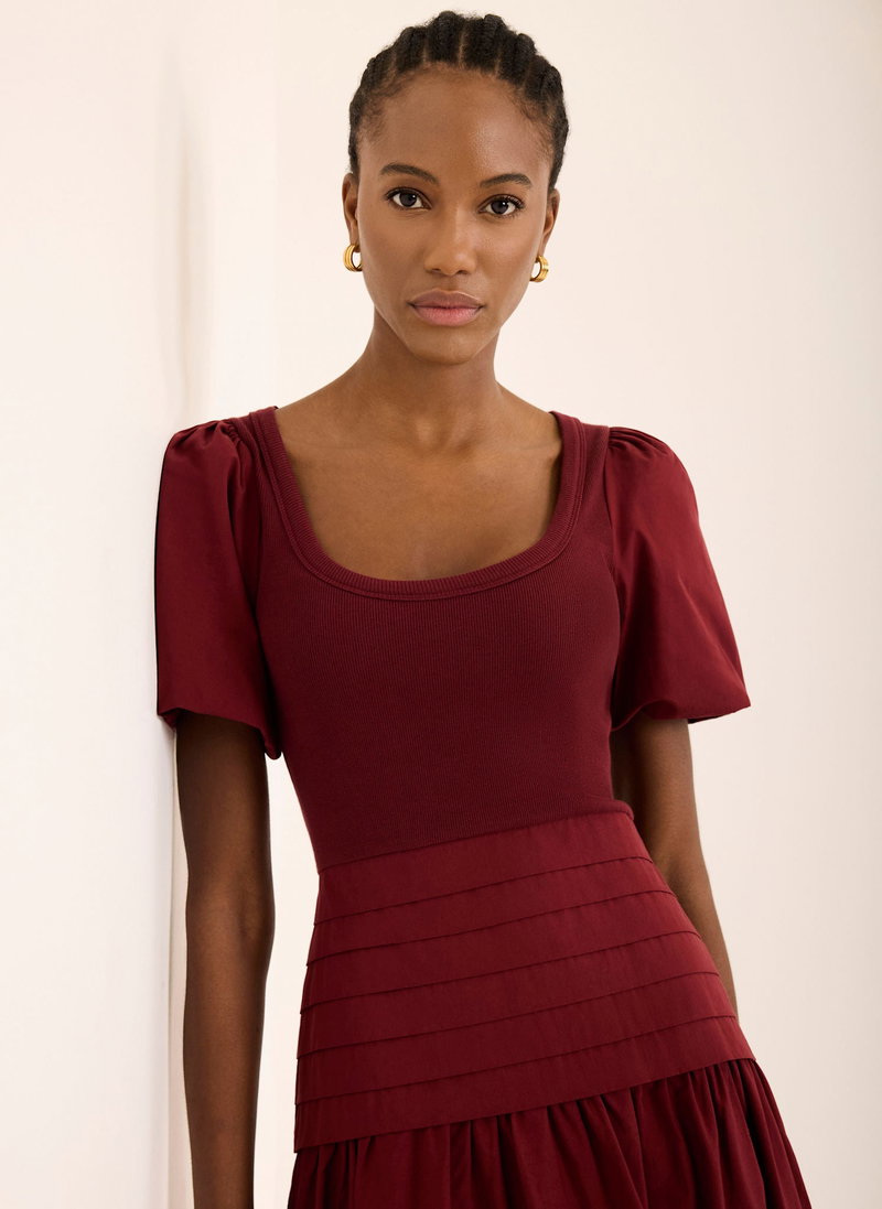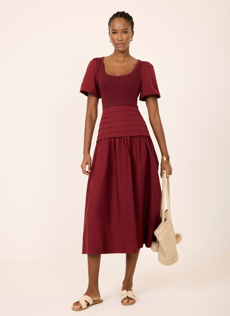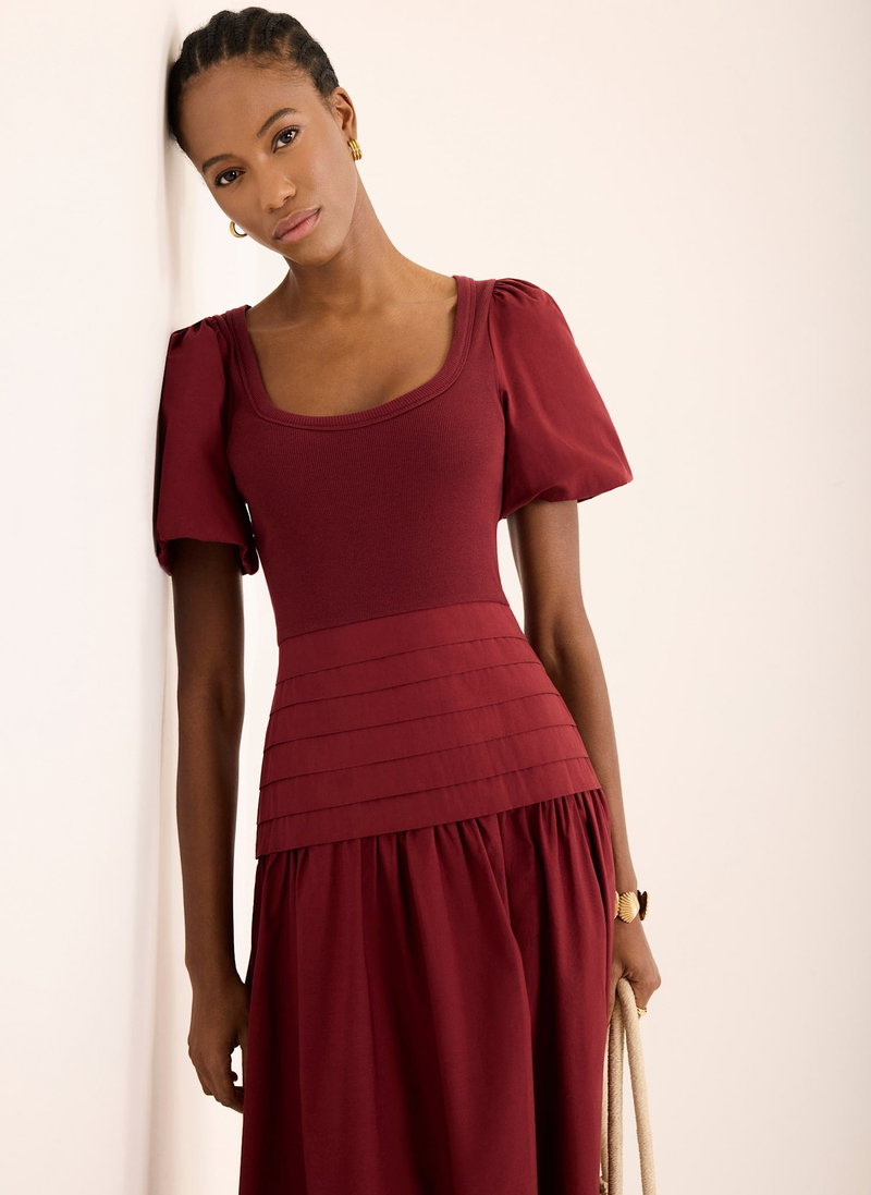 Burgundy tone dress in a maxi silhouette featuring a scoop neckline, short sleeves and pin tuck dropped waistband.