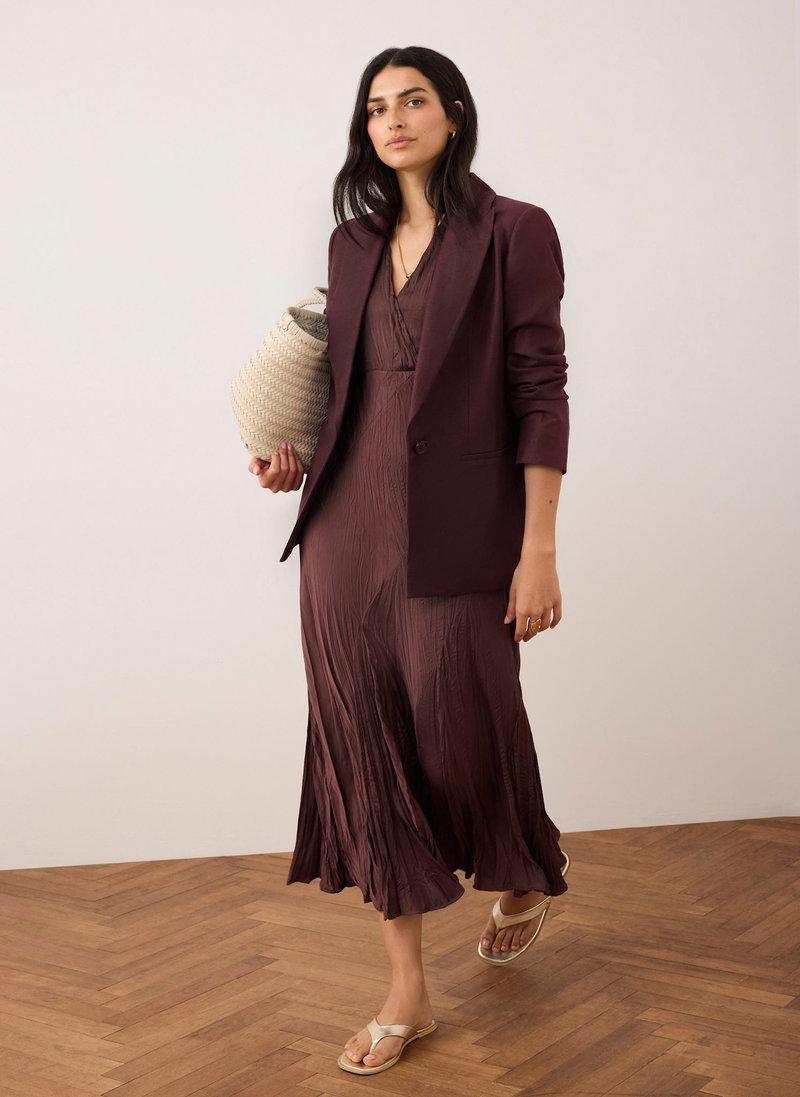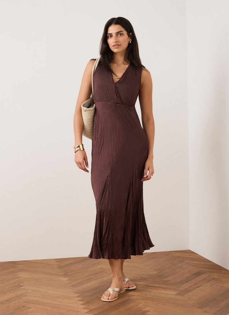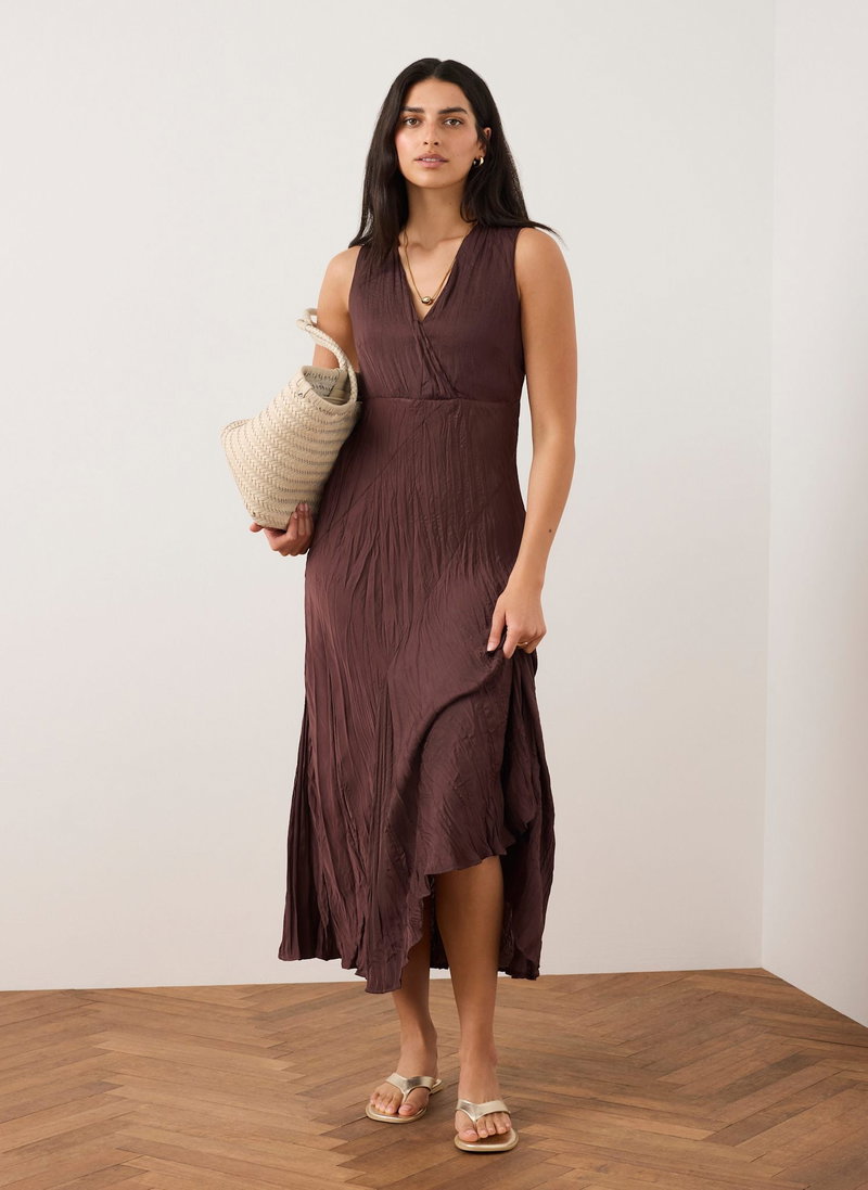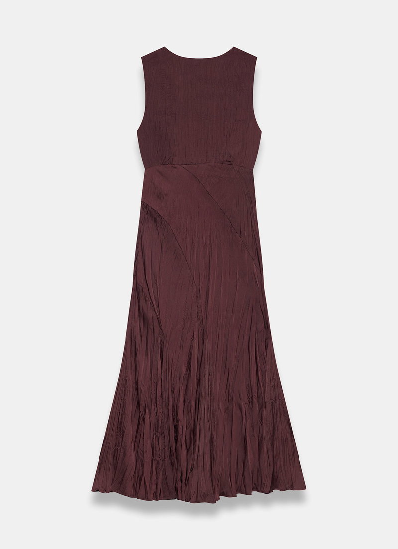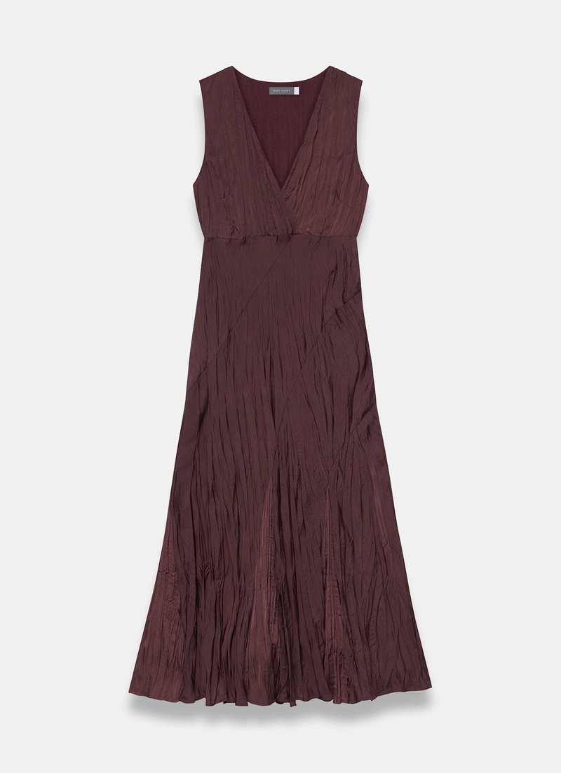 Burgundy sleeveless crinkle dress in a maxi silhouette featuring a V-neckline, asymmetric seam detailing and godet hemline.
