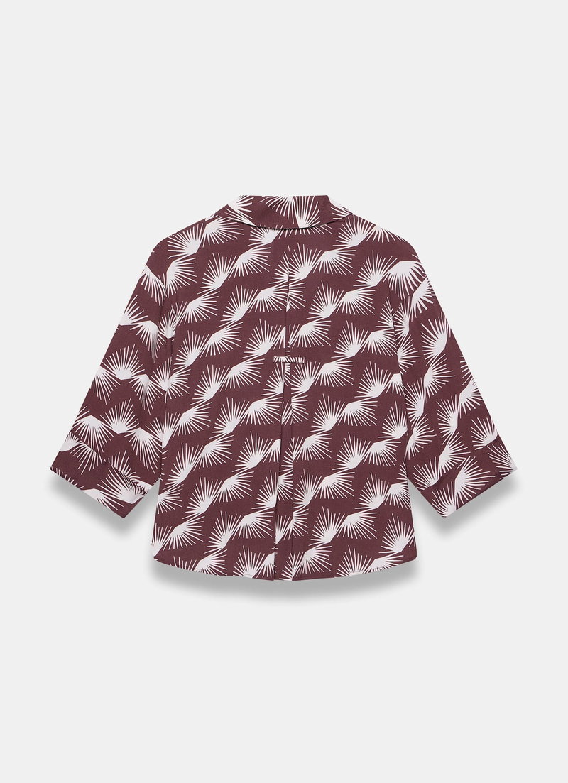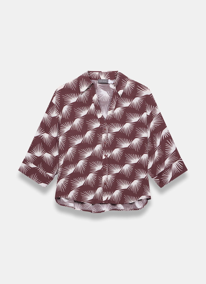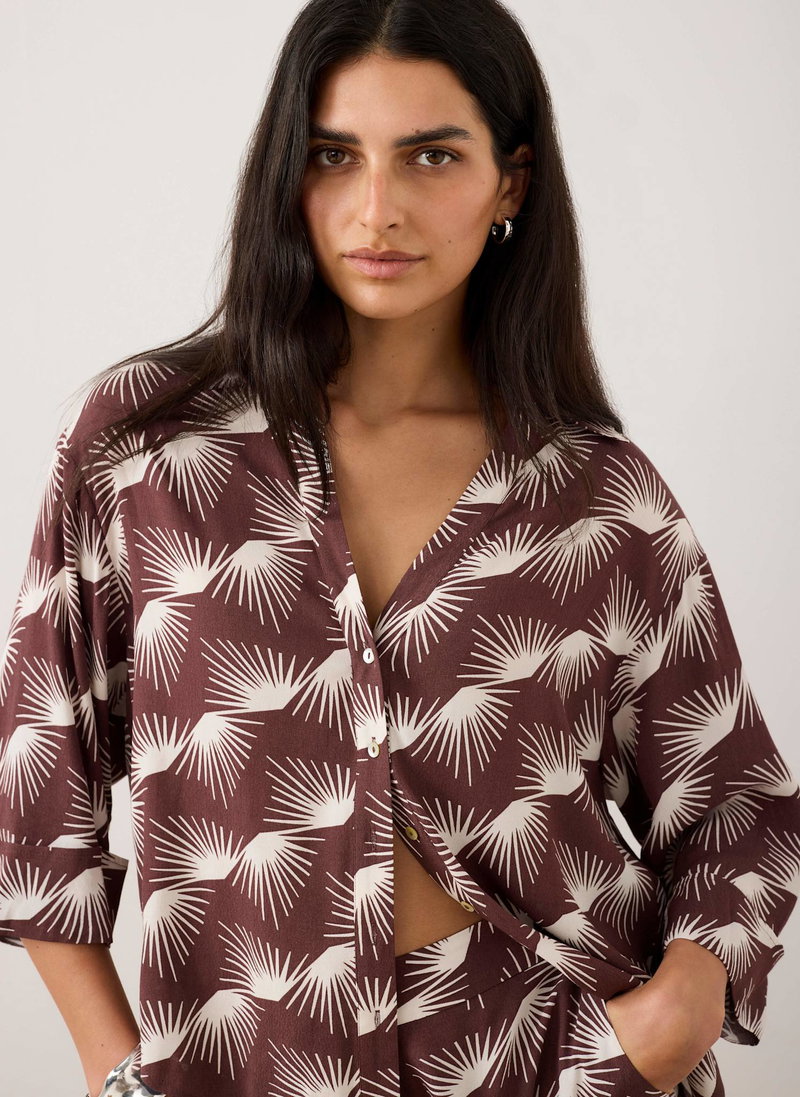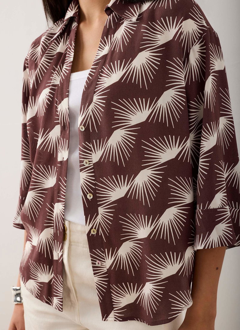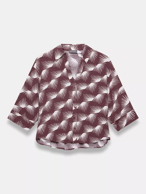 Burgundy tone graphic print shirt featuring a collared V-neckline, 3/4 length roll-back sleeves, drop back curved hemline, darted back with a button fastening through the front.