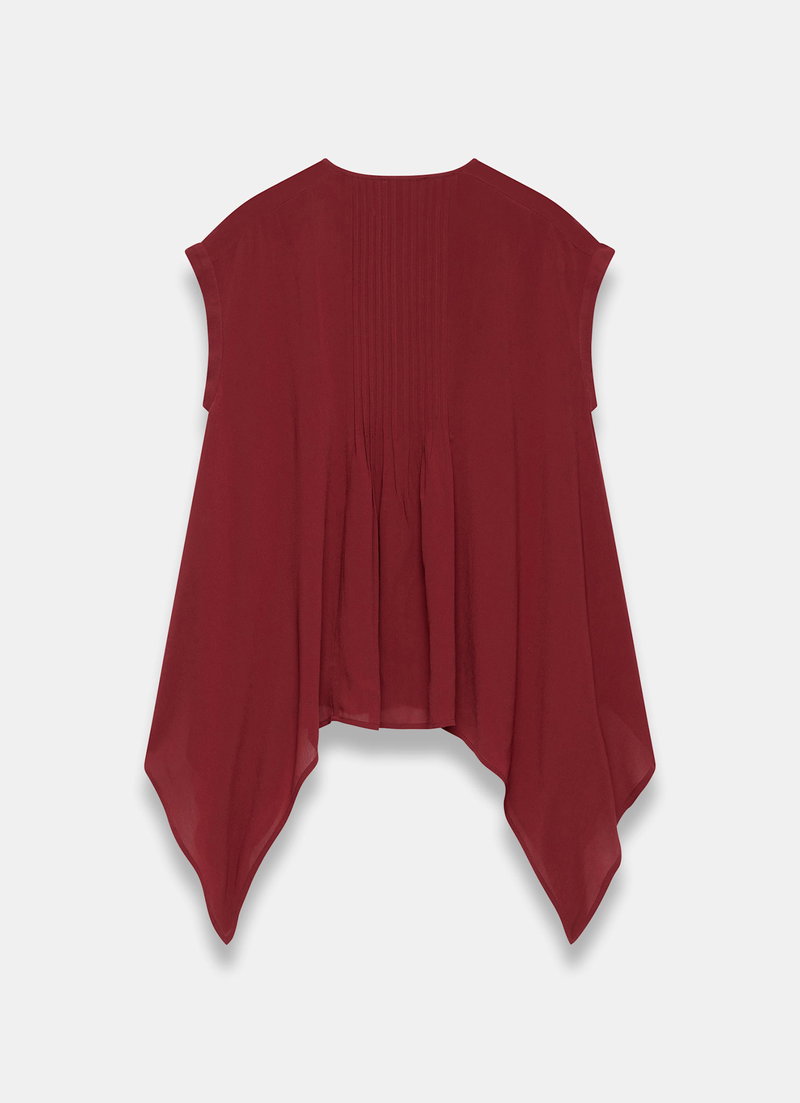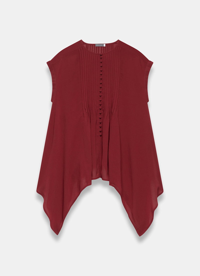 Burgundy sleeveless top featuring a crew neckline, pin-tuck detailing, cap sleeves, handkerchief hemline with a button fastening through the front.