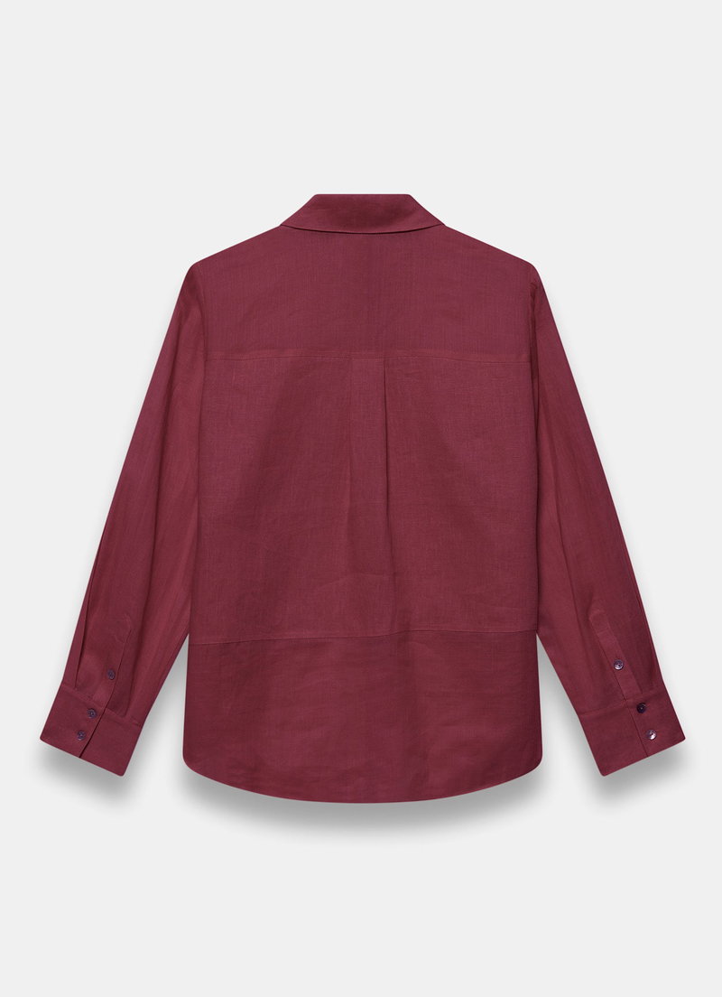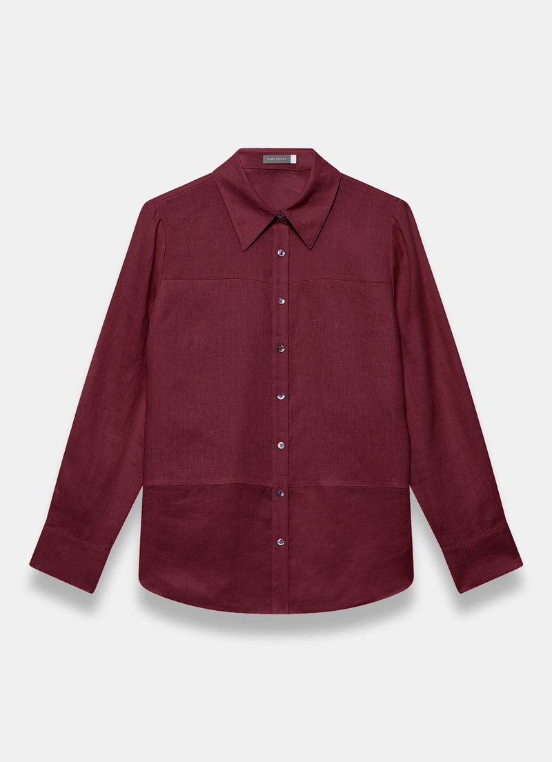 Burgundy shirt featuring a classic collar, long sleeves, buttoned cuffs, scooped hemline with a button fastening through the front.