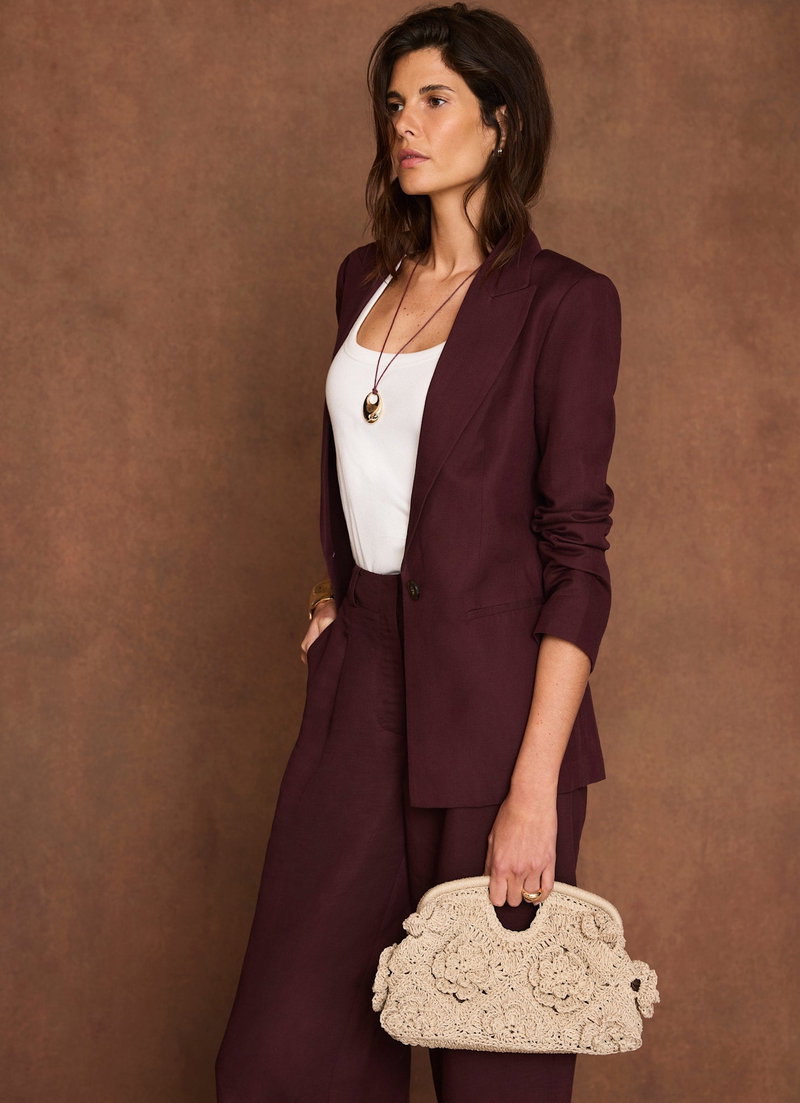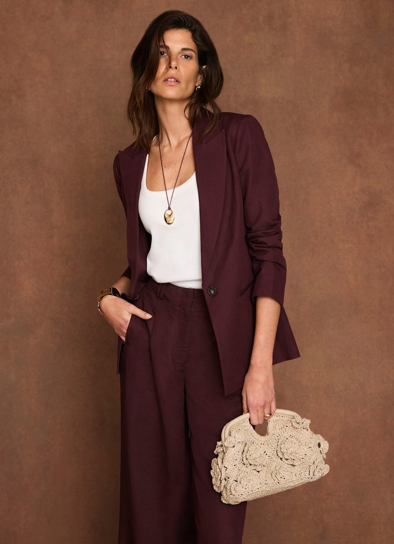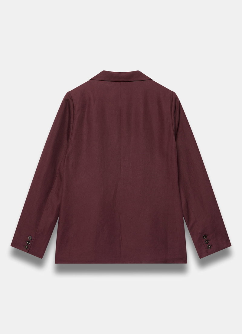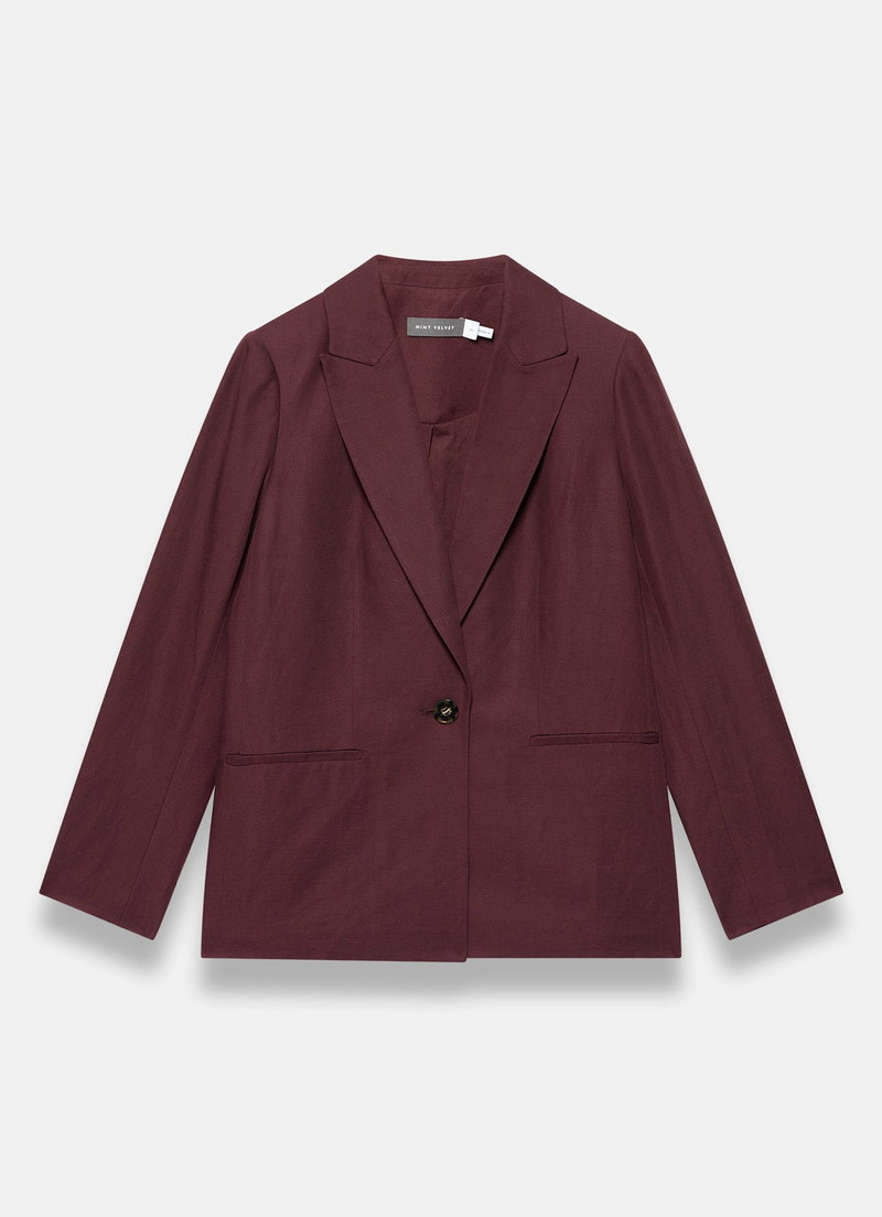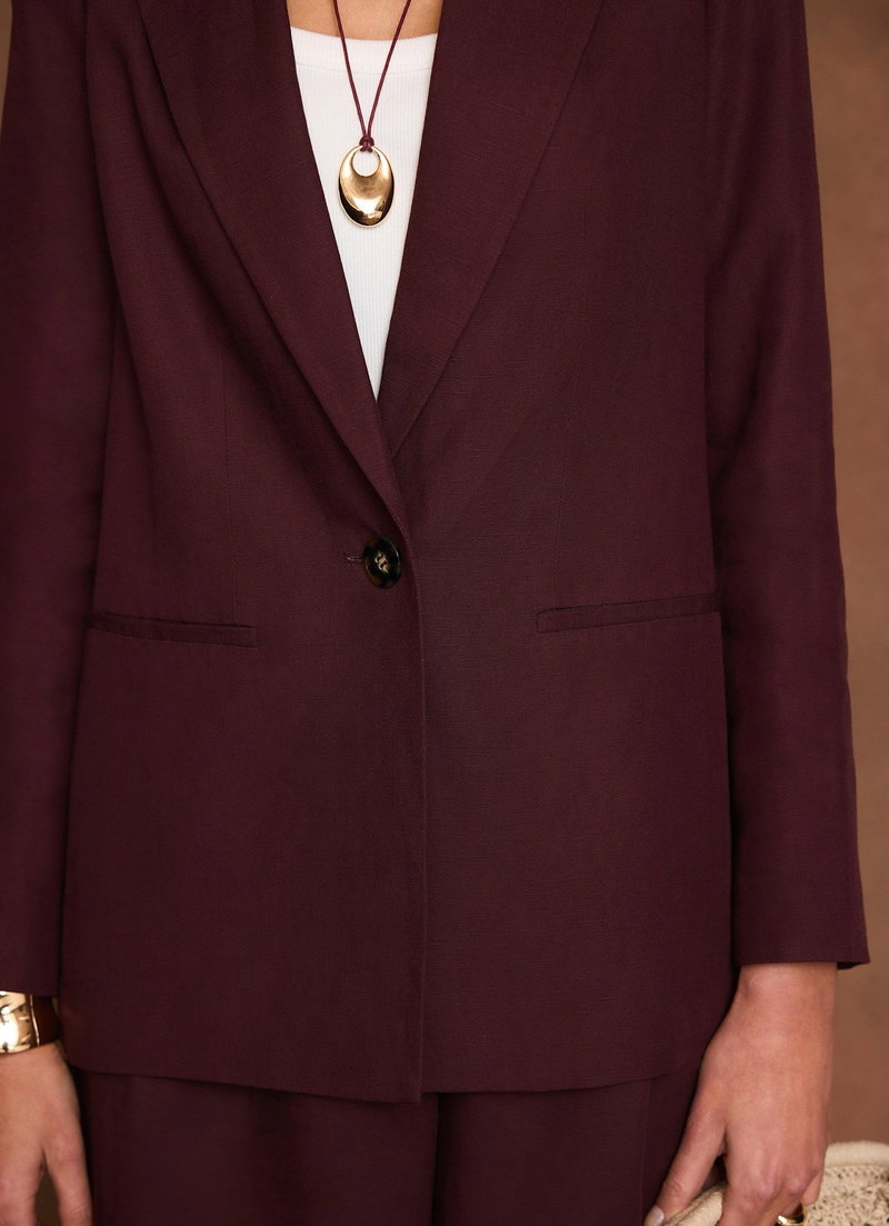 Burgundy blazer in a single breasted silhouette featuring peaked lapels, long sleeves, buttoned cuffs, welt pockets with a button fastening through the front. Fully lined.