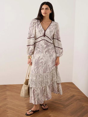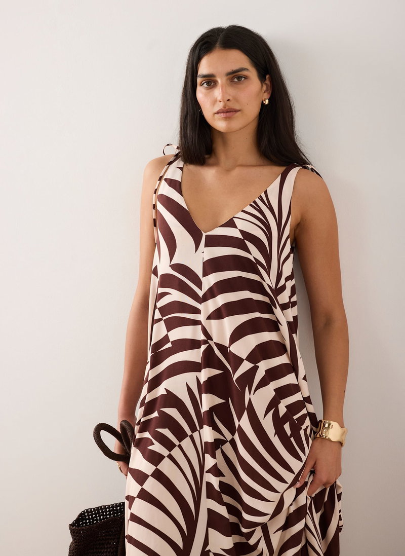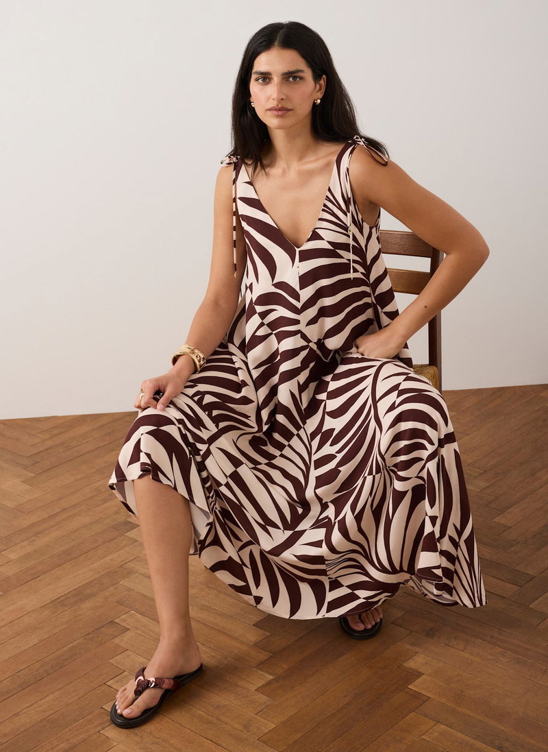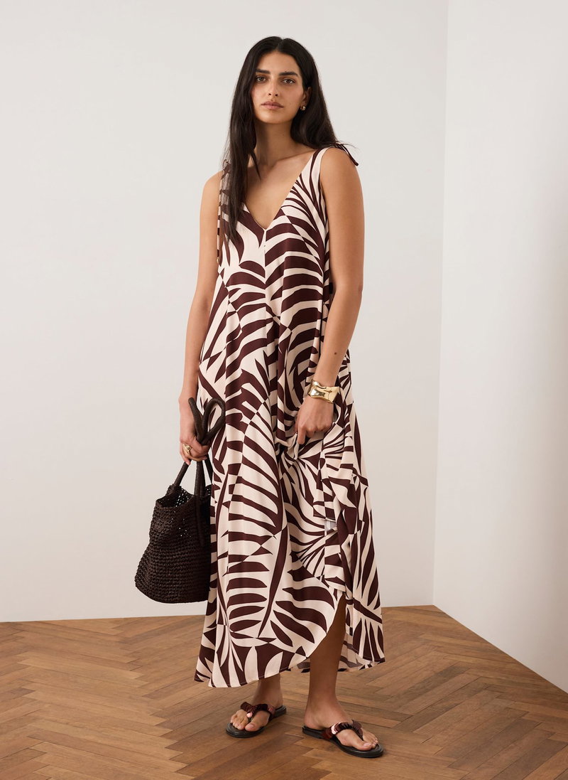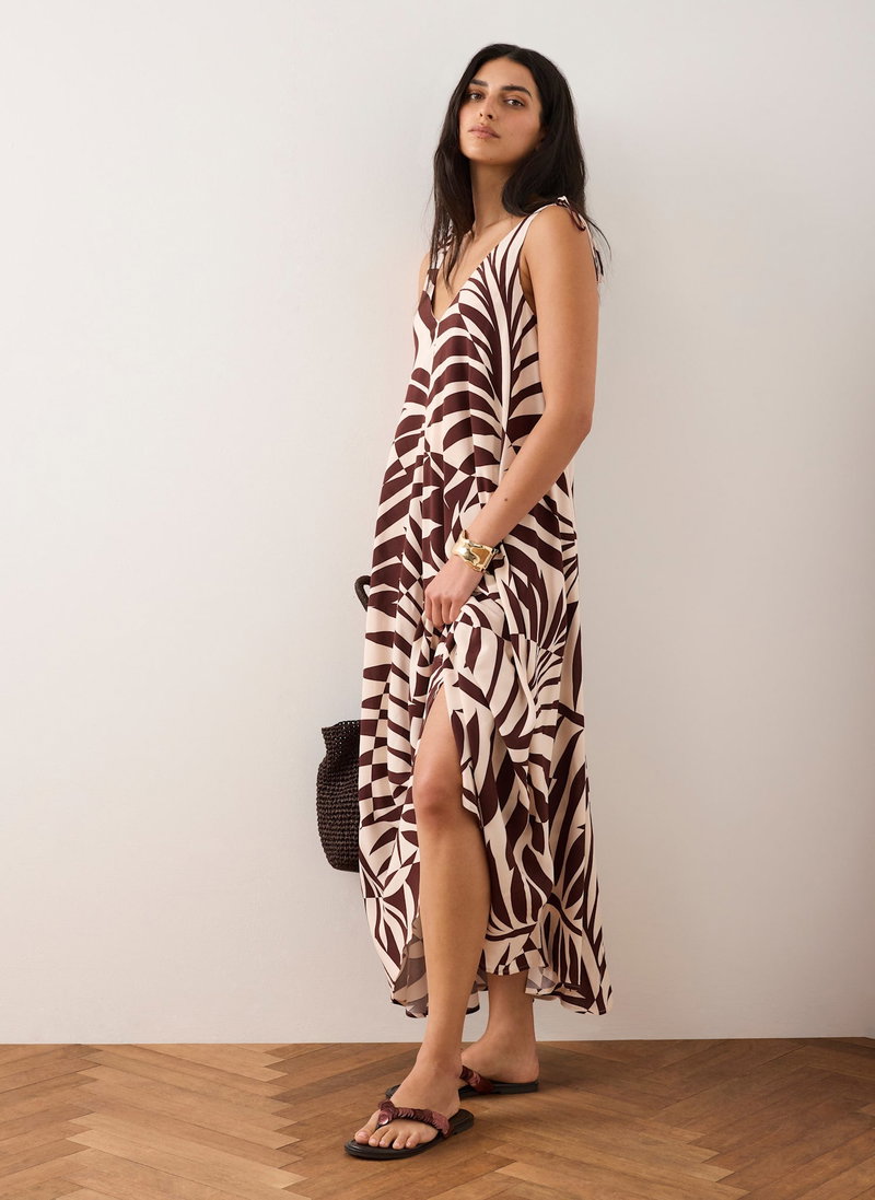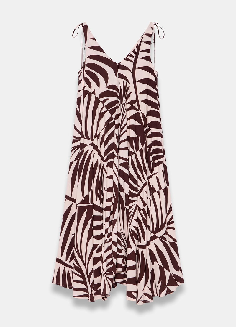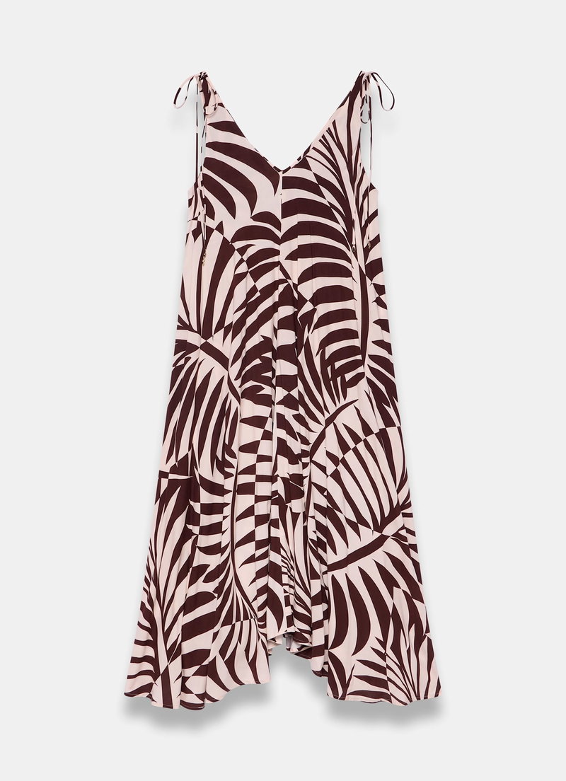Burgundy tone palm print dress in a maxi silhouette featuring a V-neckline, tie straps and handkerchief hemline.