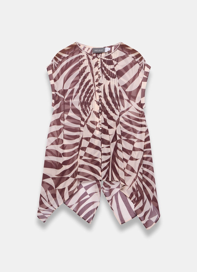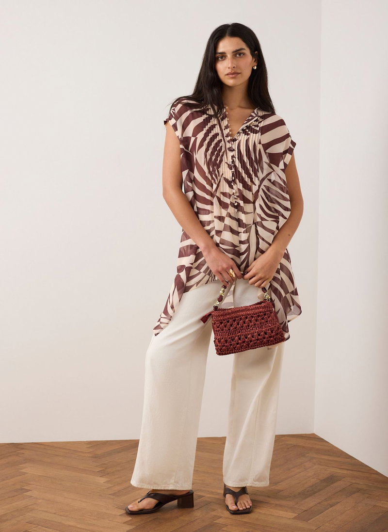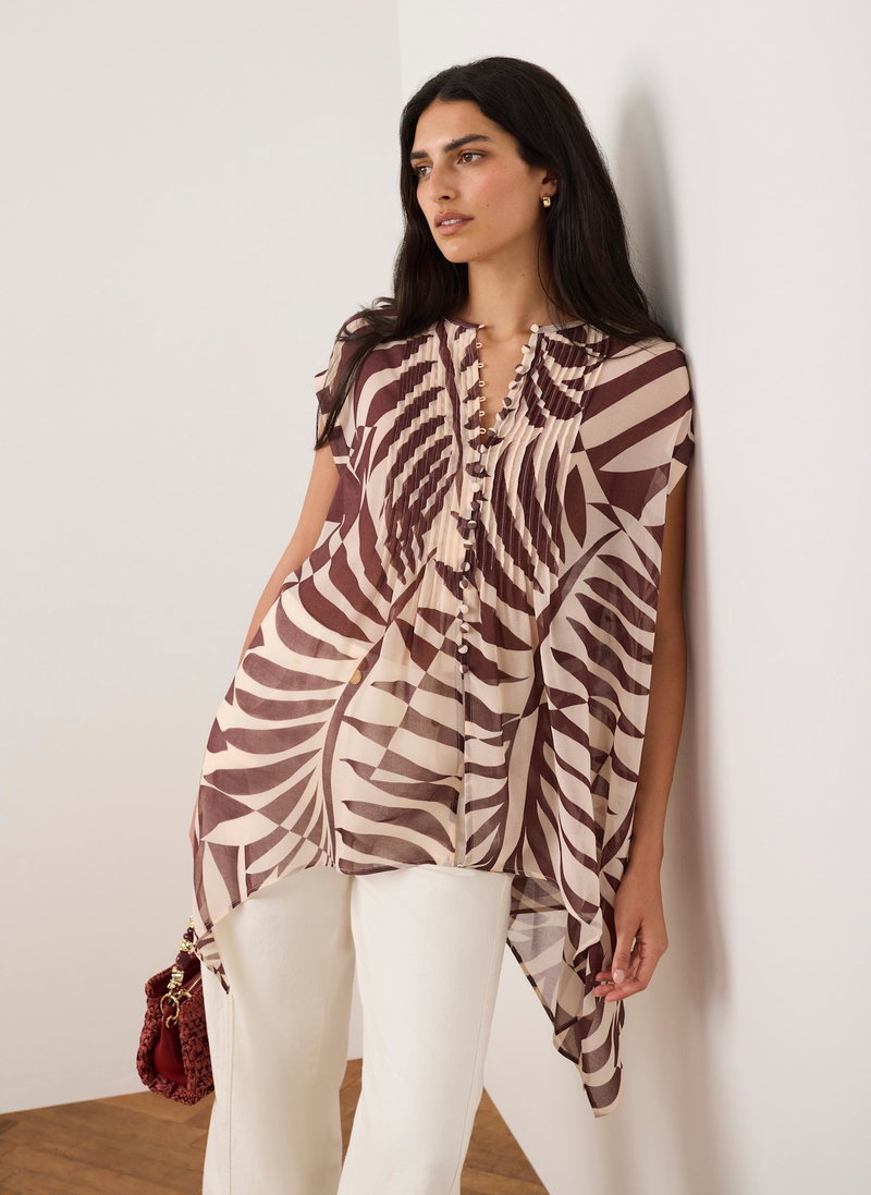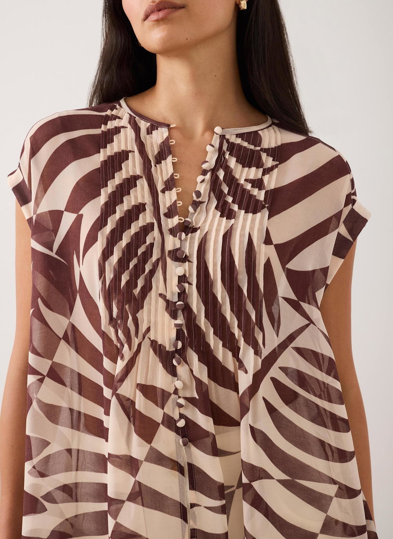 Burgundy tone leaf print top featuring a crew neckline, pin tuck bib, roll back cap sleeves, handkerchief hemline with a button fastening through the front.