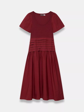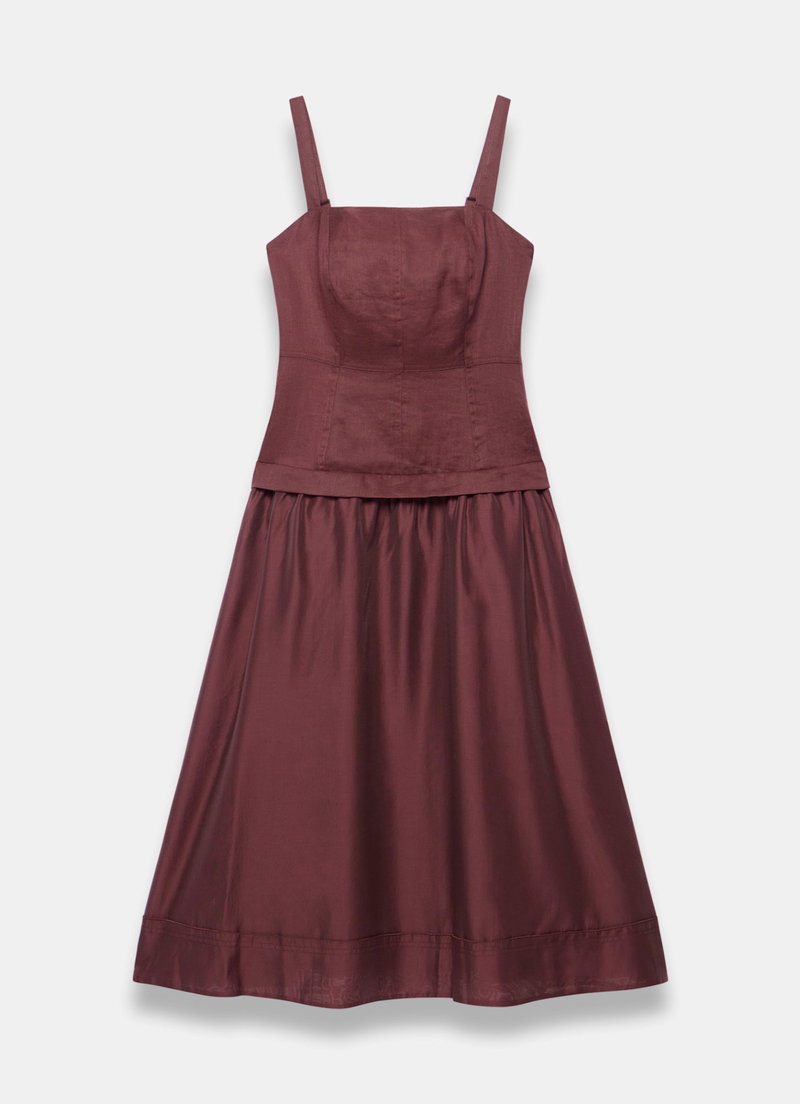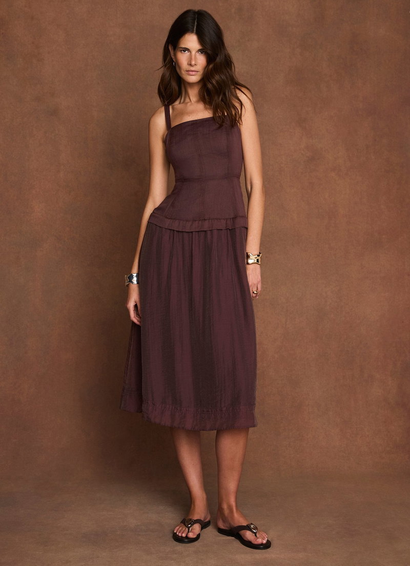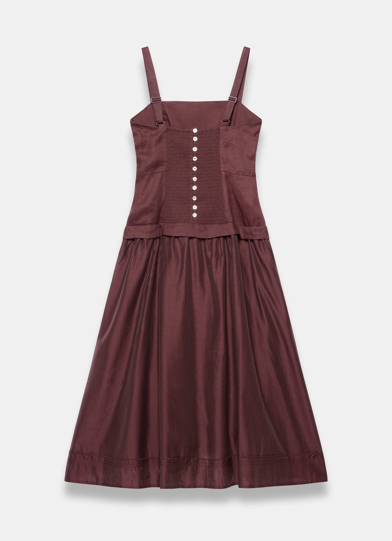 Burgundy tone A-line dress in a midi silhouette featuring a square neckline, thin adjustable straps, layered dropped waist with a shirred and button back detail.