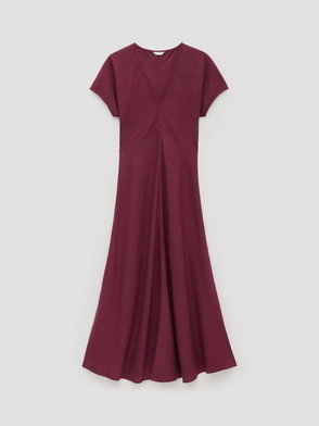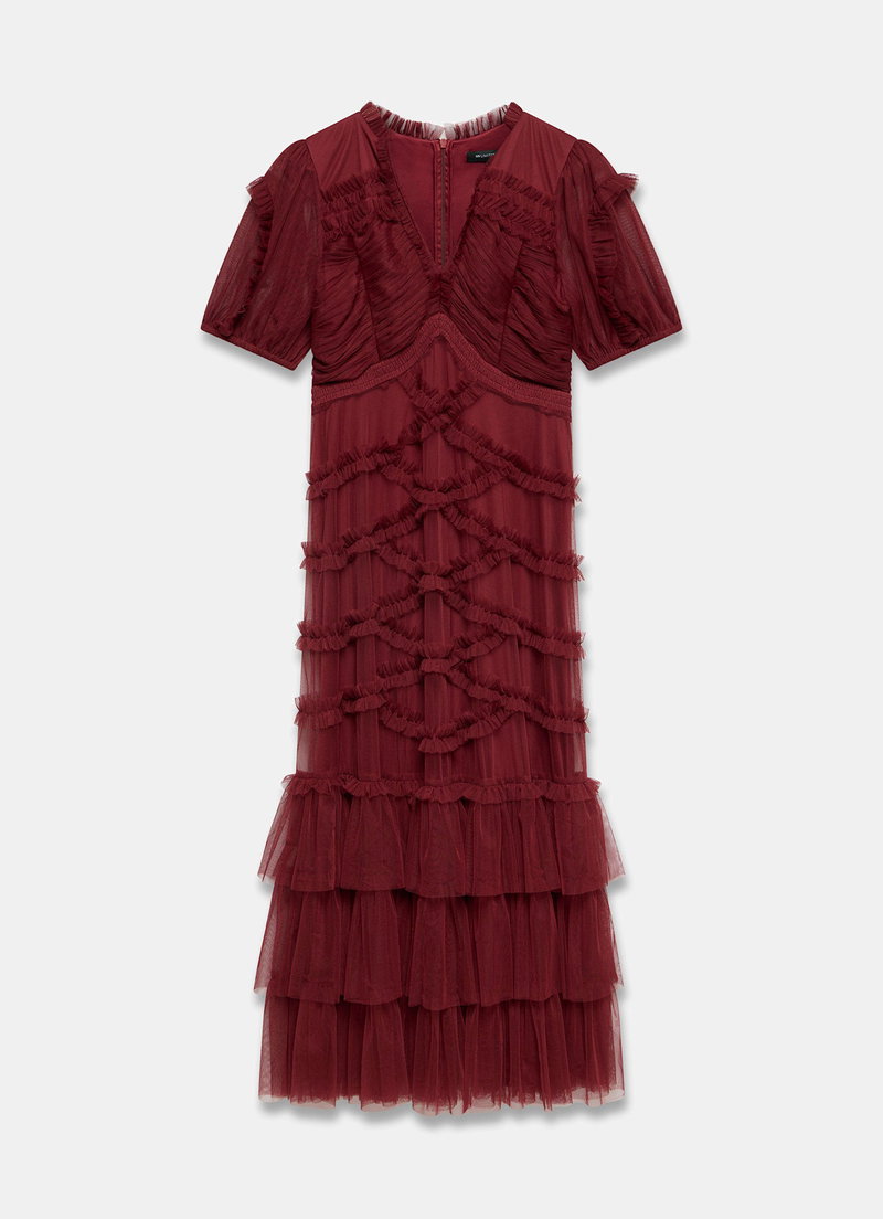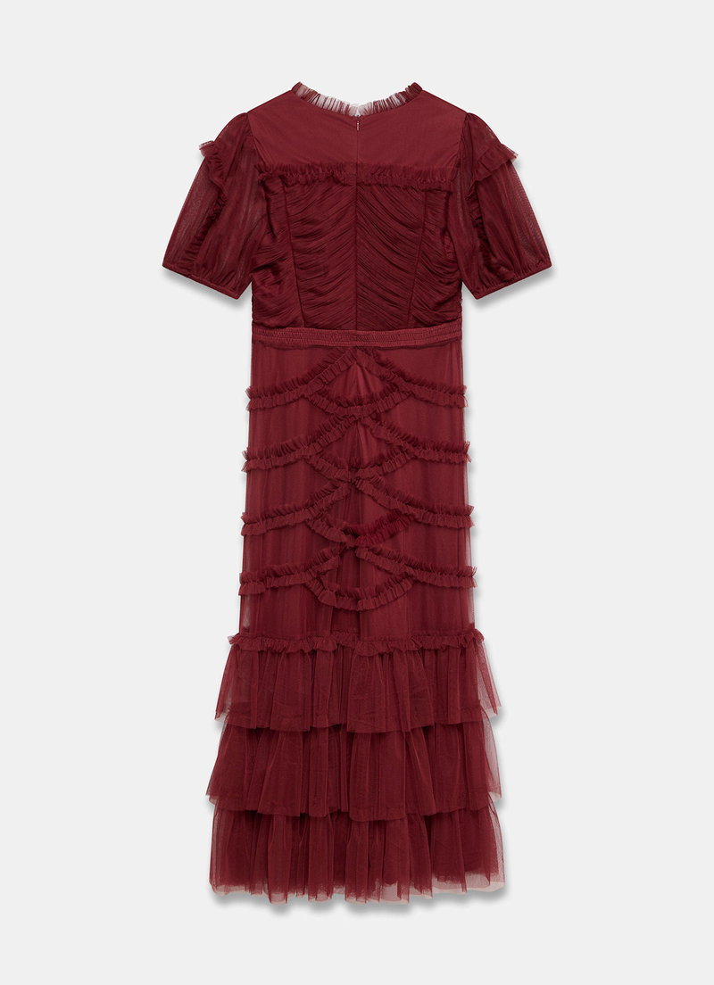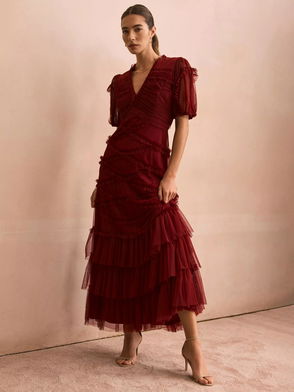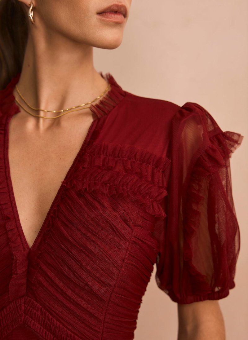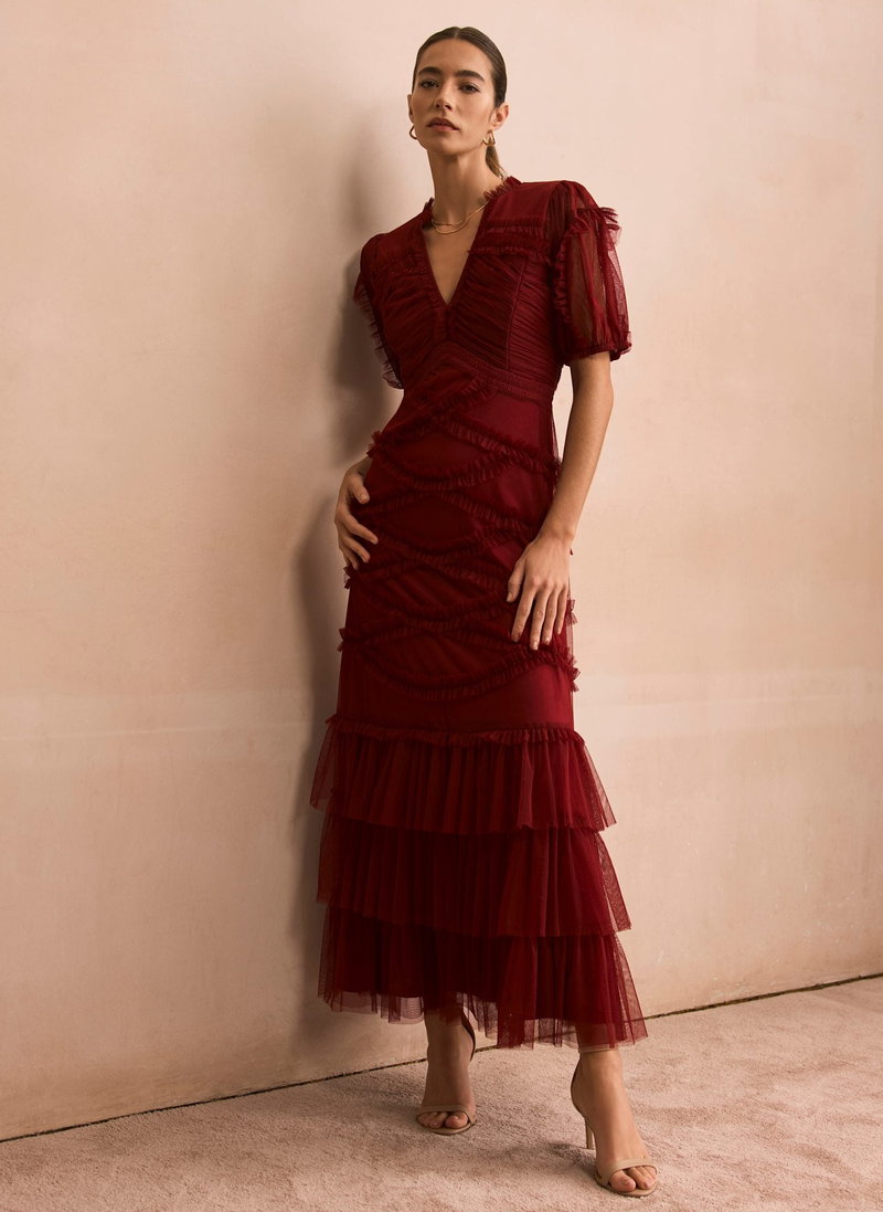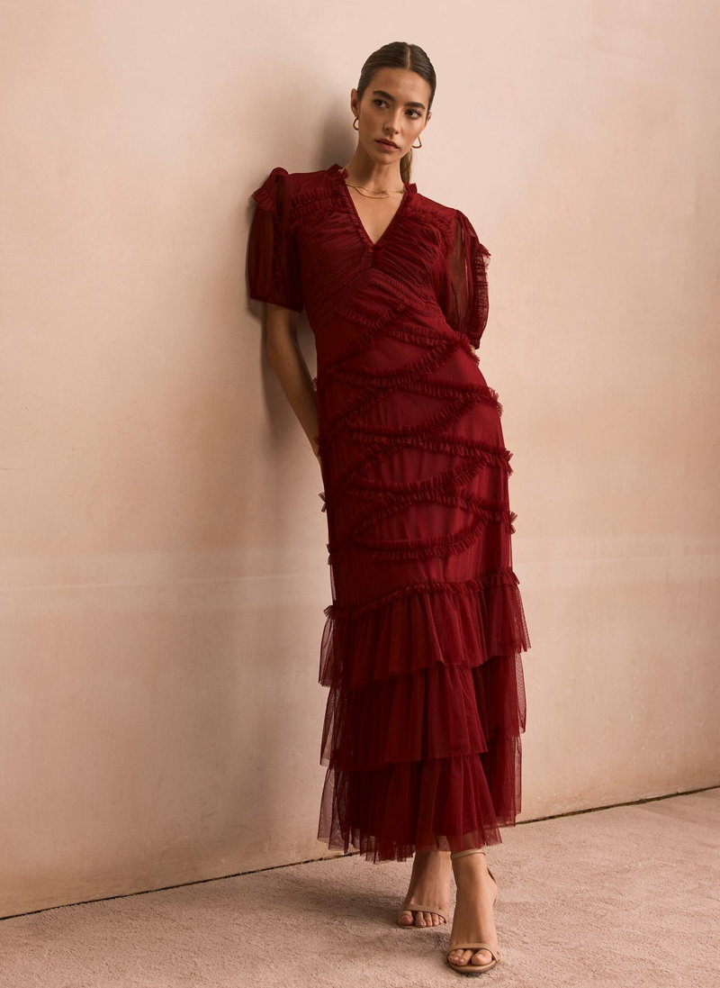 Burgundy tone dress in a maxi silhouette featuring a V-neckline, short sleeves, pin-tuck detailing, ruffle trim, tiered hemline with a zip fastening through the back.