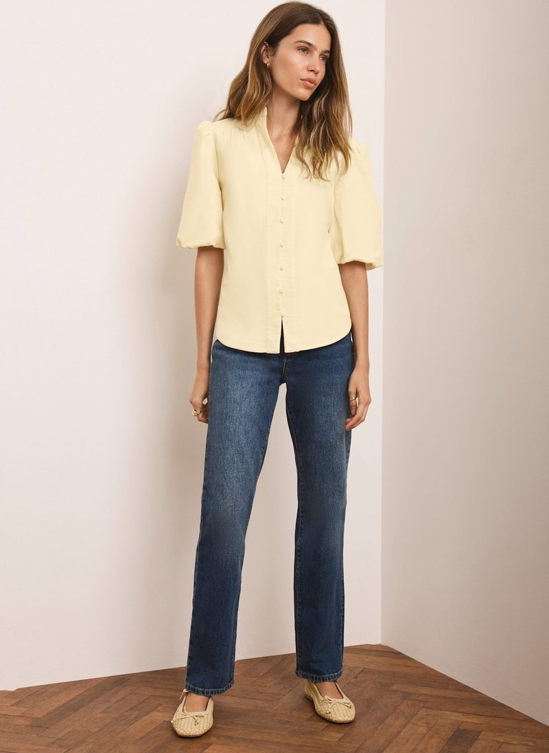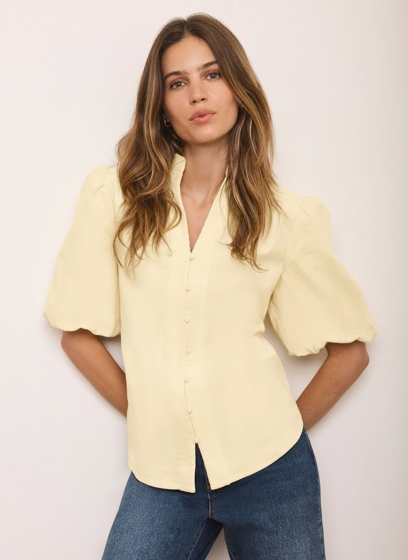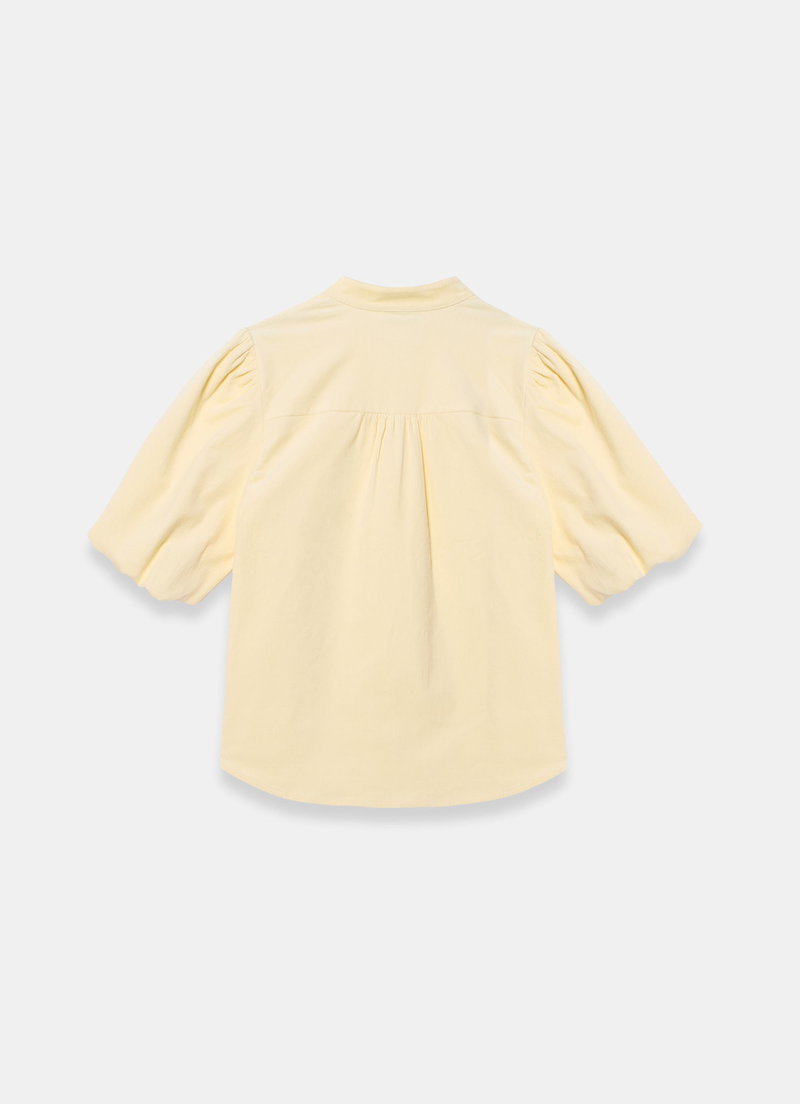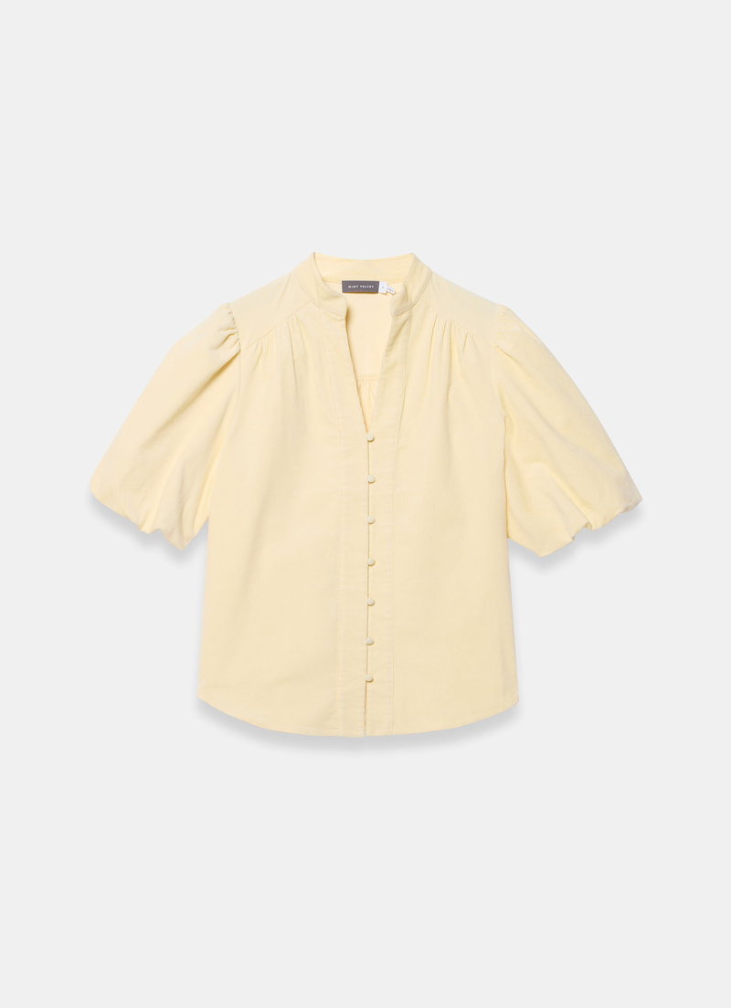 Pale yellow corduroy blouse featuring a V-neckline, short puff sleeves, curved hemline with a button fastening through the front.