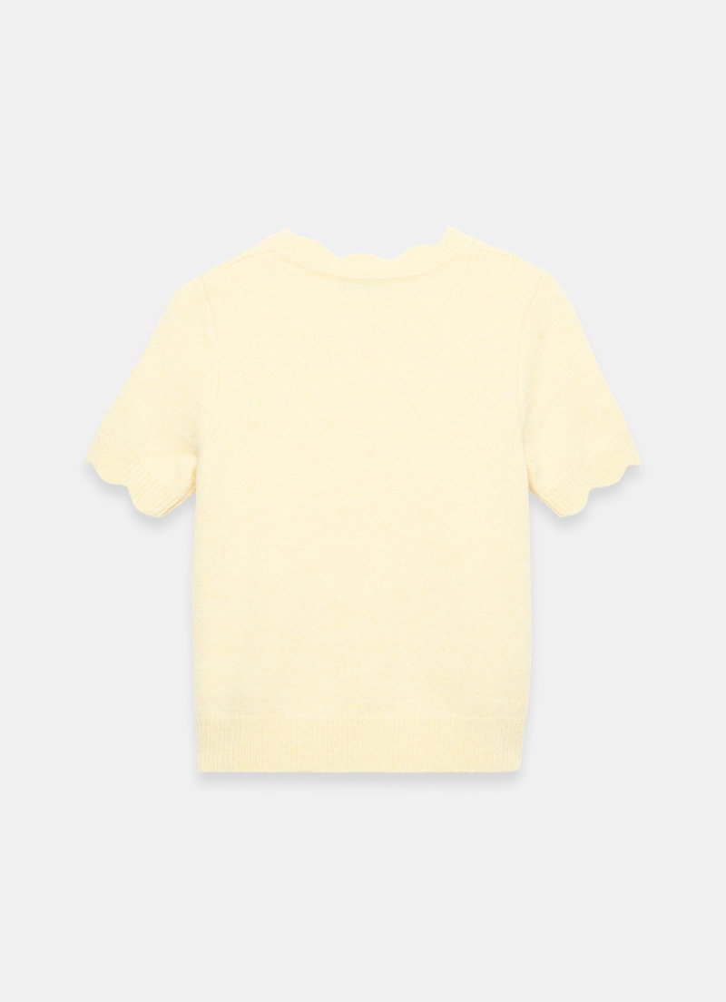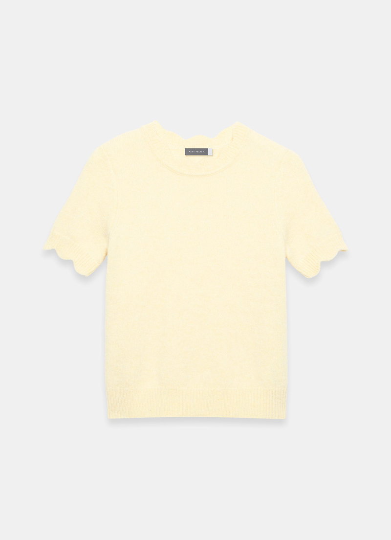 Pale yellow scallop trim top featuring a crew neckline and short scallop trim sleeves.