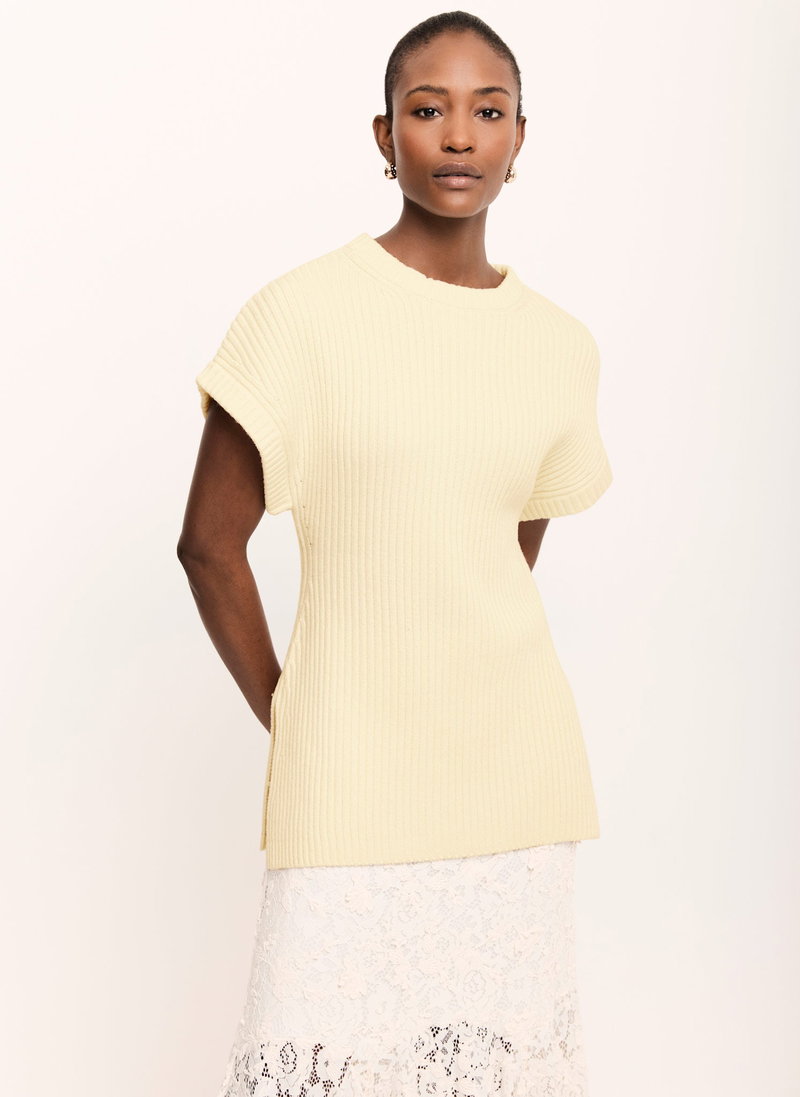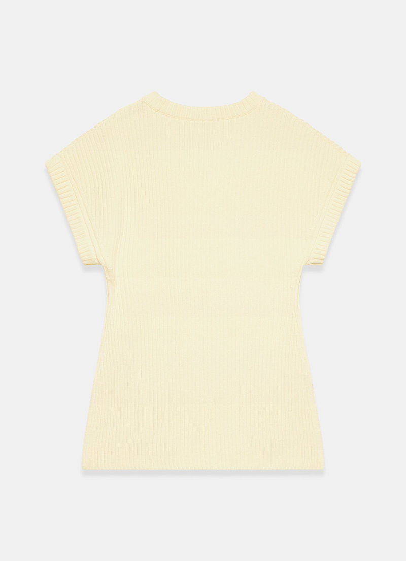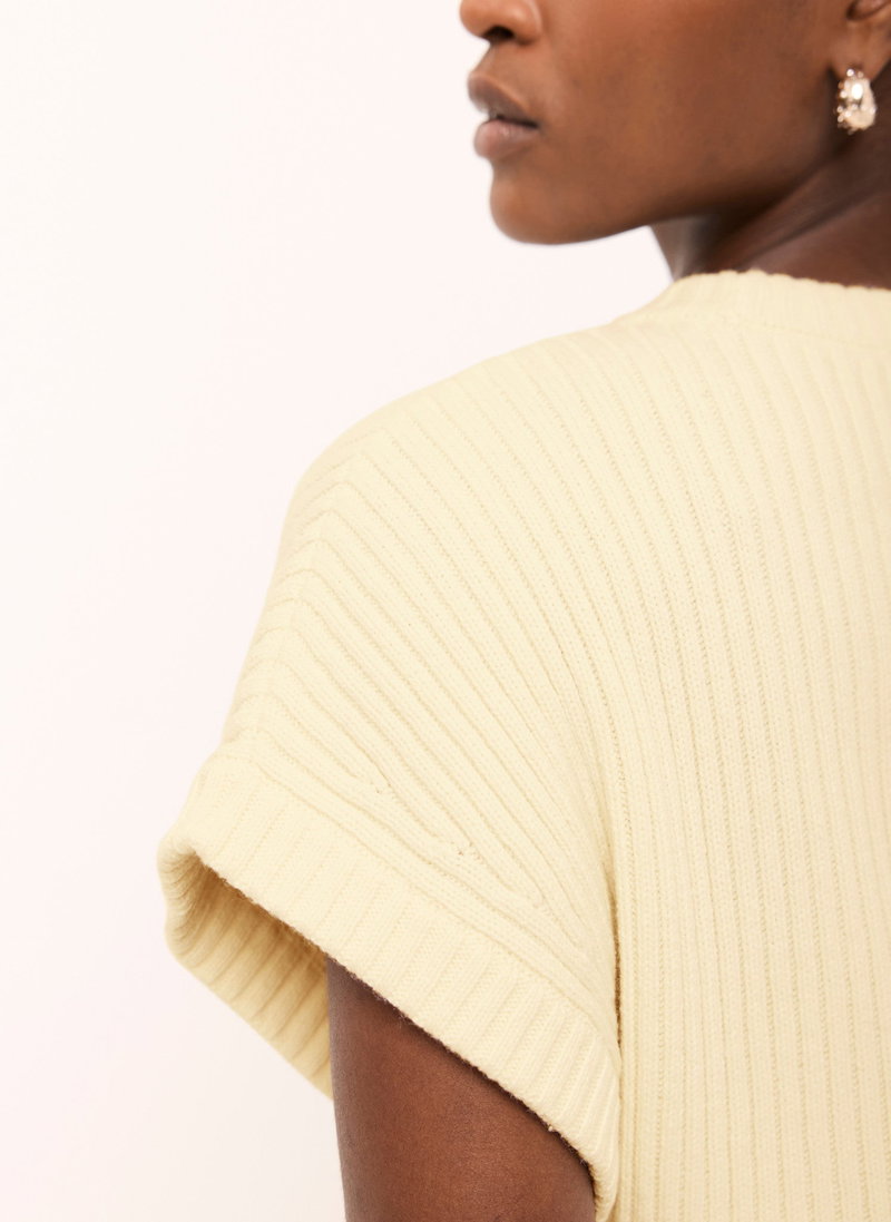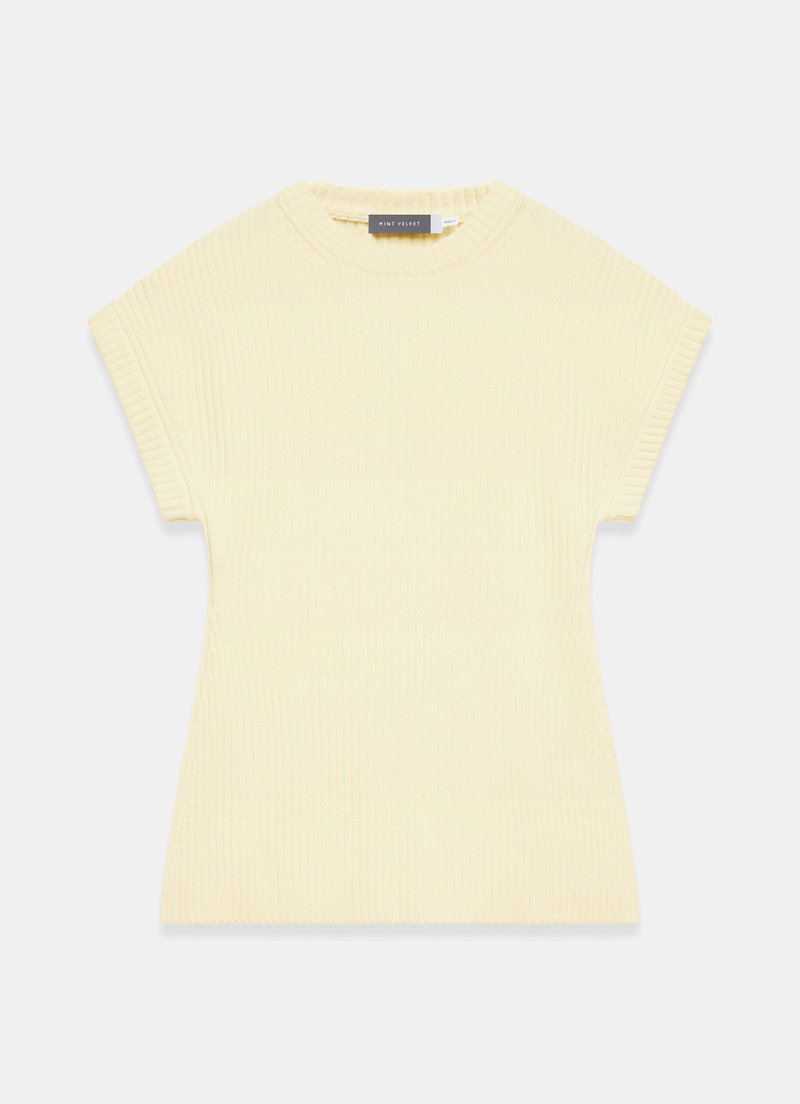 Pale yellow ribbed longline top featuring a crew neckline, short sleeves and side split hemline.