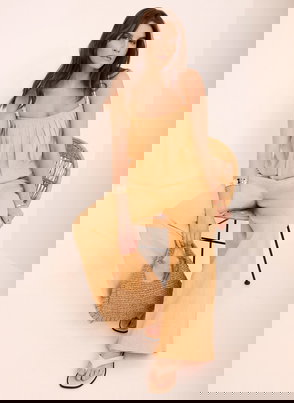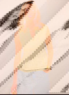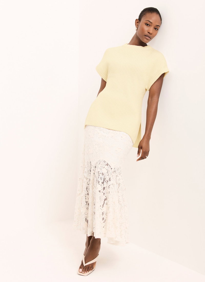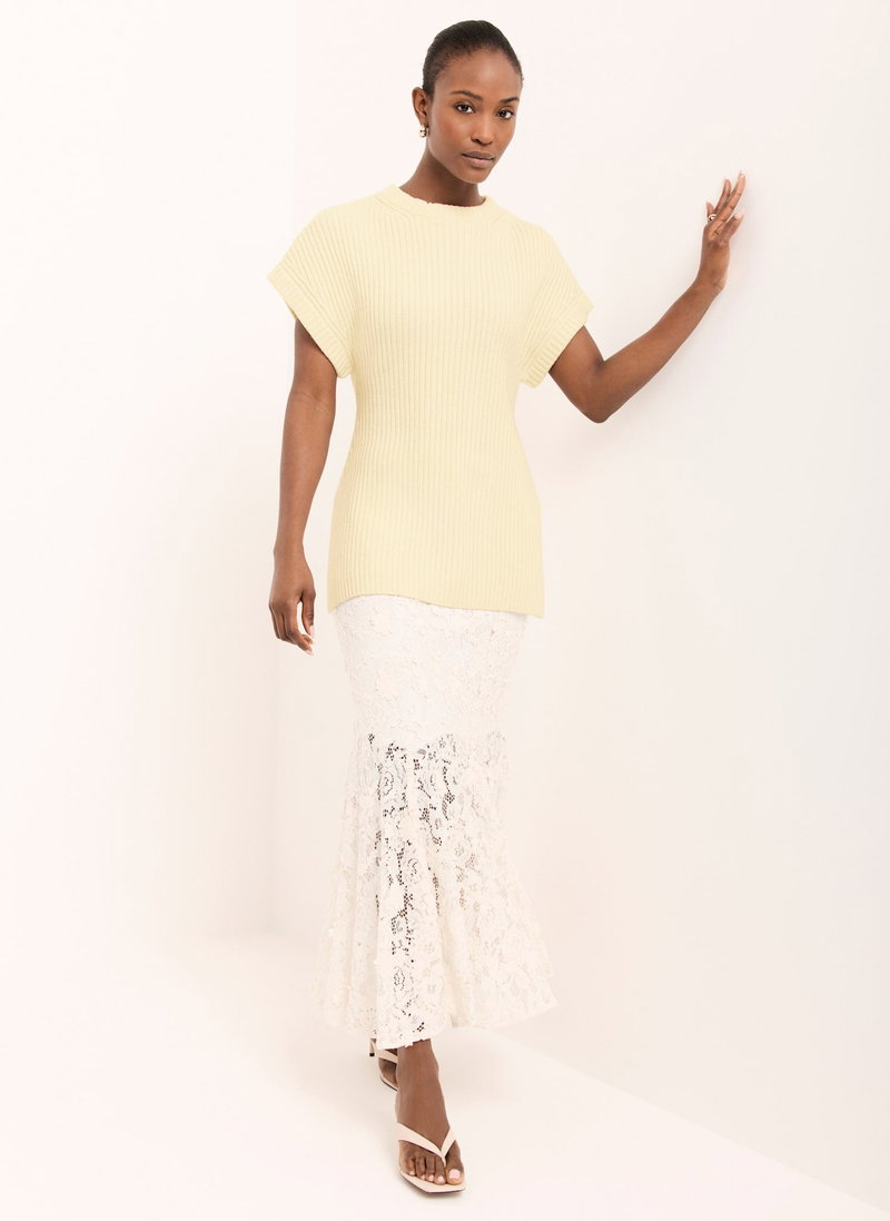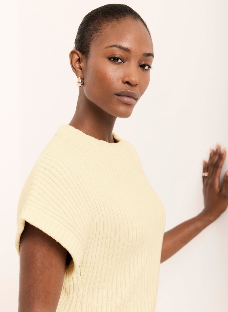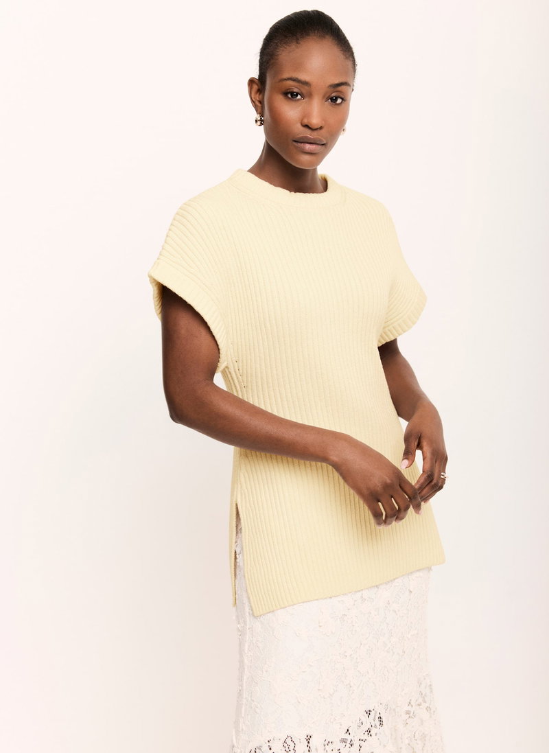 Pale yellow ribbed longline top featuring a crew neckline, short sleeves and side split hemline.