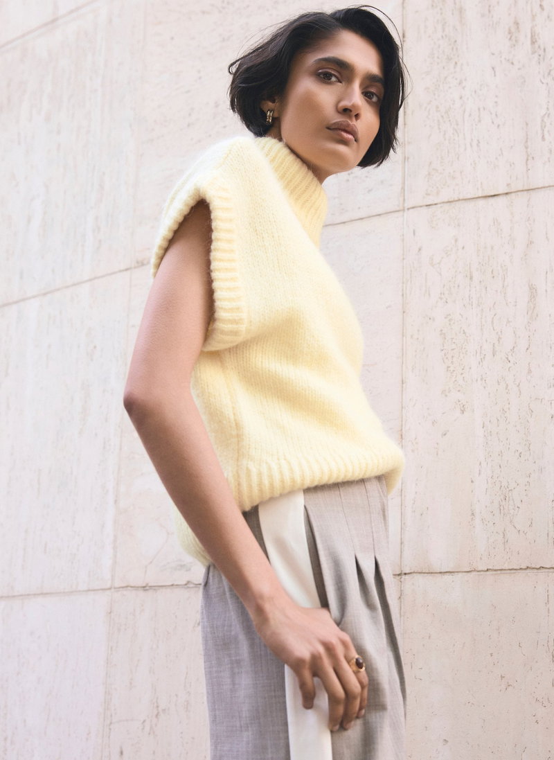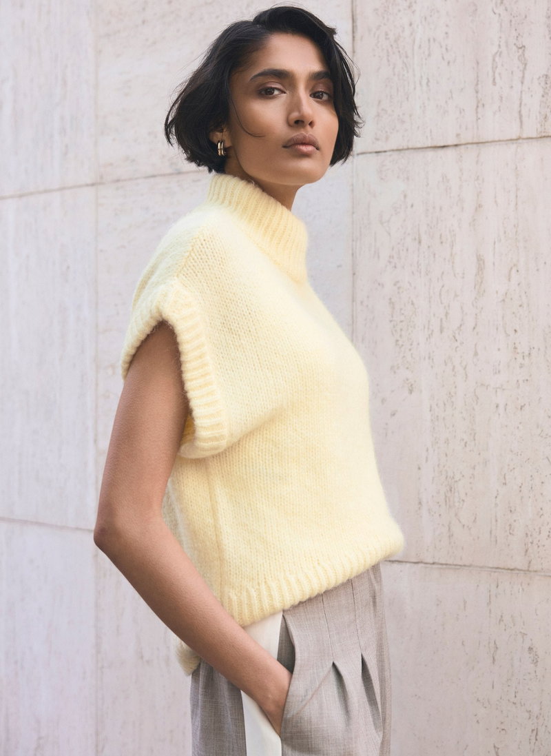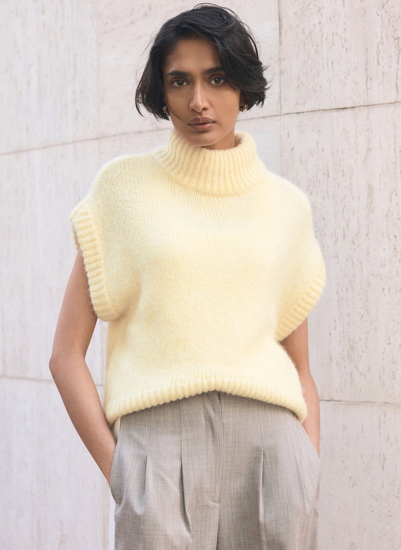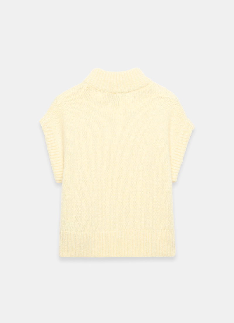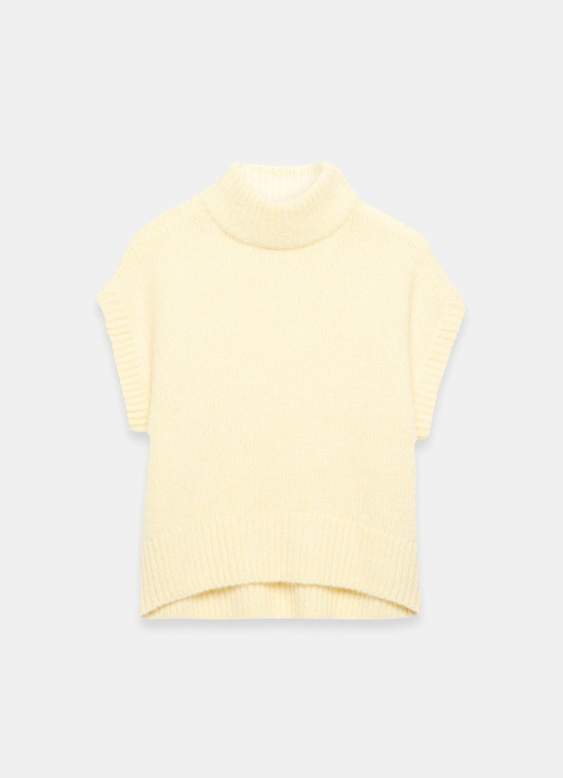 Pale yellow knit sleeveless top featuring a high neckline, ribbed trim and curved hemline.
