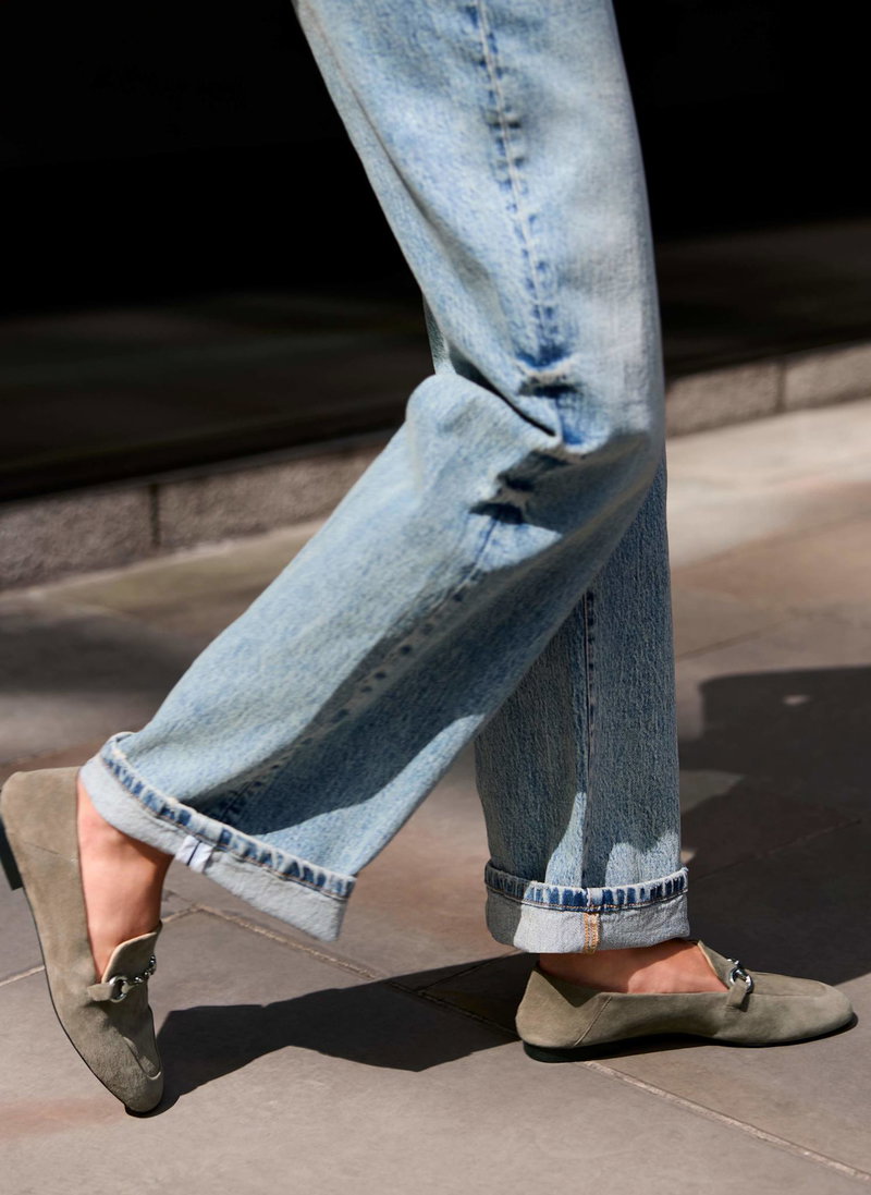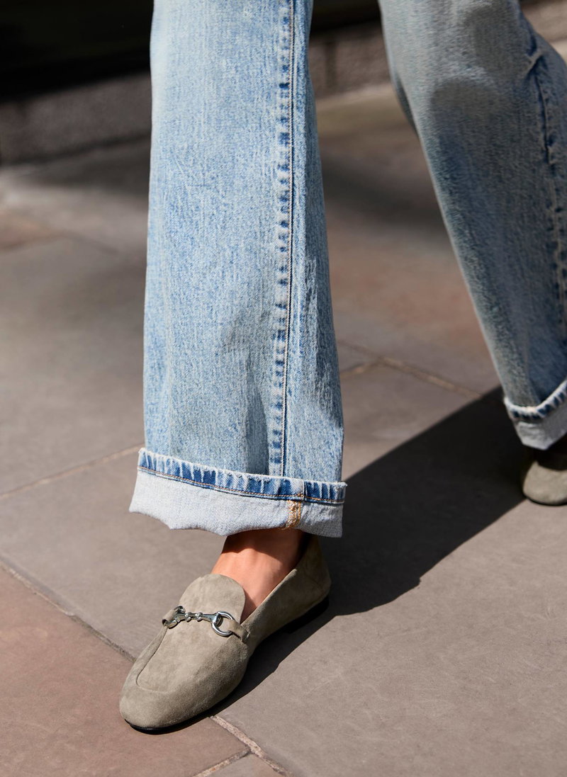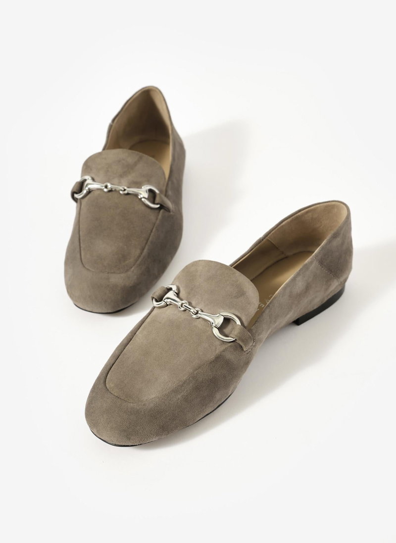 Neutral suede loafers featuring an almond shaped toe, flat sole and silver-tone snaffle detail.