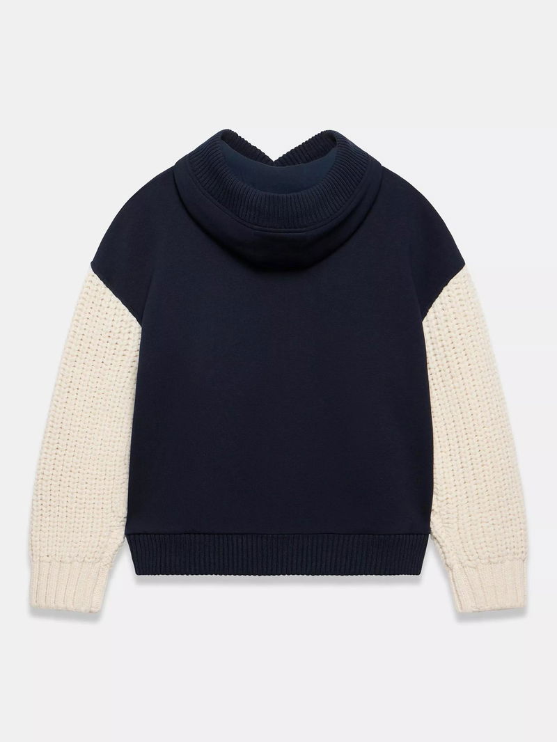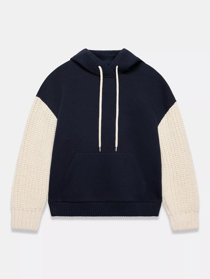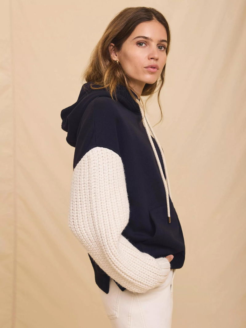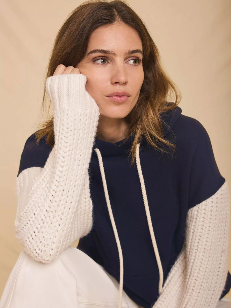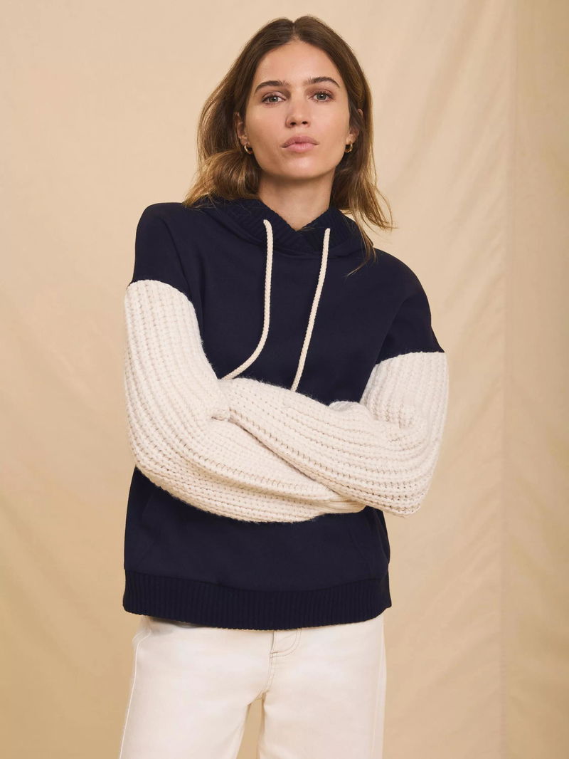 A jumper featuring a hooded neckline, contrast knit sleeves, pouch pocket with a drawstring fastening through the front.
