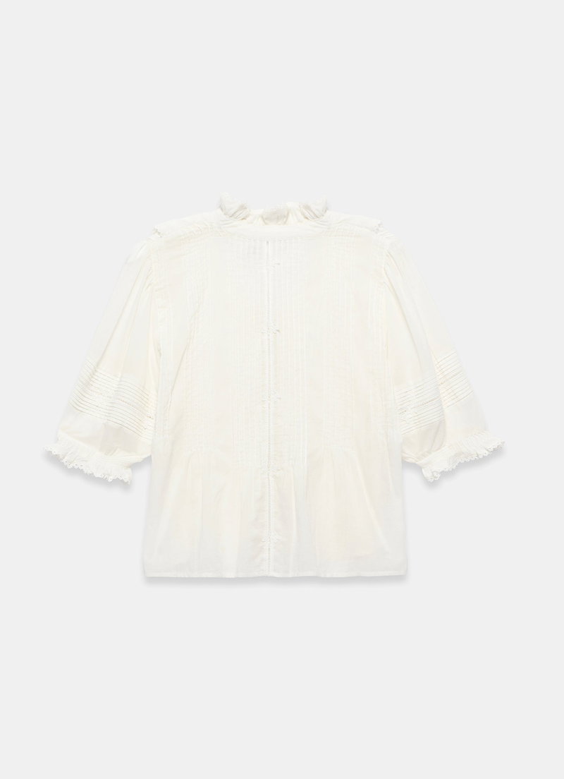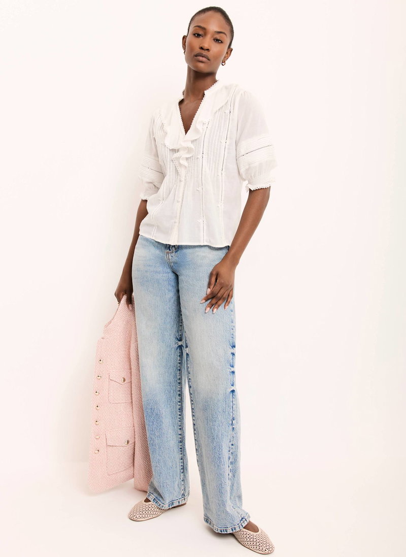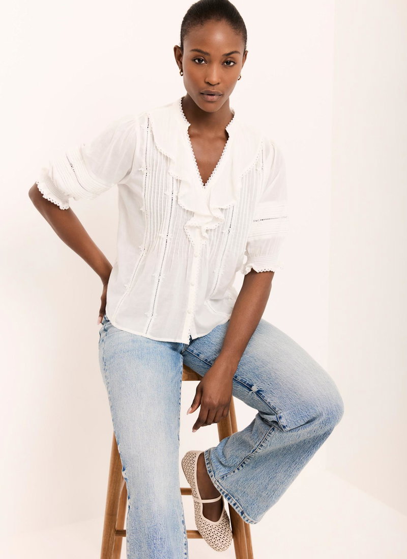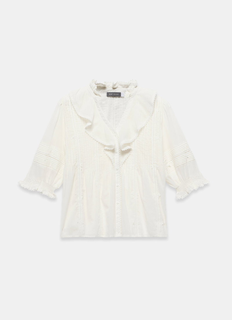 Cream tone blouse featuring a ruffle trim V-neckline, short sleeves, pin tuck detailing, crochet trim with a button fastening through the front.
