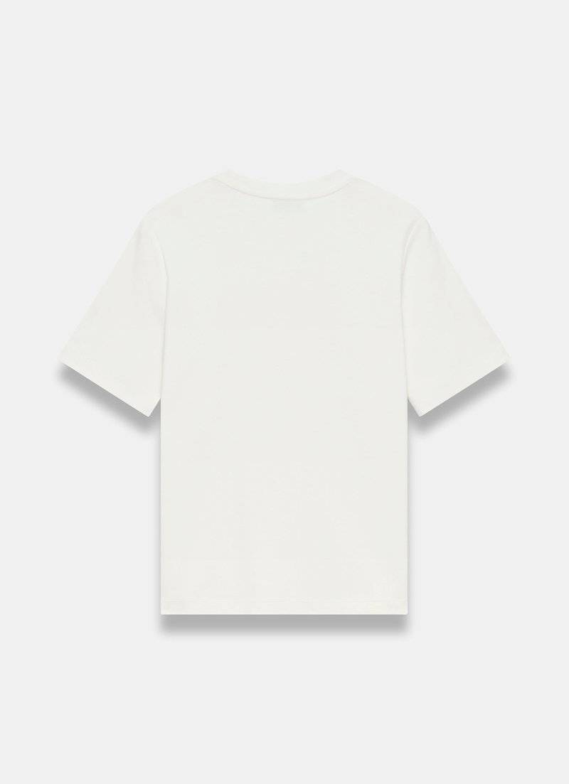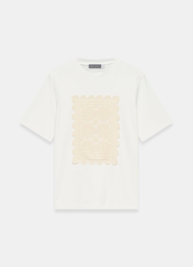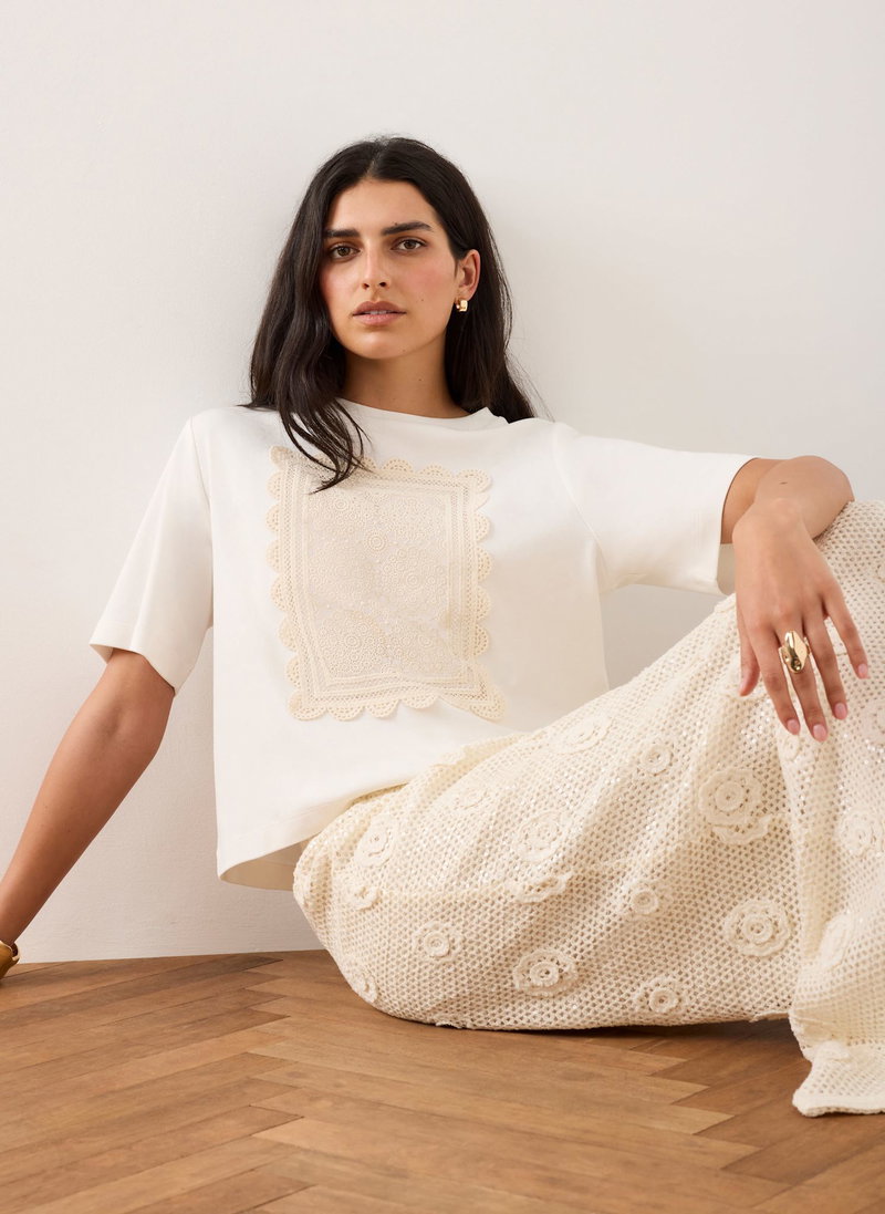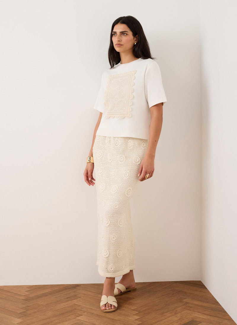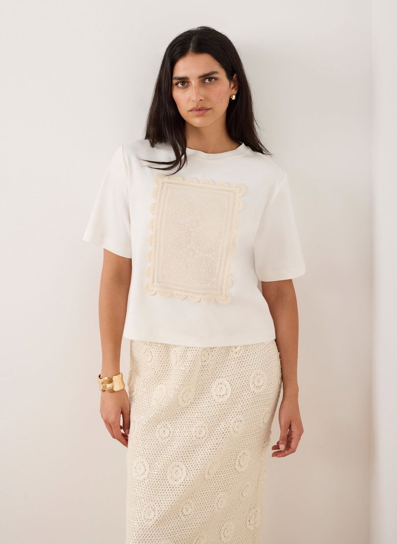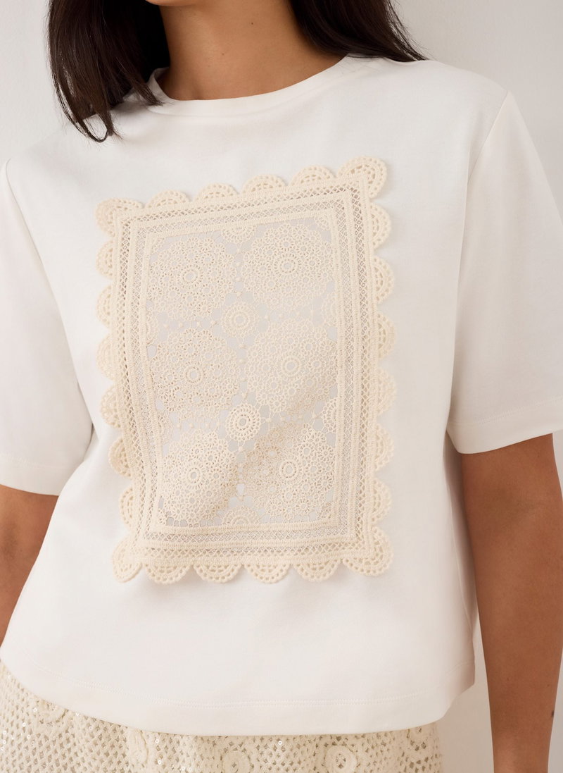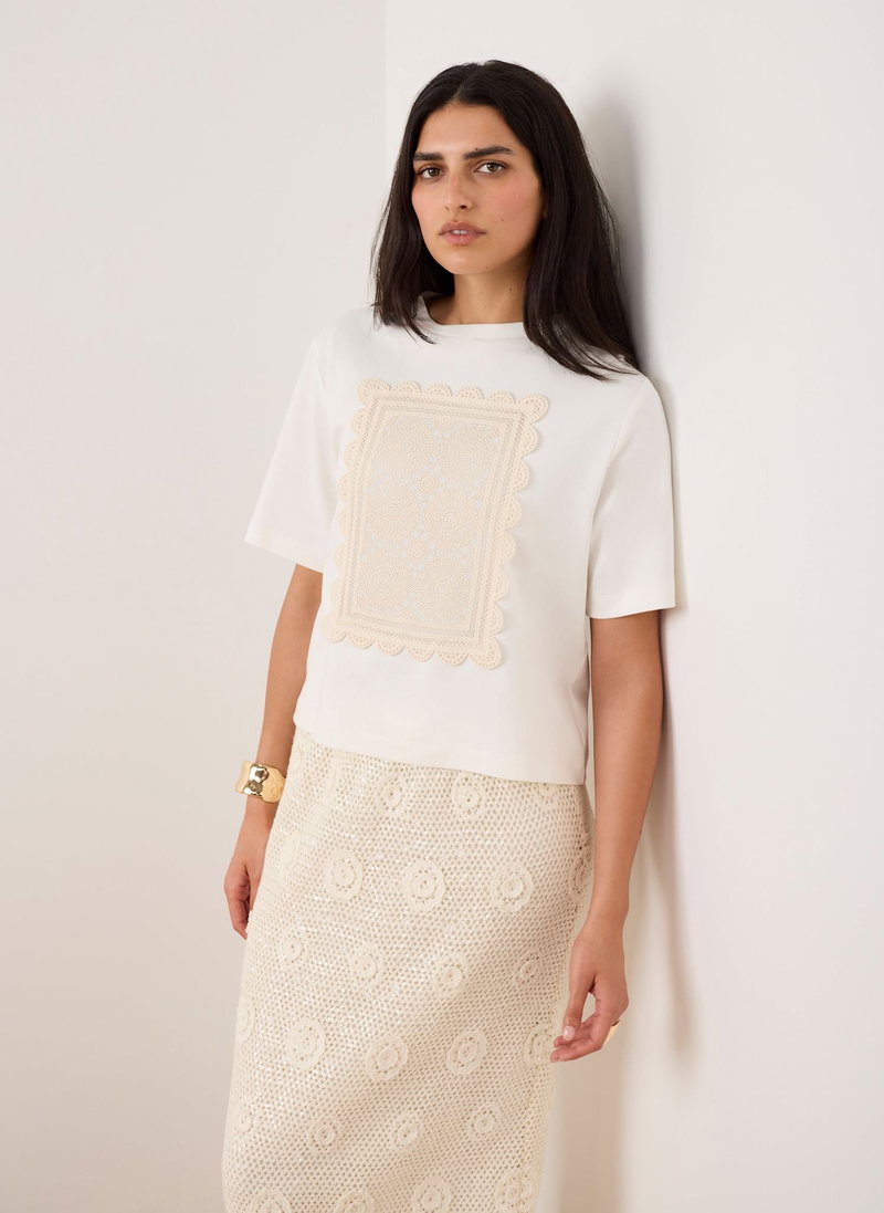 White T-Shirt featuring a crew neckline, short sleeves and a cream crochet panel detail on the front.