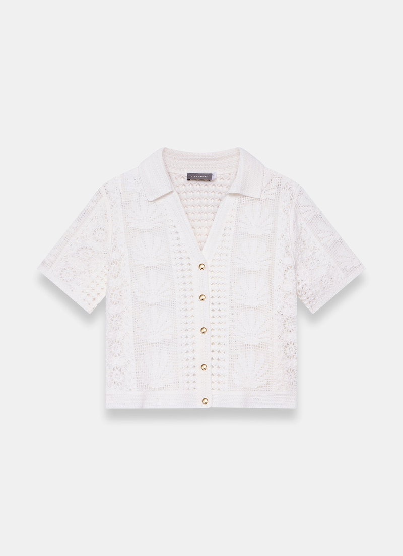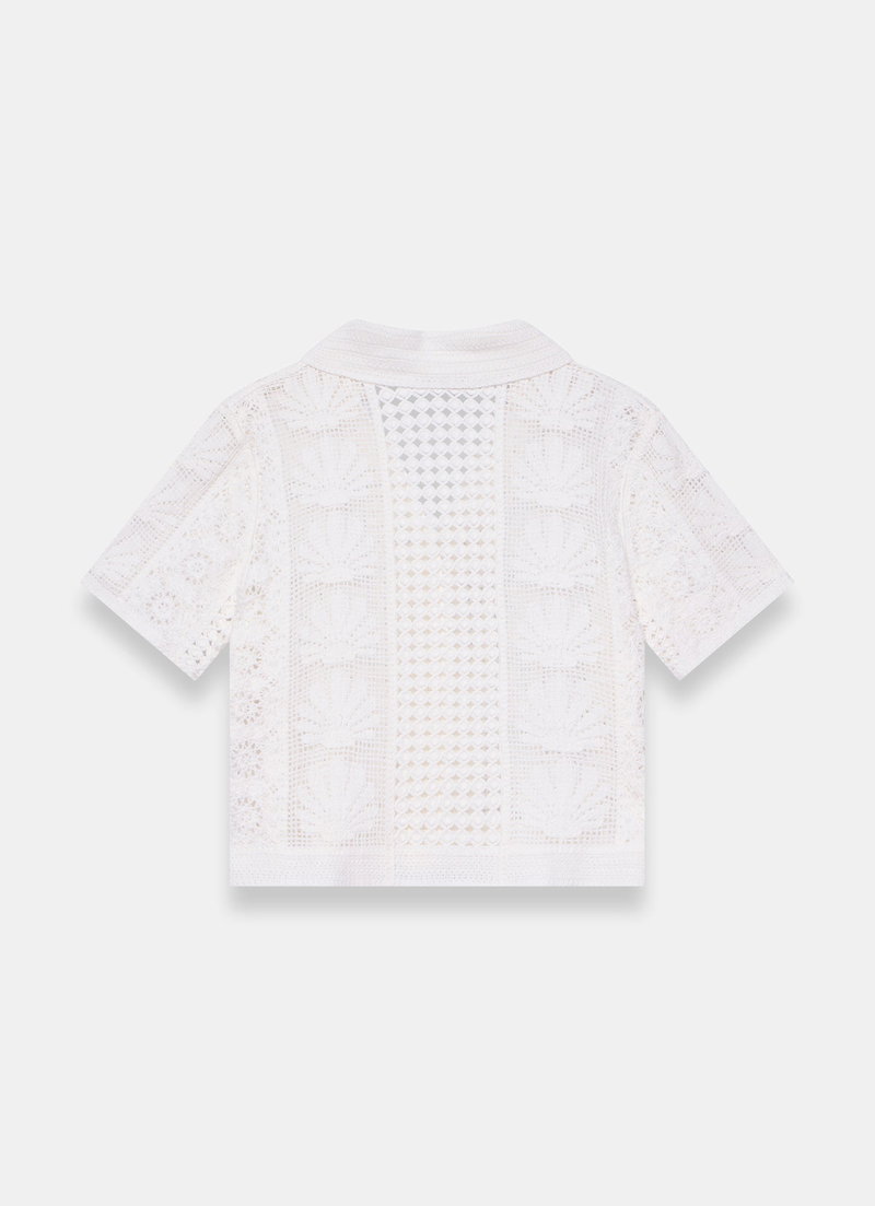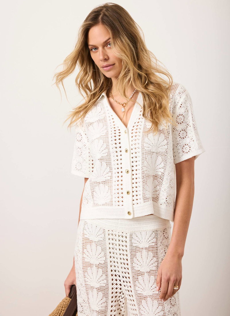 Cream crochet shell shirt featuring a classic collar, short sleeves, shell crochet detailing and a gold-tone shell button fastening through the front.