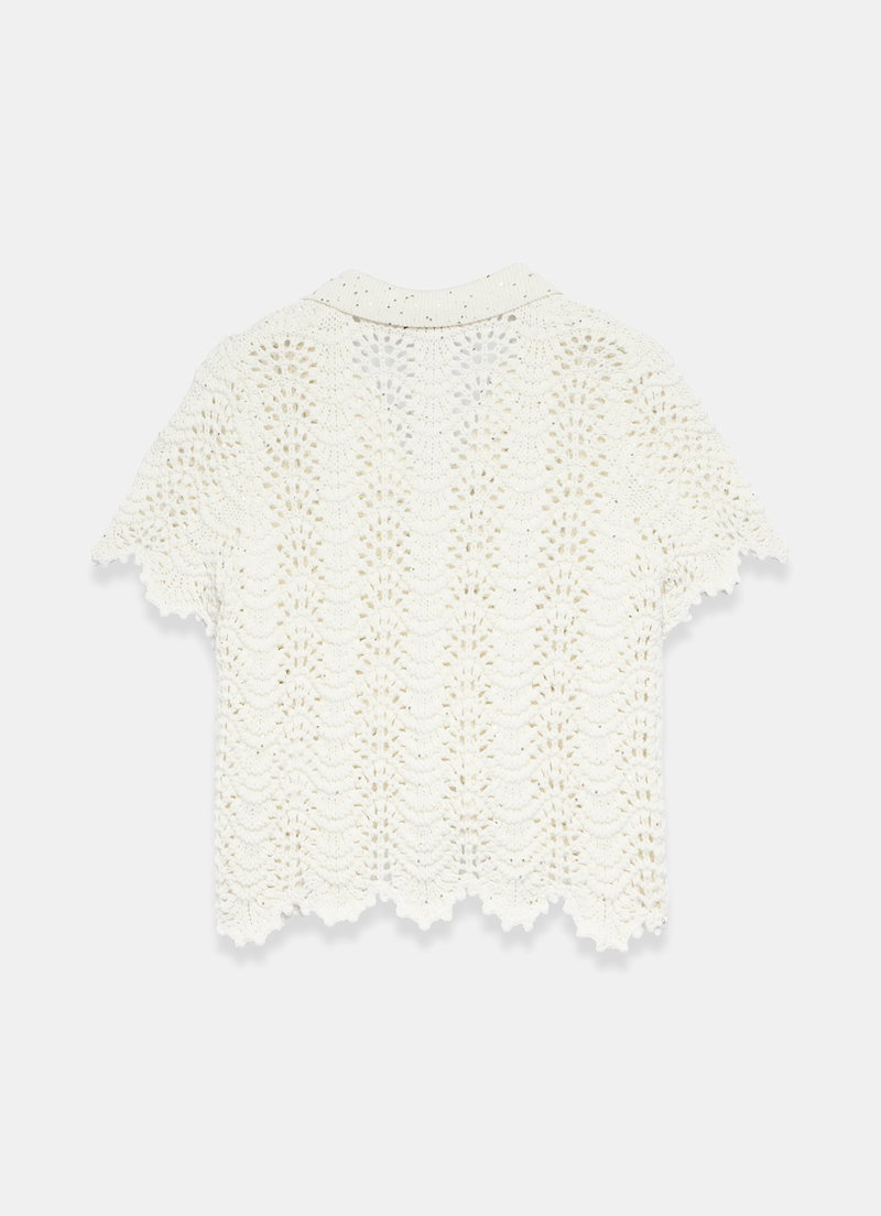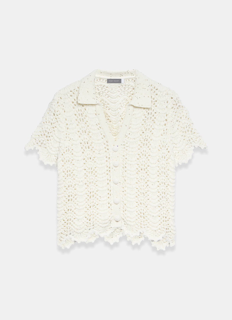 Cream tone embellished top featuring a classic collar, V-neckline, short sleeves, scallop hemline with a button fastening through the front.