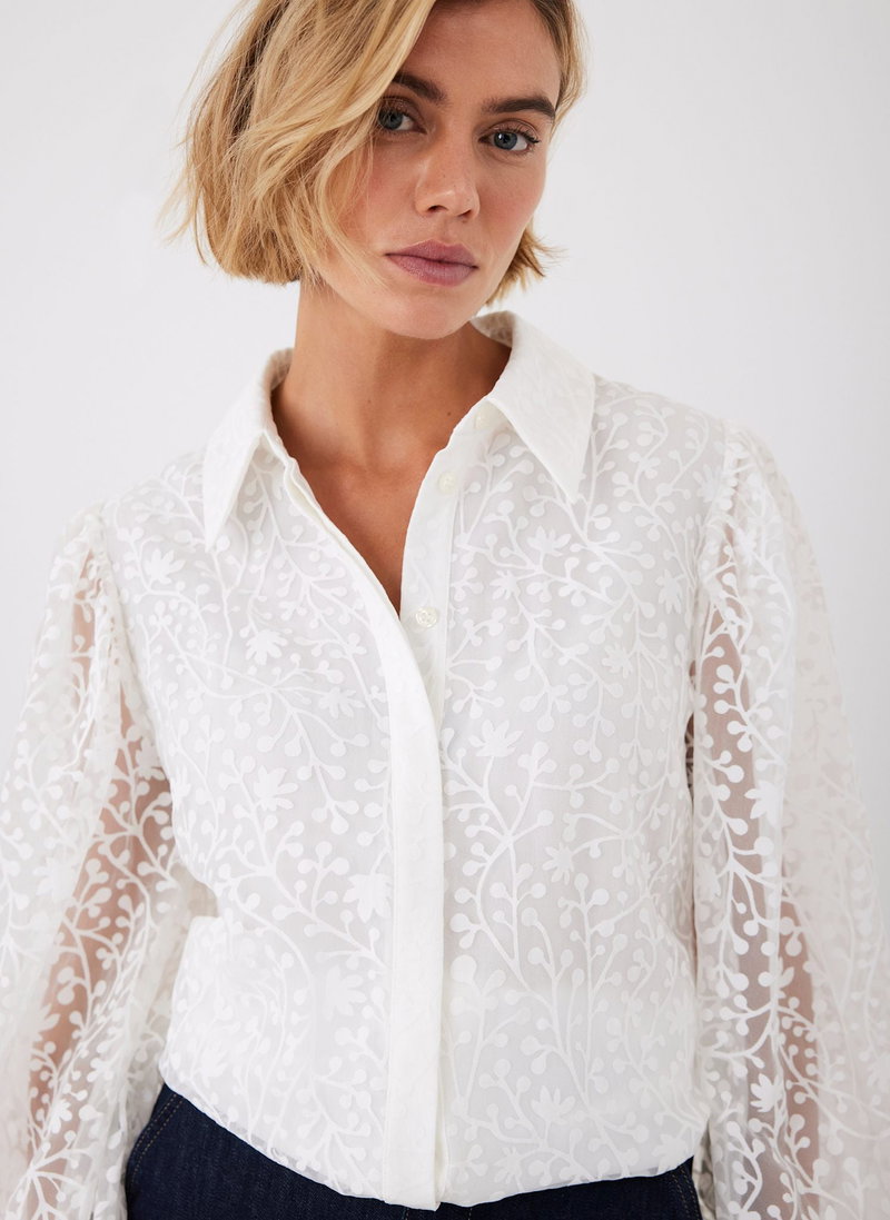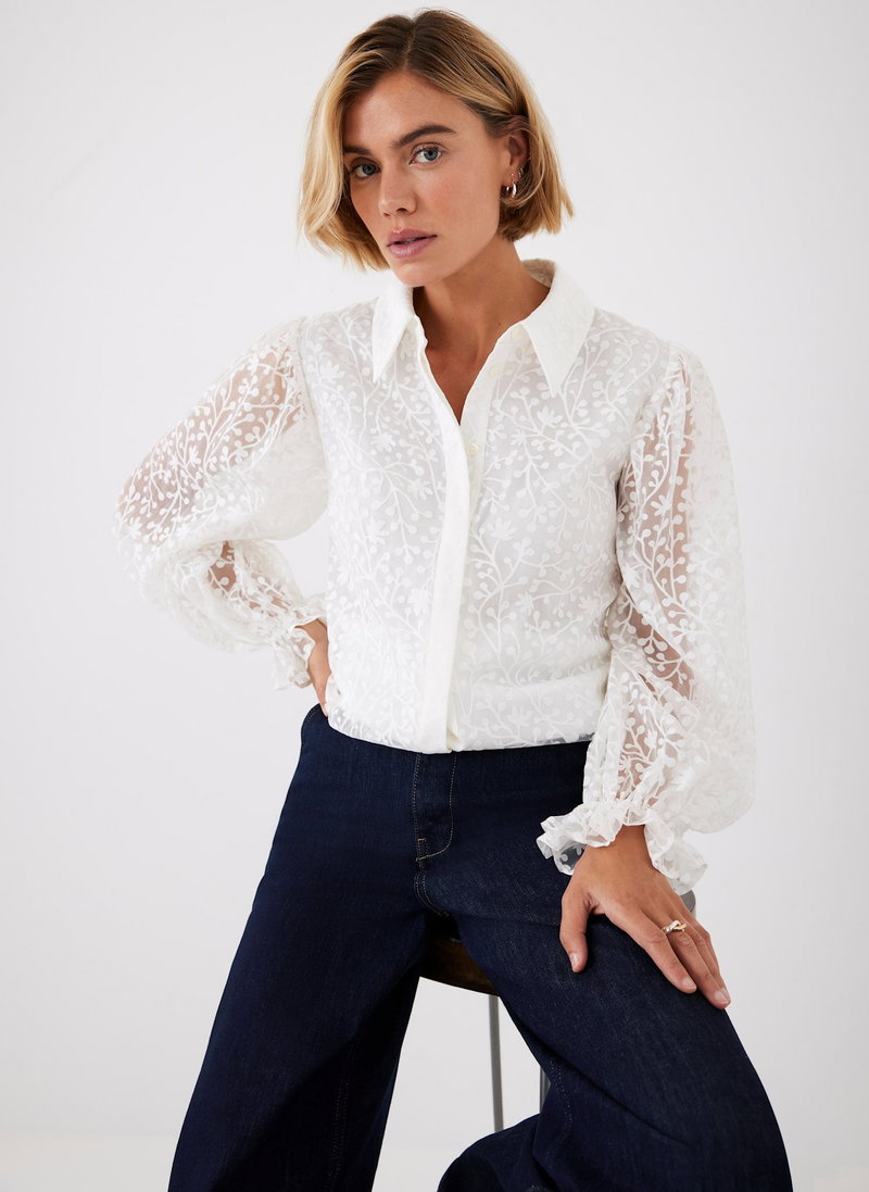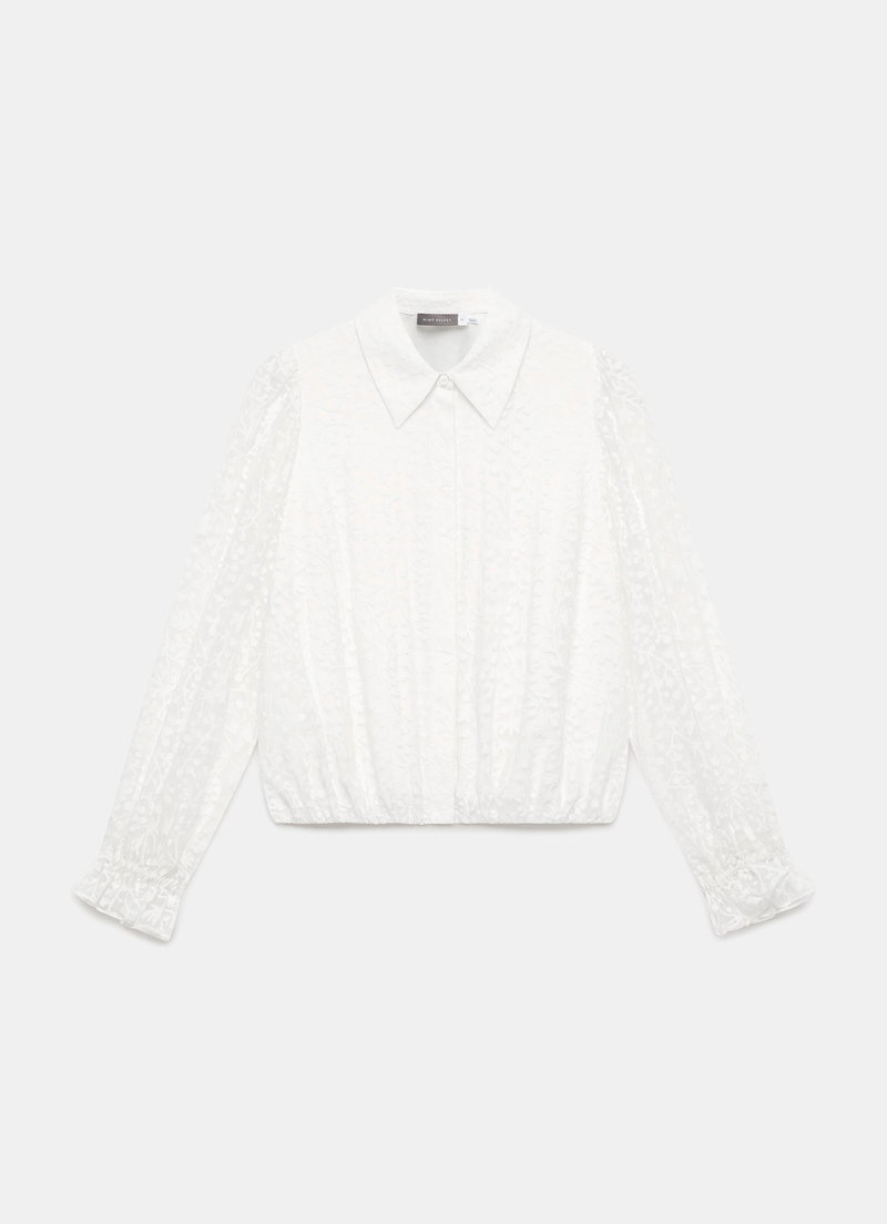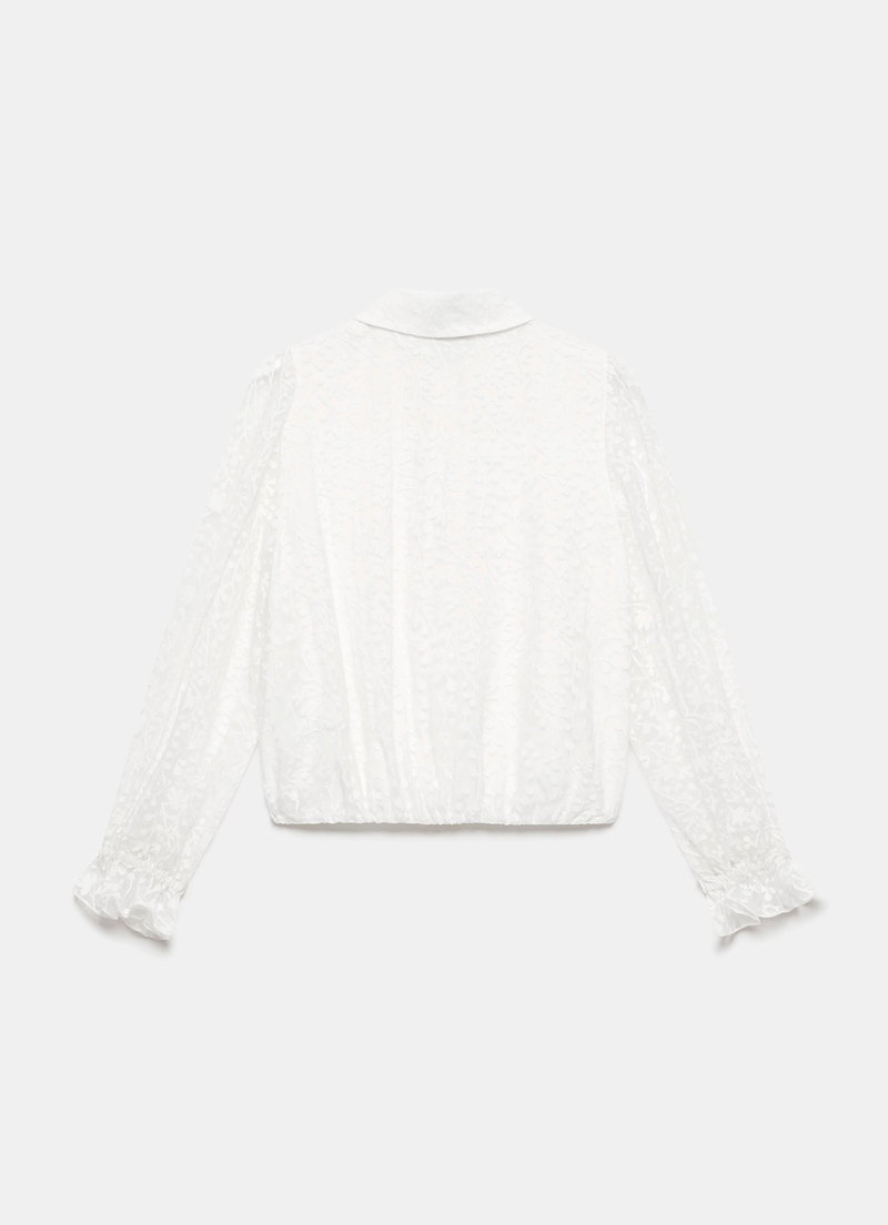 Cream jacquard shirt featuring a classic collar, elasticated fluted cuffs, elasticated waistband with a concealed button fastening through the front.