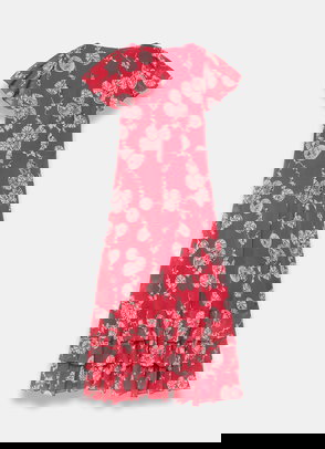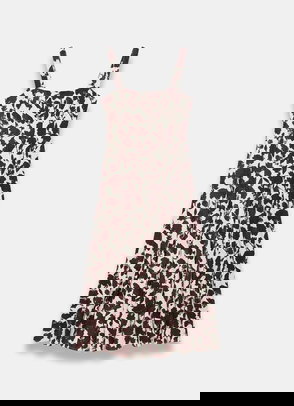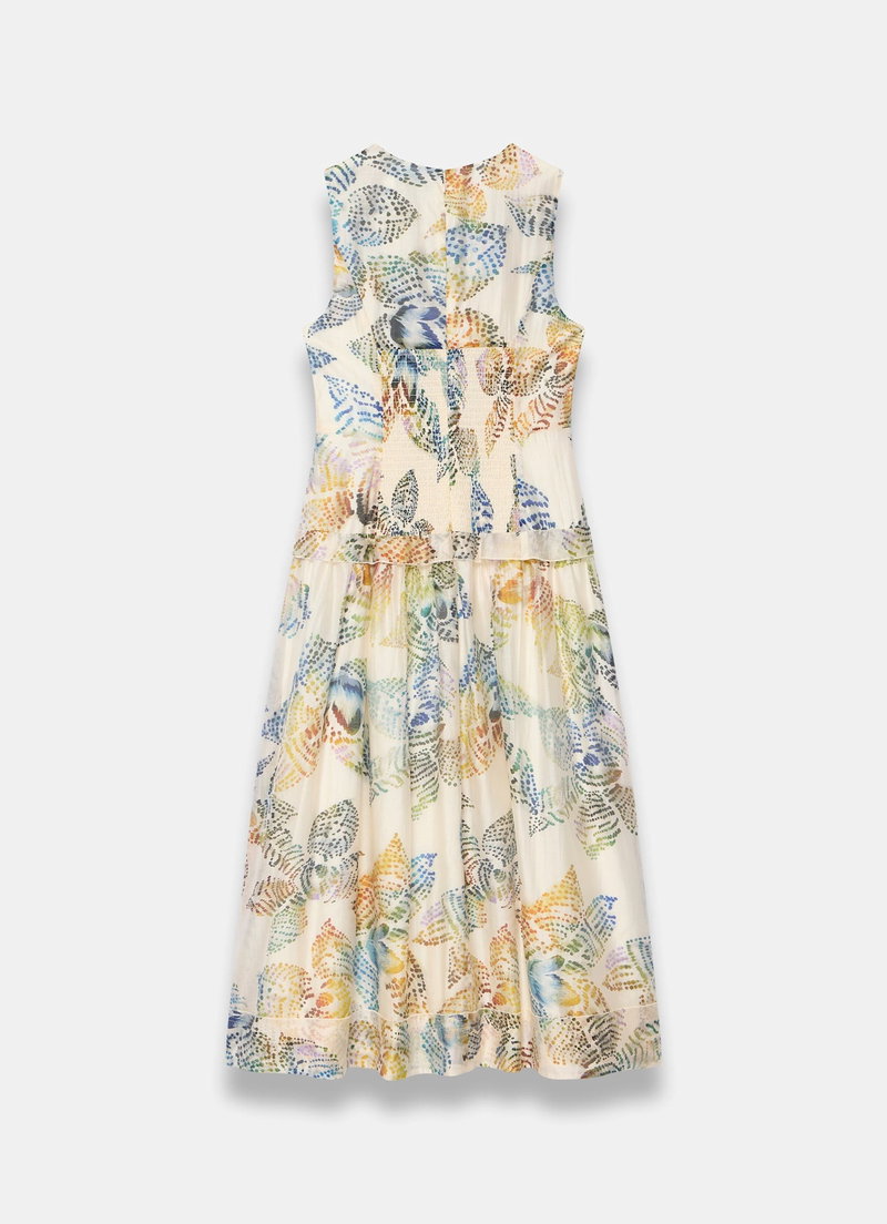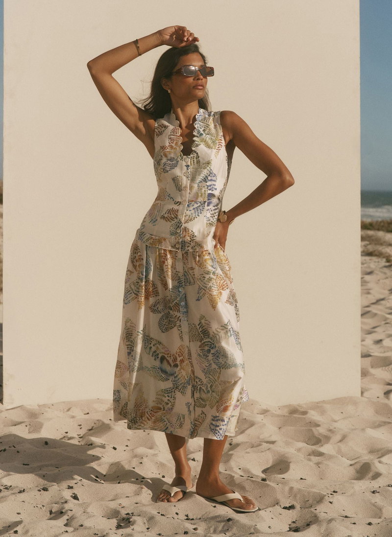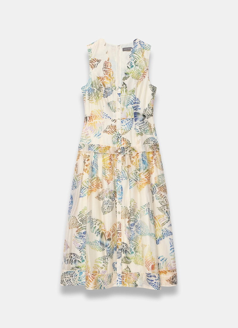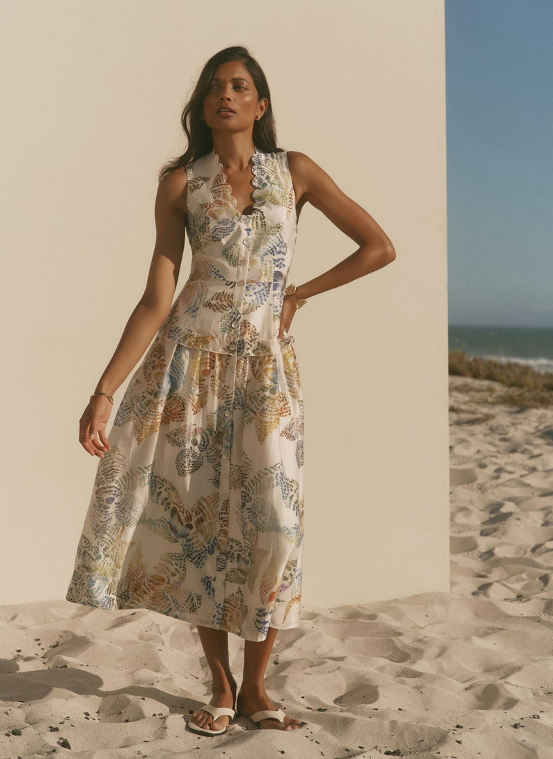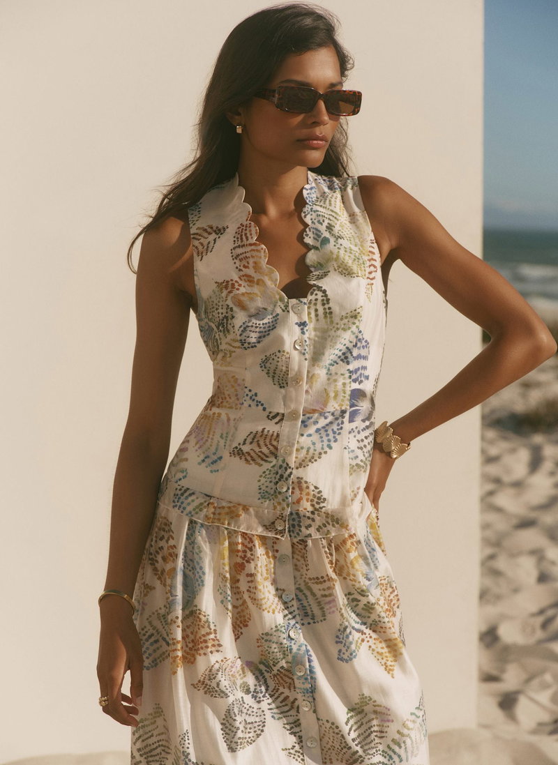 Cream tone sleeveless printed dress in a midi silhouette featuring a scallop trim V-neckline, ruffle trim waist band, buttons through the front, shirred back and a zip fastening through the back.