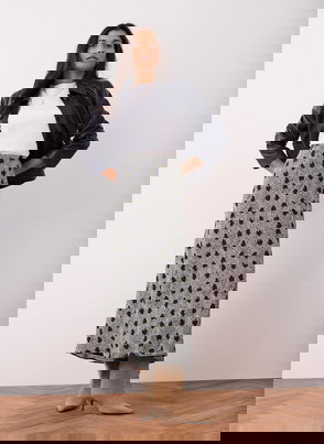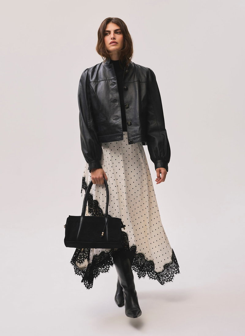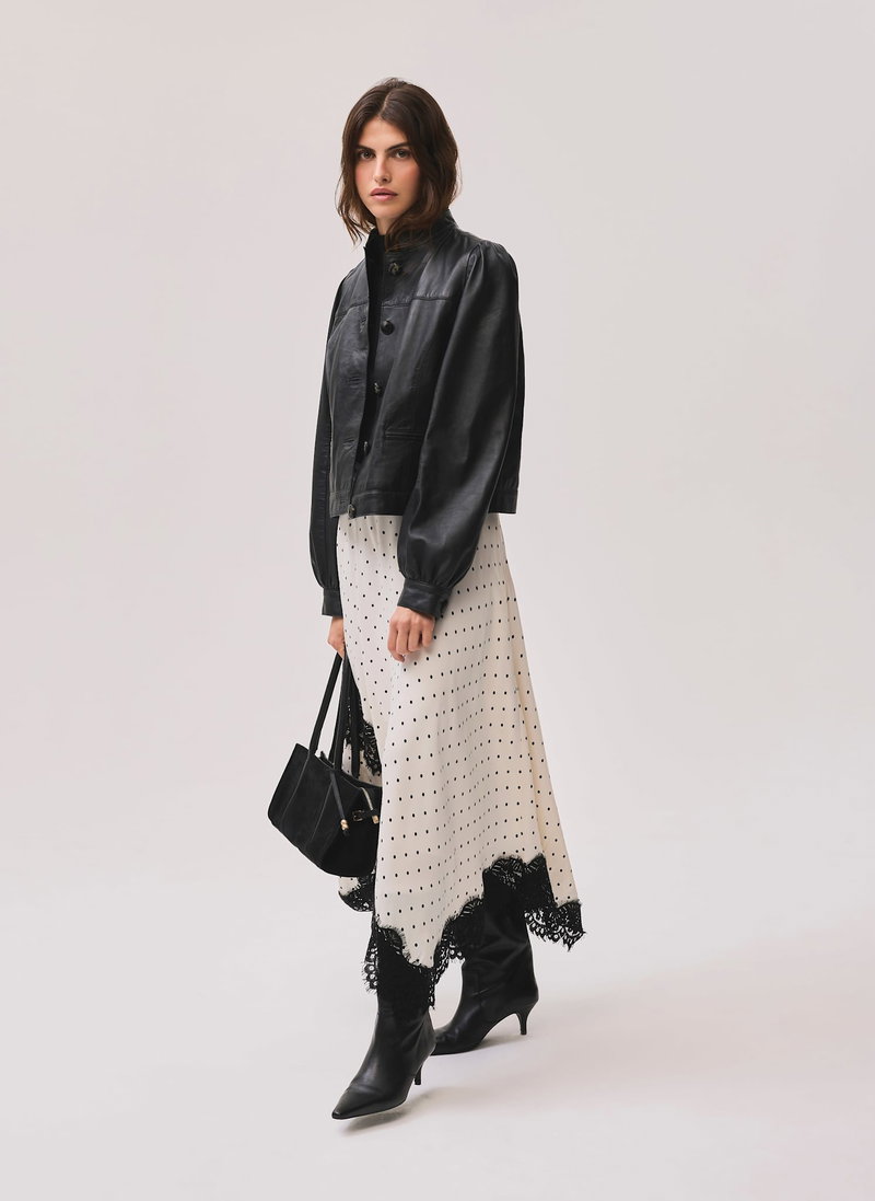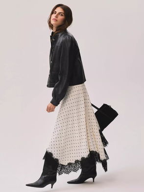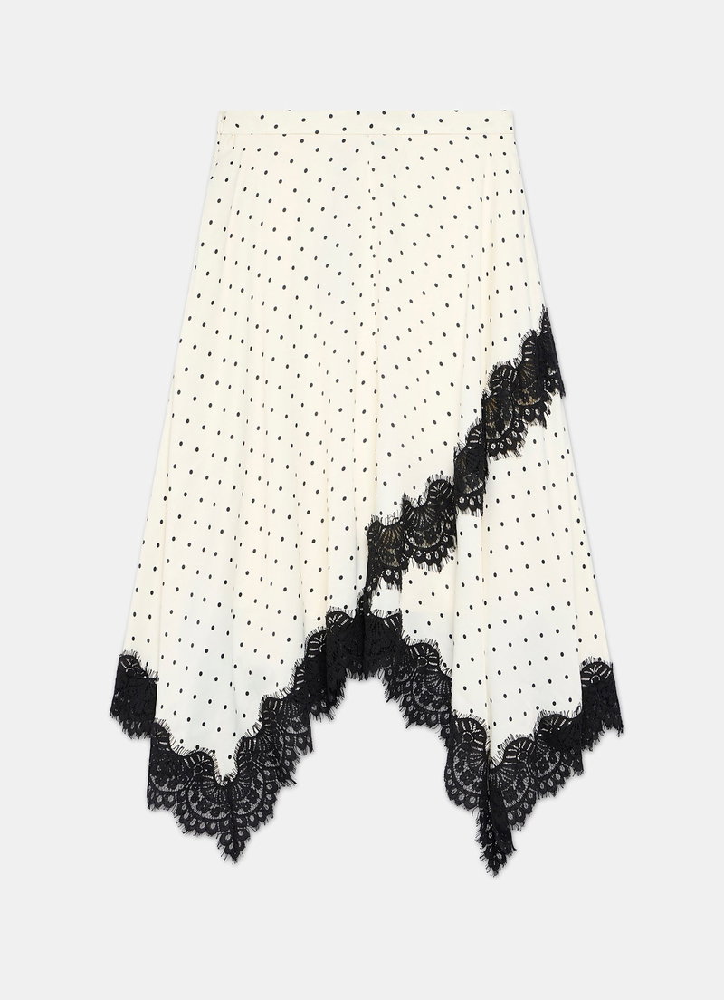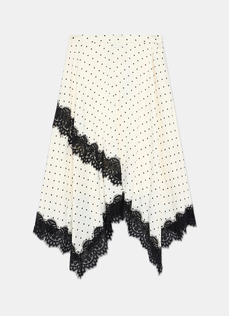 Cream tone polka dot skirt in a maxi silhouette featuring lace detailing, handkerchief hemline and a zip fastening through the side.