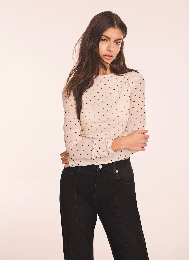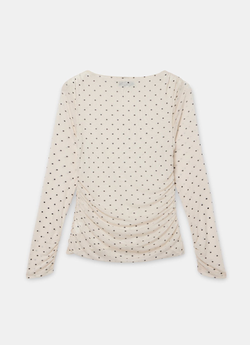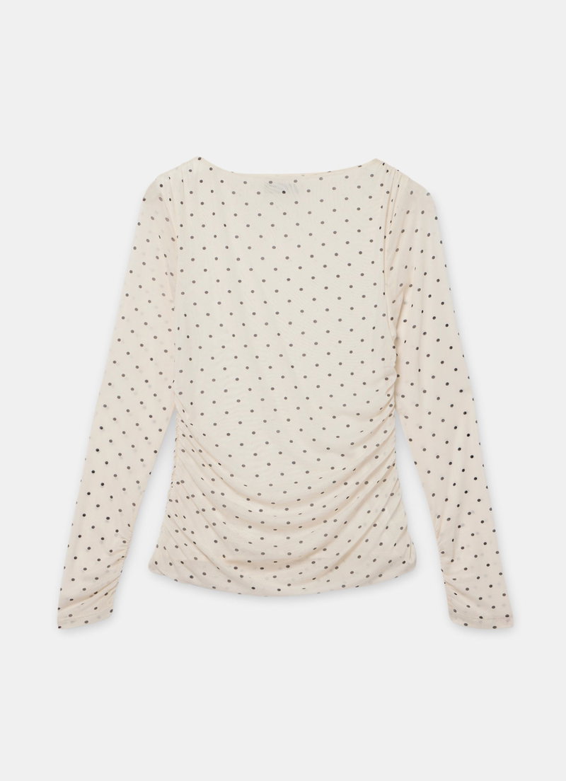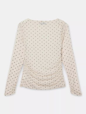 Cream polka dot print top featuring a crew neckline, long sleeves and draped detailing.