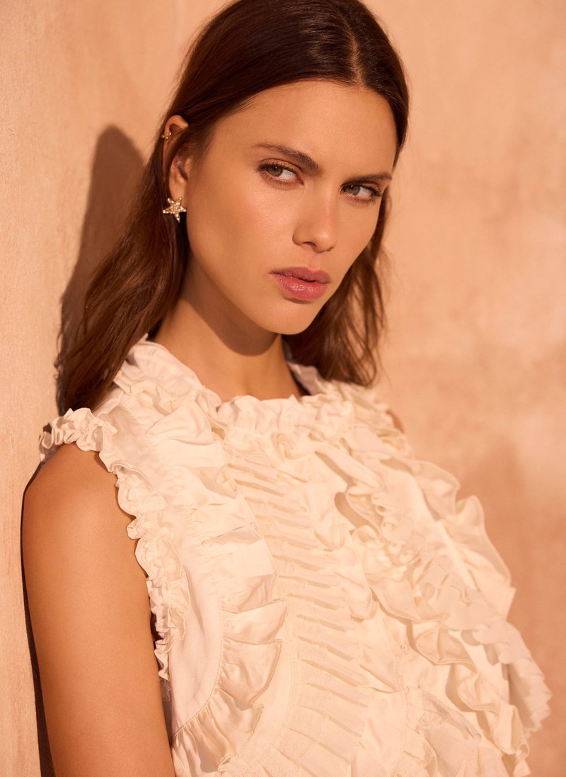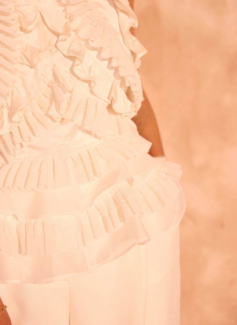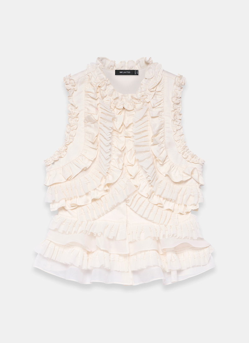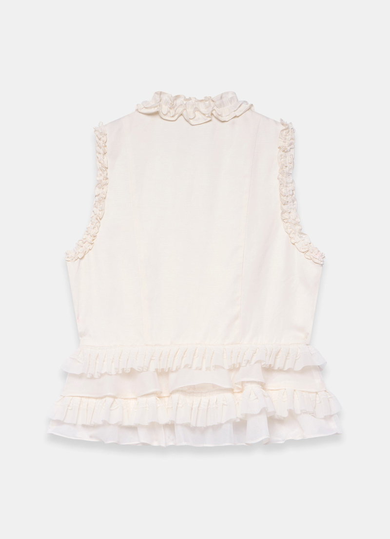 Cream ruffle sleeveless top featuring a high neckline, peplum hemline with a hook fastening through the front.