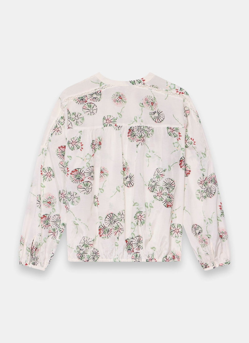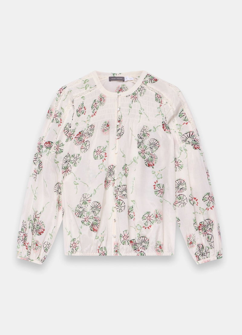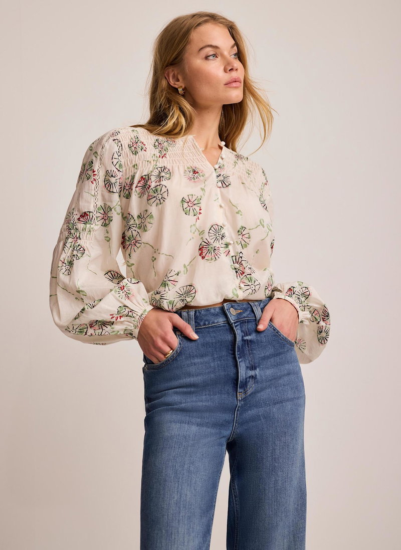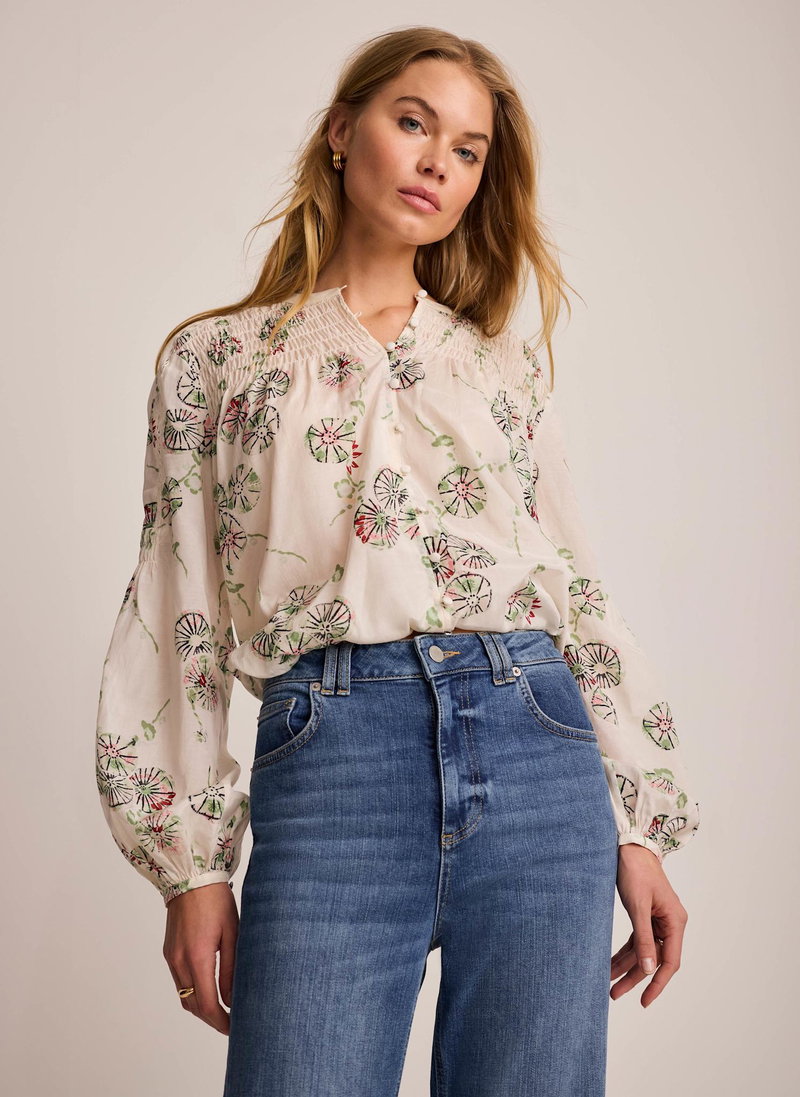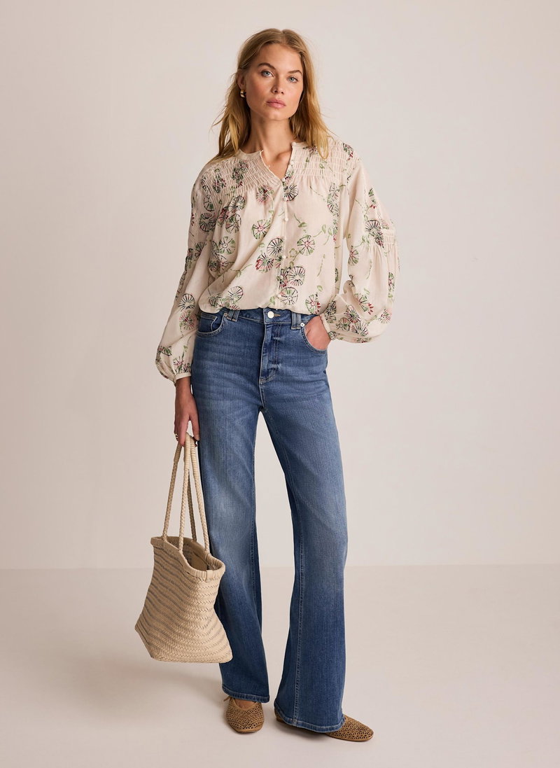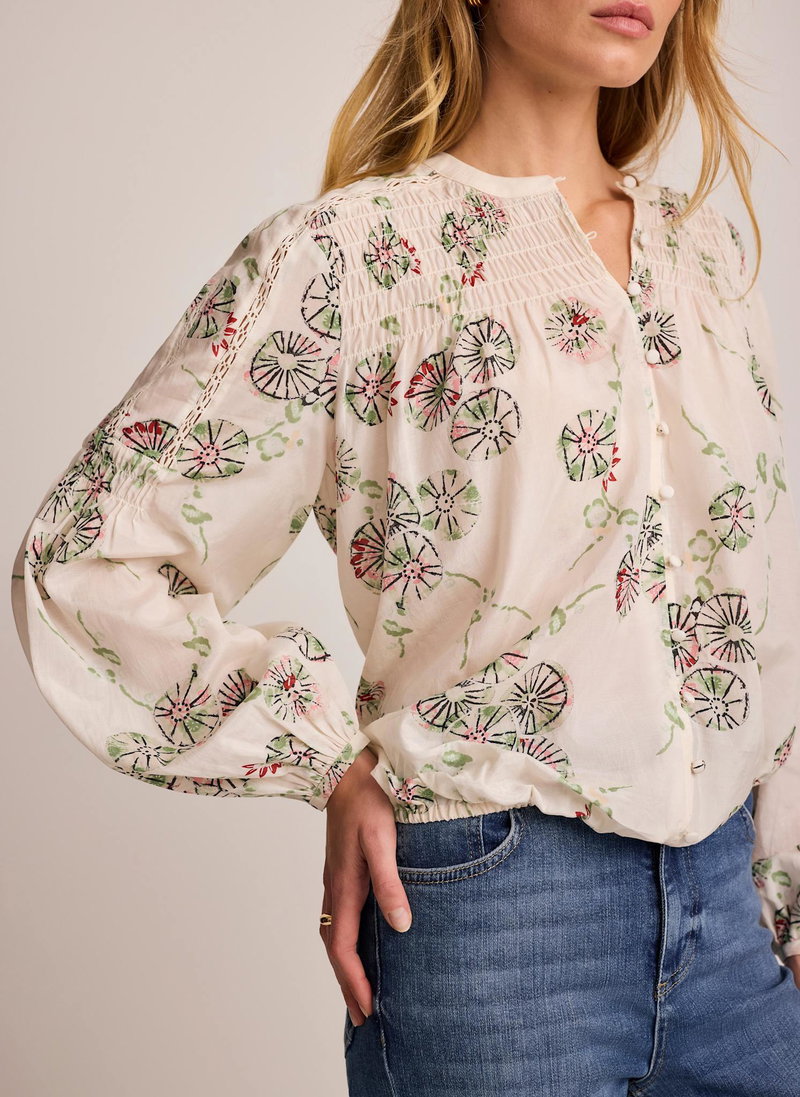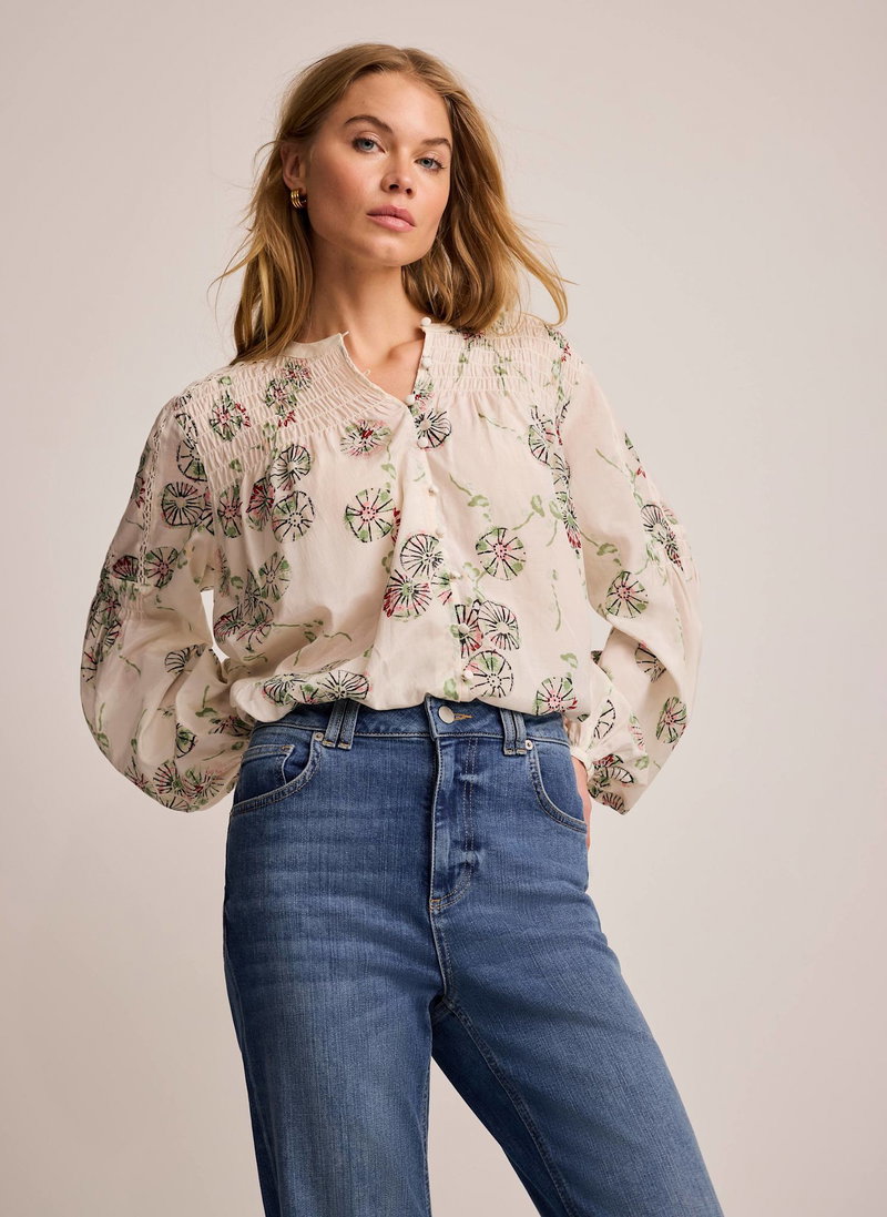 Cream tone floral print blouse featuring a crew neckline, shirred panelling, long sleeves, open stitch trim, elasticated cuffs with a button fastening through the front.
