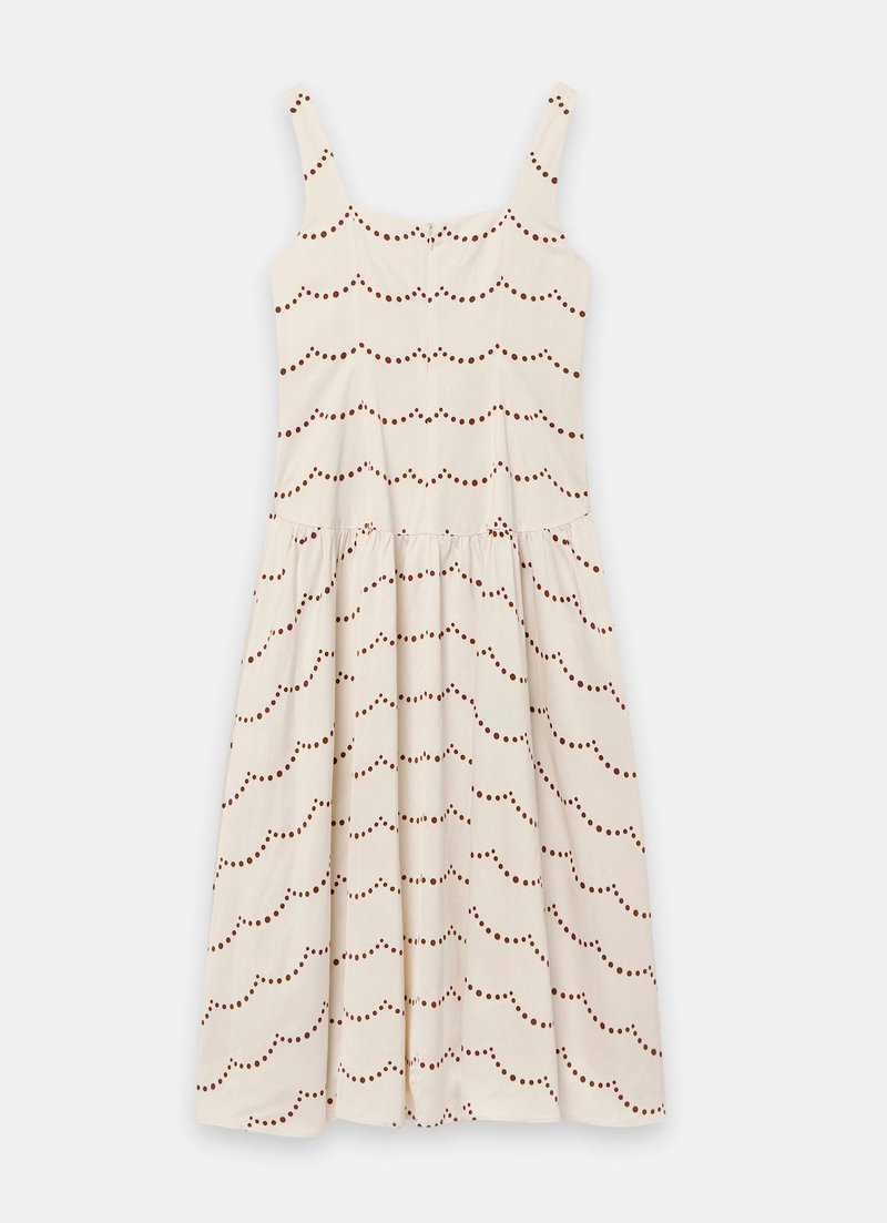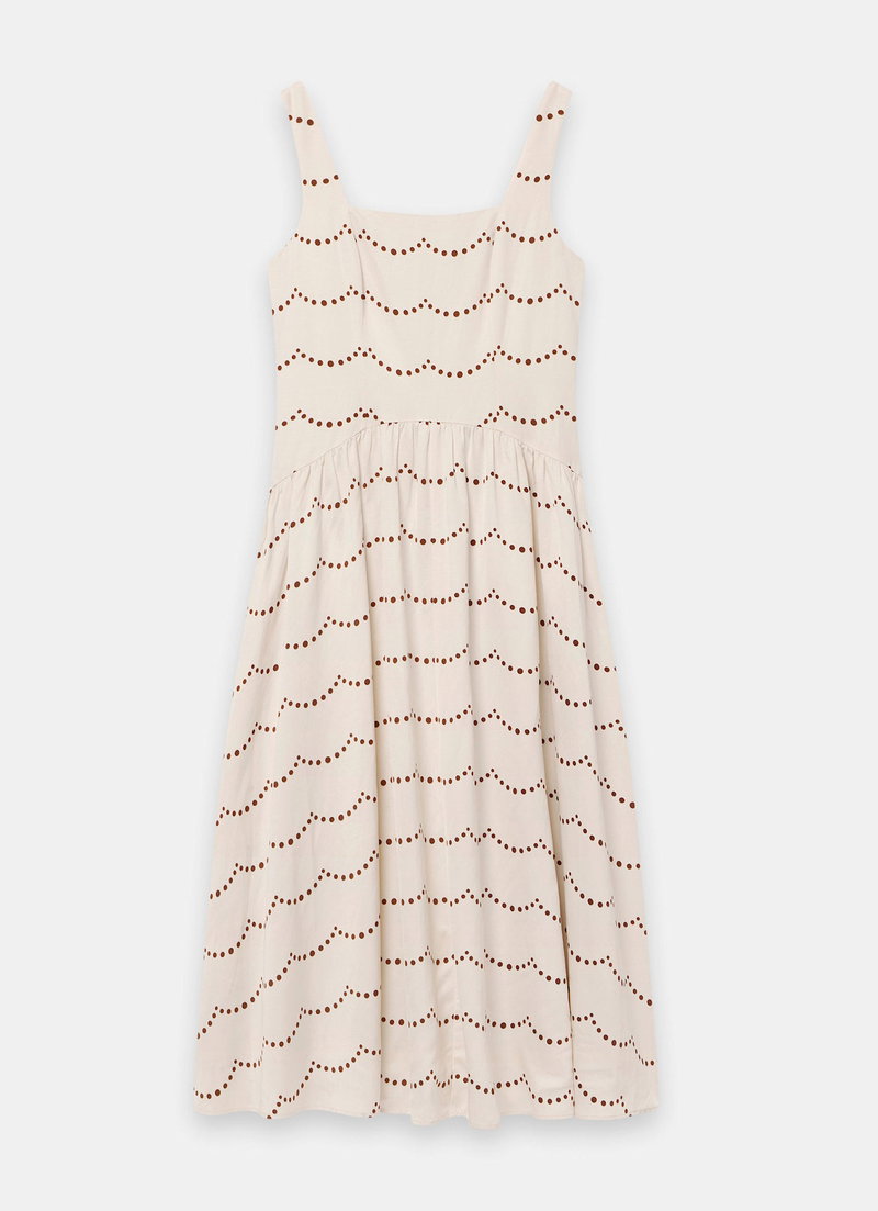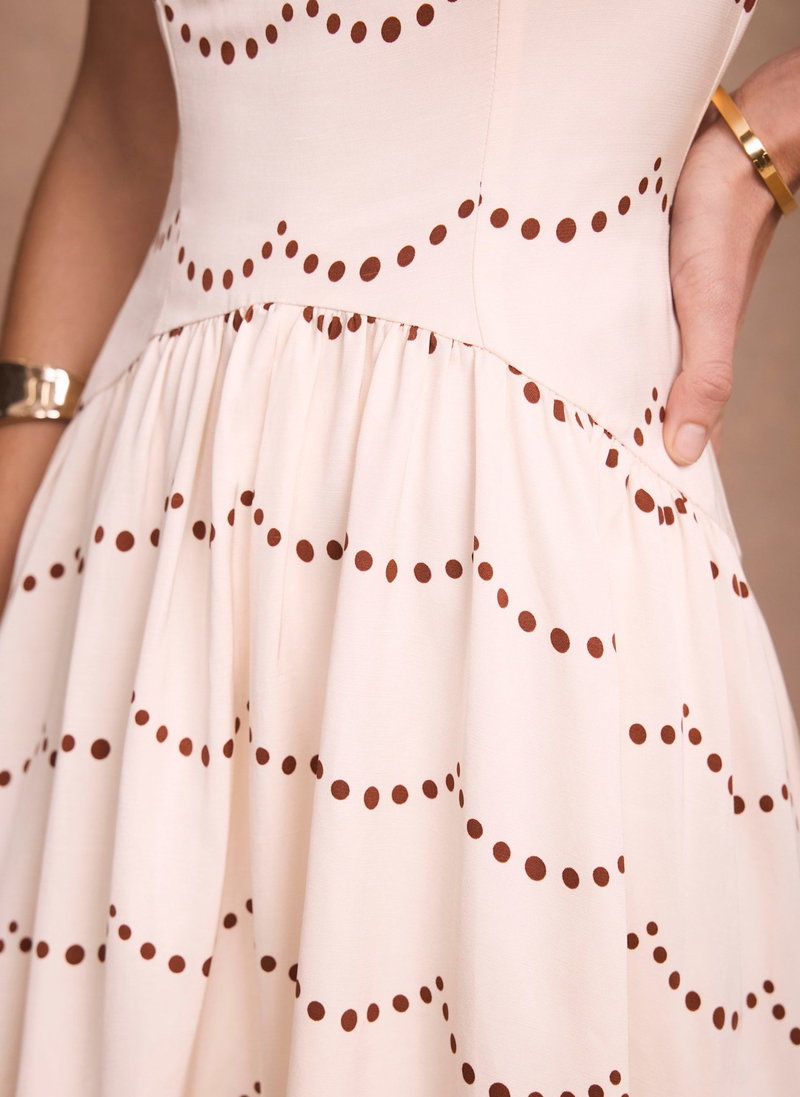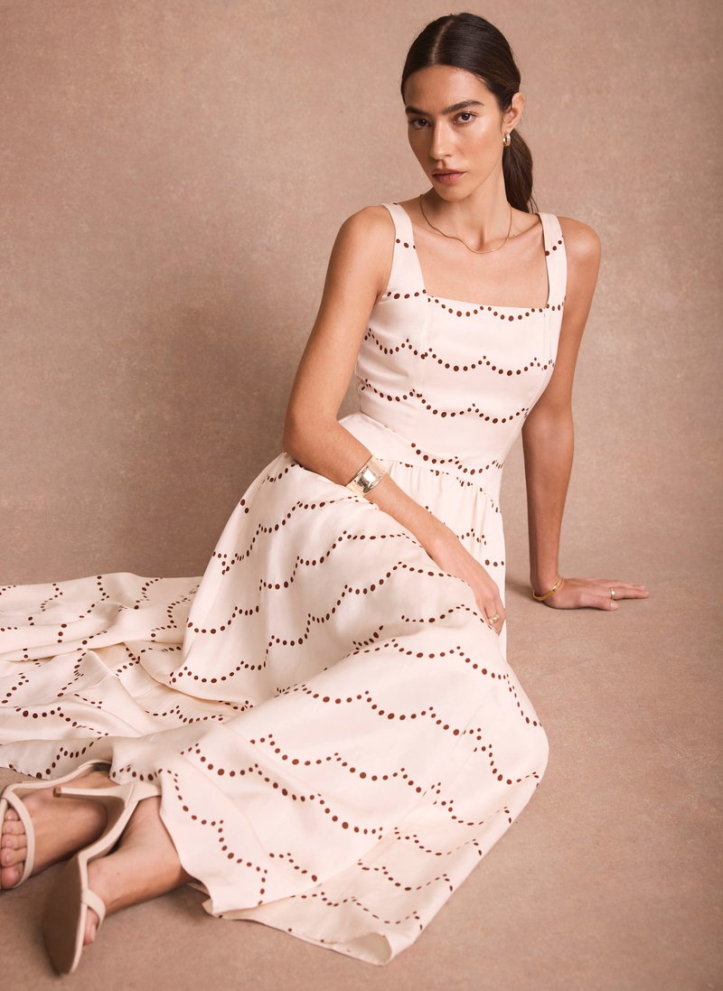 Cream tone spot print dress in a maxi silhouette featuring a square neckline, thin straps with a zip fastening through the back.