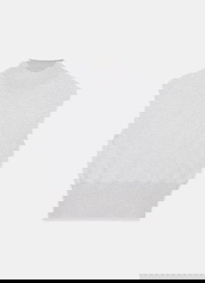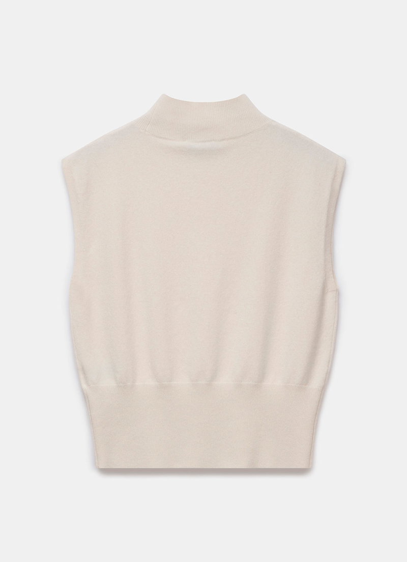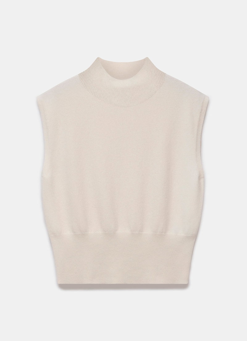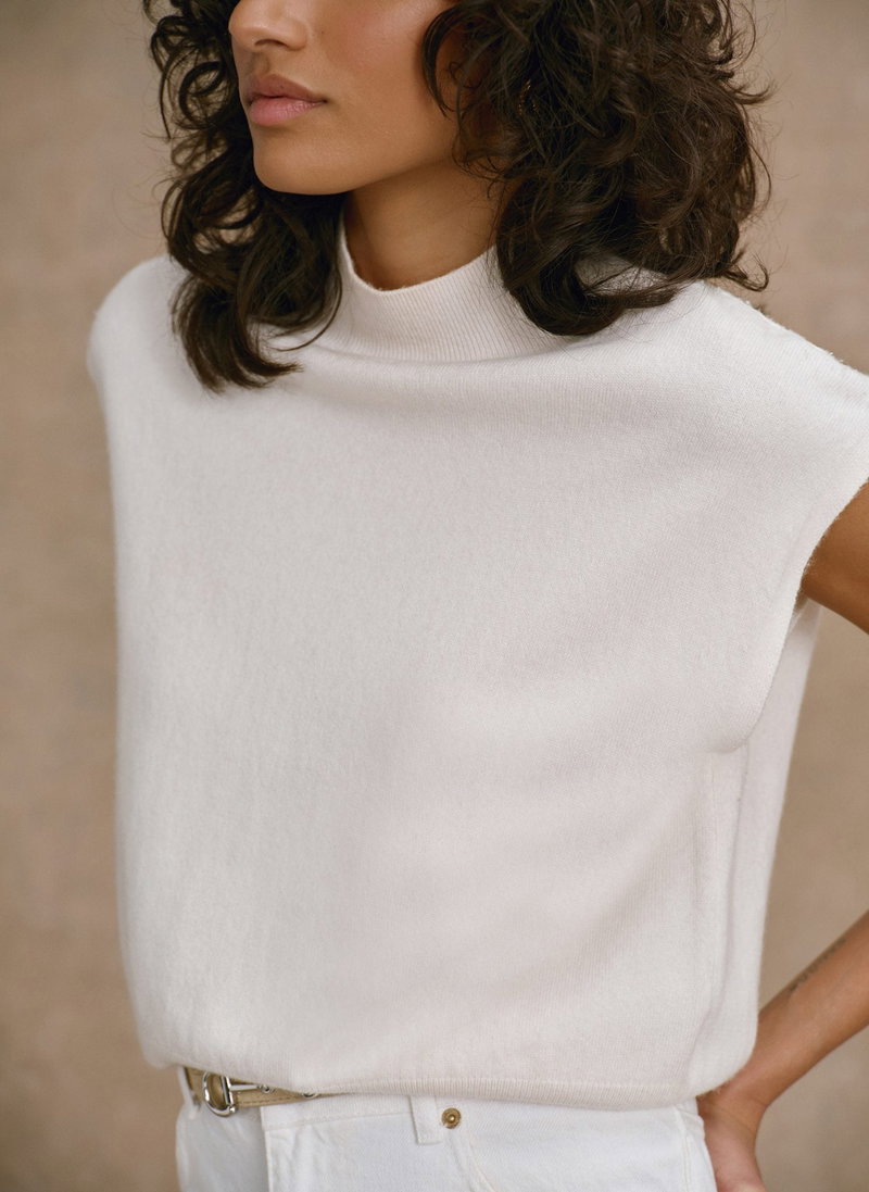 Cream cap sleeved wool blend top with cashmere featuring a ribbed turtle neckline and elongated ribbed waistband.