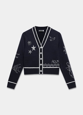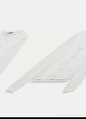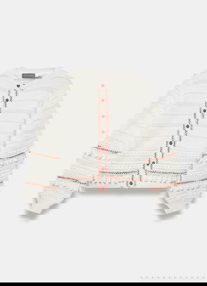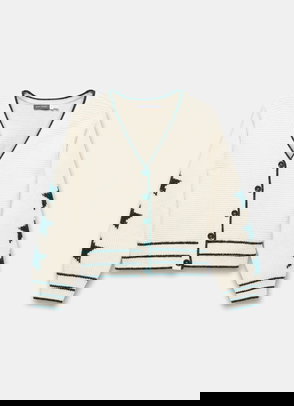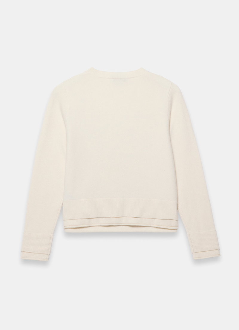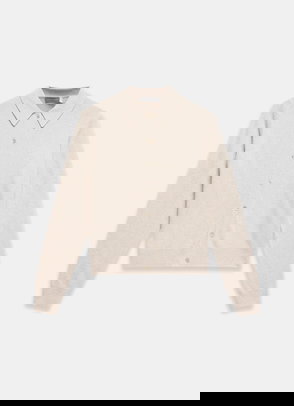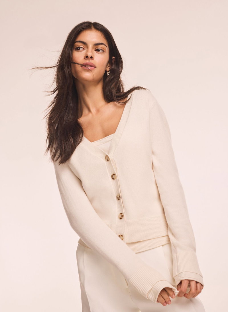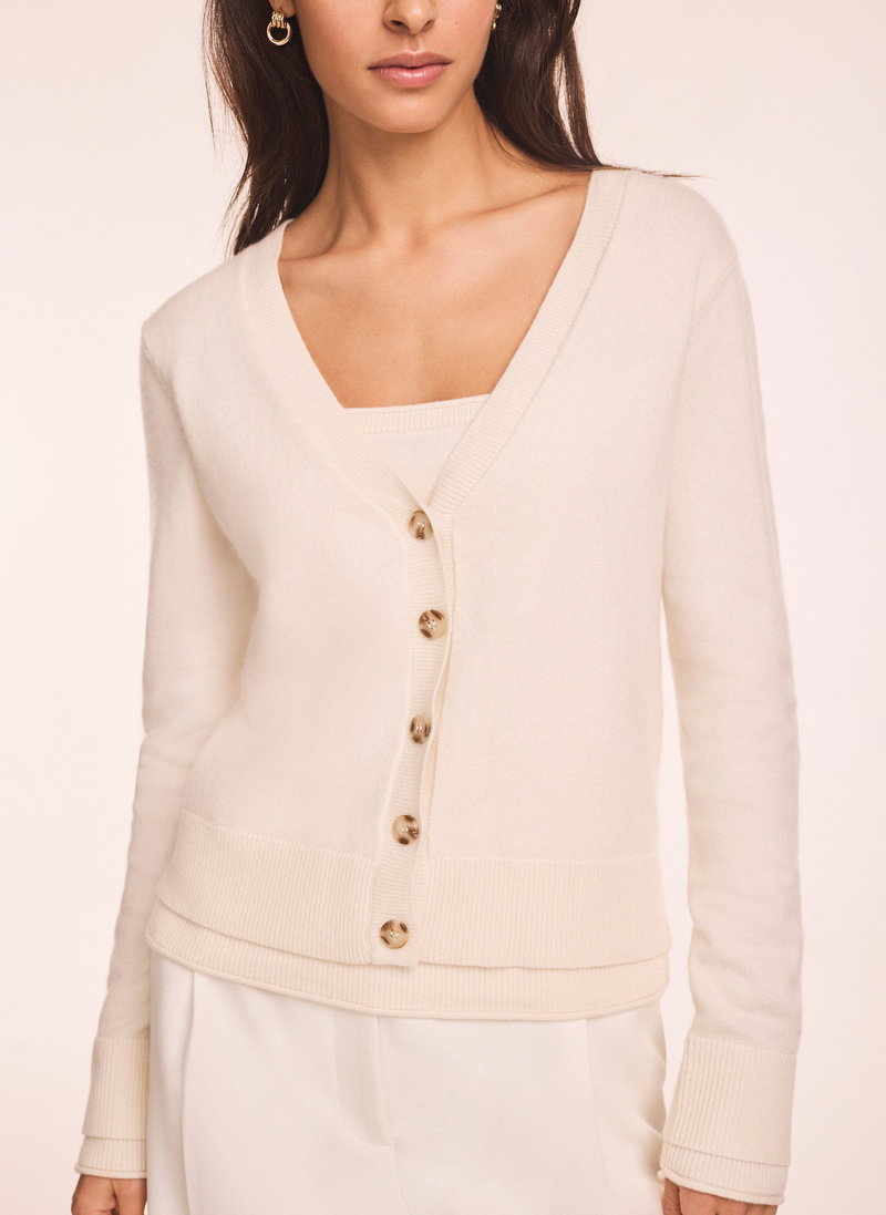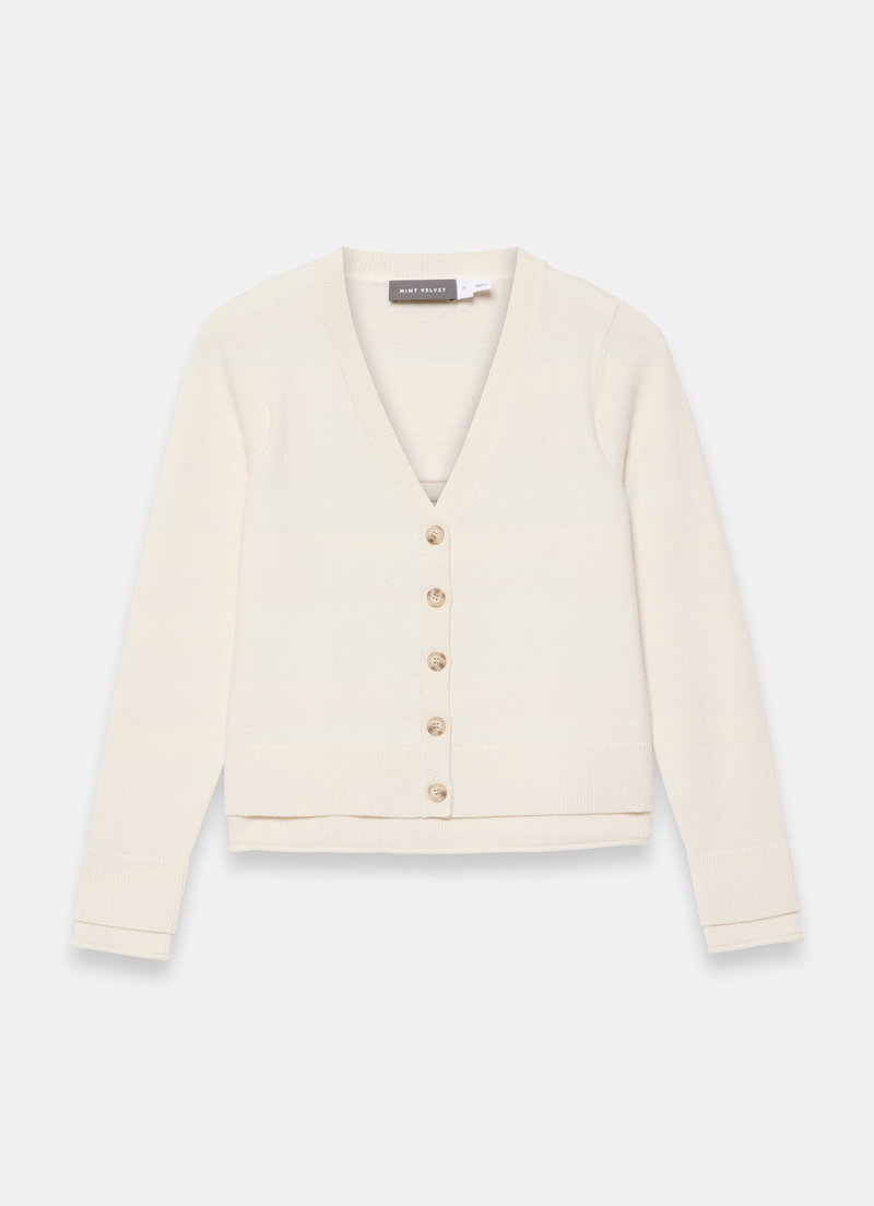 Cream layered cardigan featuring a V-neckline, long sleeves with a button fastening through the front.