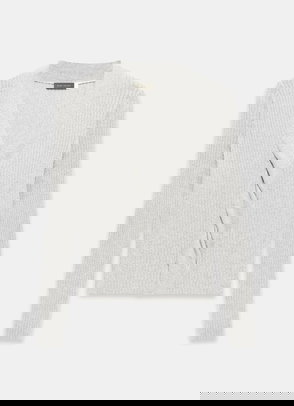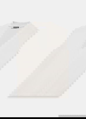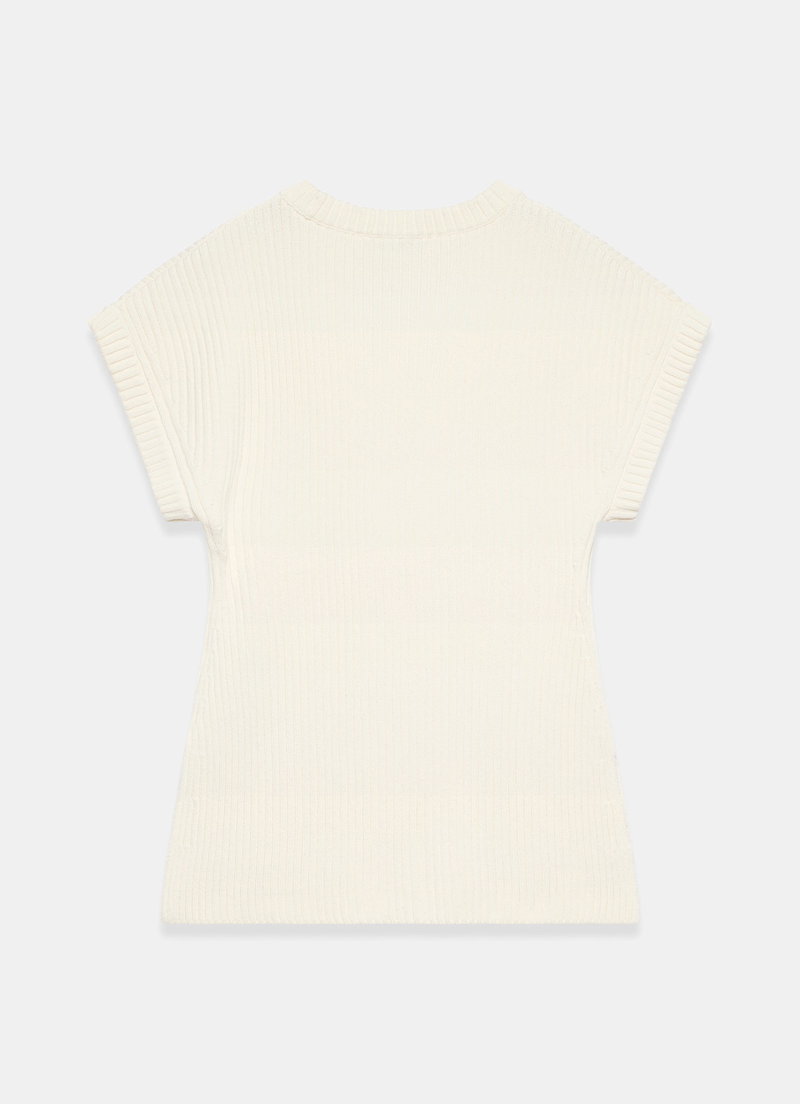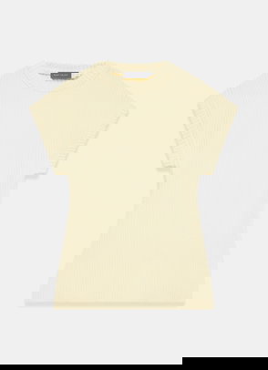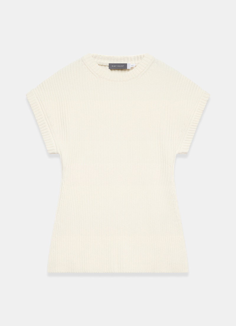 Cream ribbed longline top featuring a crew neckline, short sleeves and side split hemline.