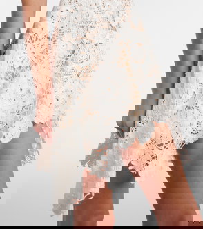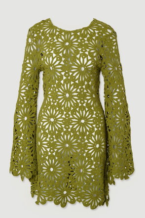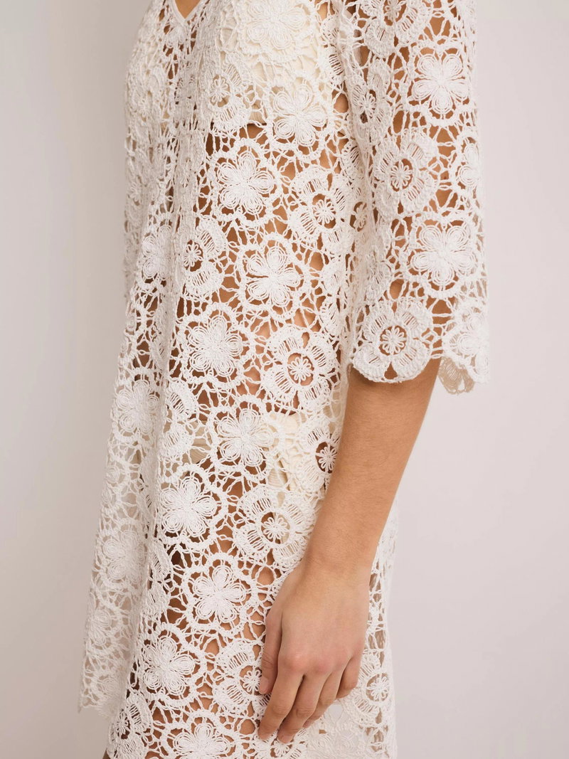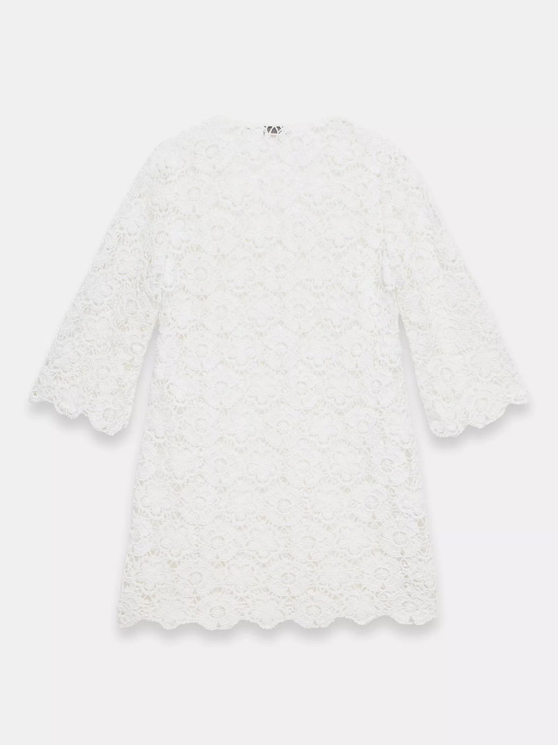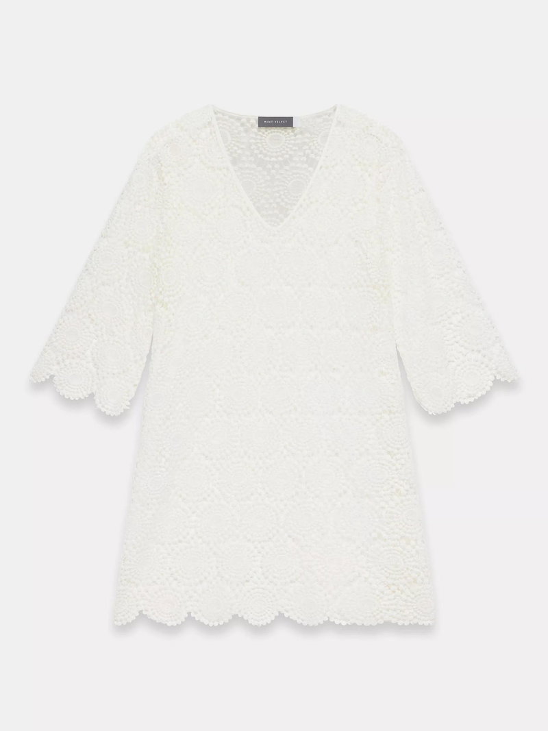 An open cutwork crochet beach dress in a mini silhouette featuring a V neckline, 3/4 length sleeves, with a scallop trim.