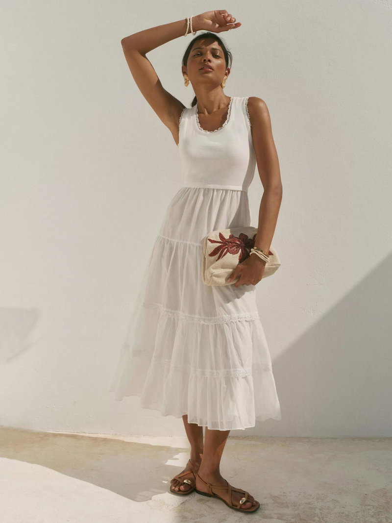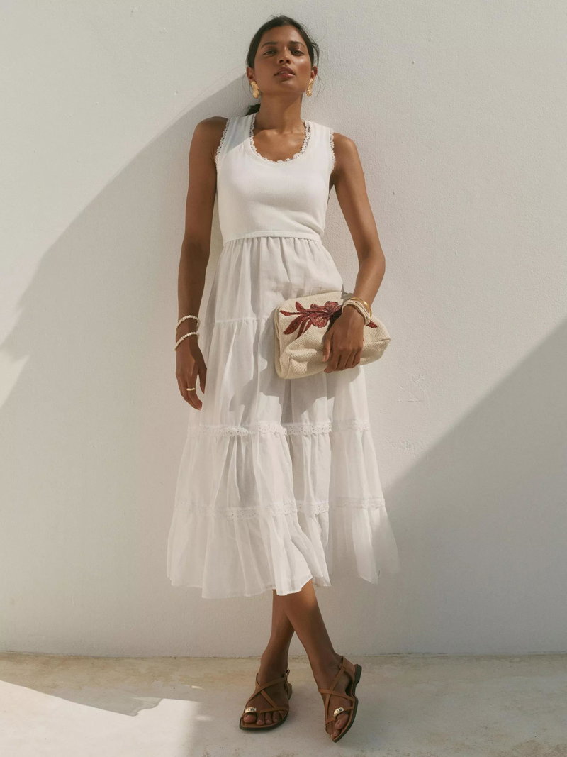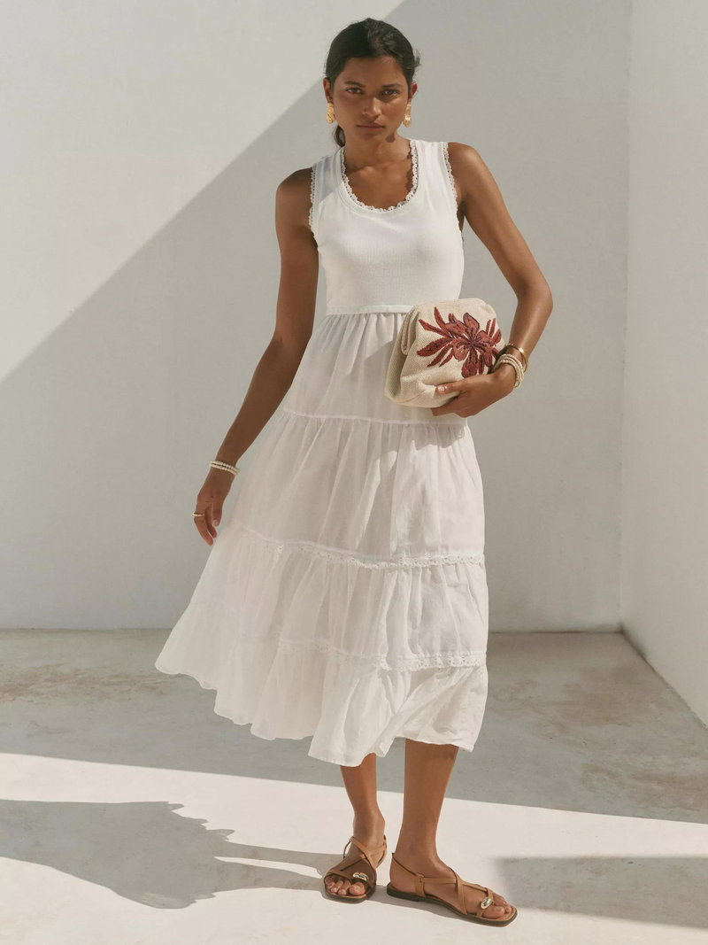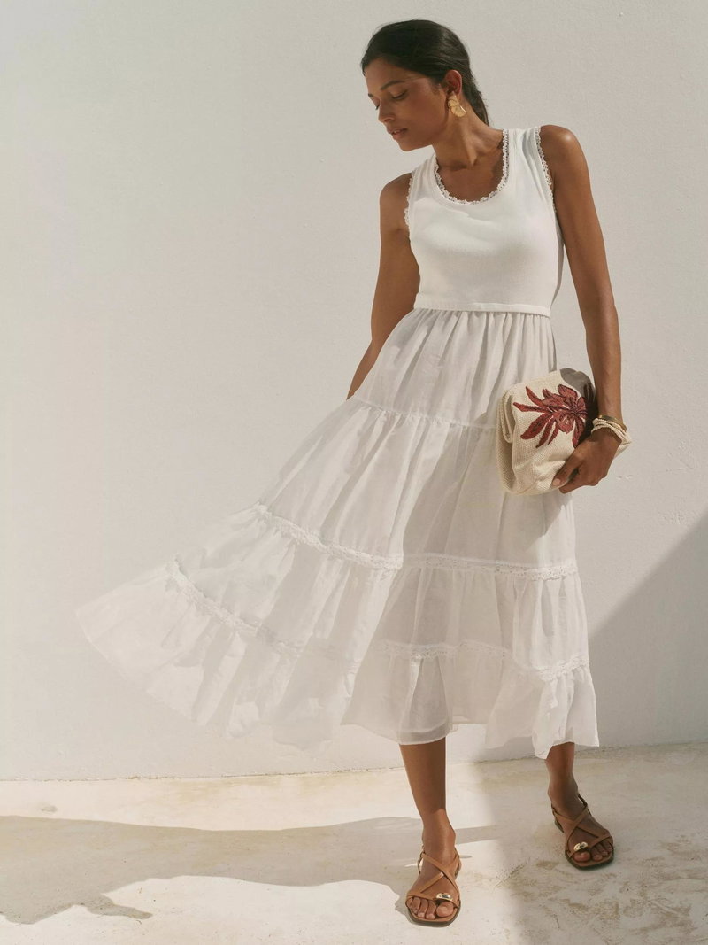 A midi dress shaped with airy tiers and a soft scoop neck, crafted mainly from cotton for day-long comfort, ideal for summer events. The sleeveless design offers freedom of movement and can be easily layered when the weather shifts.