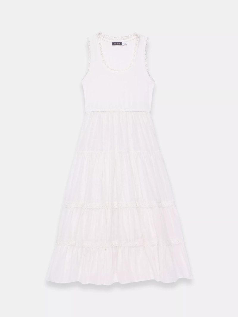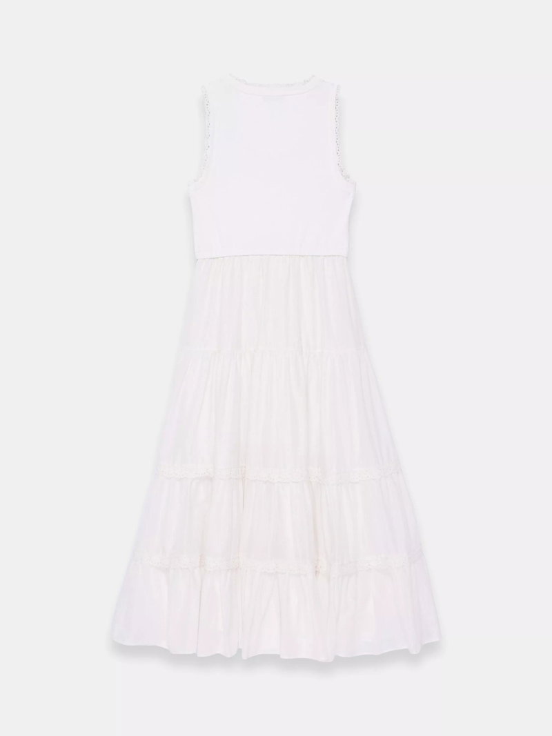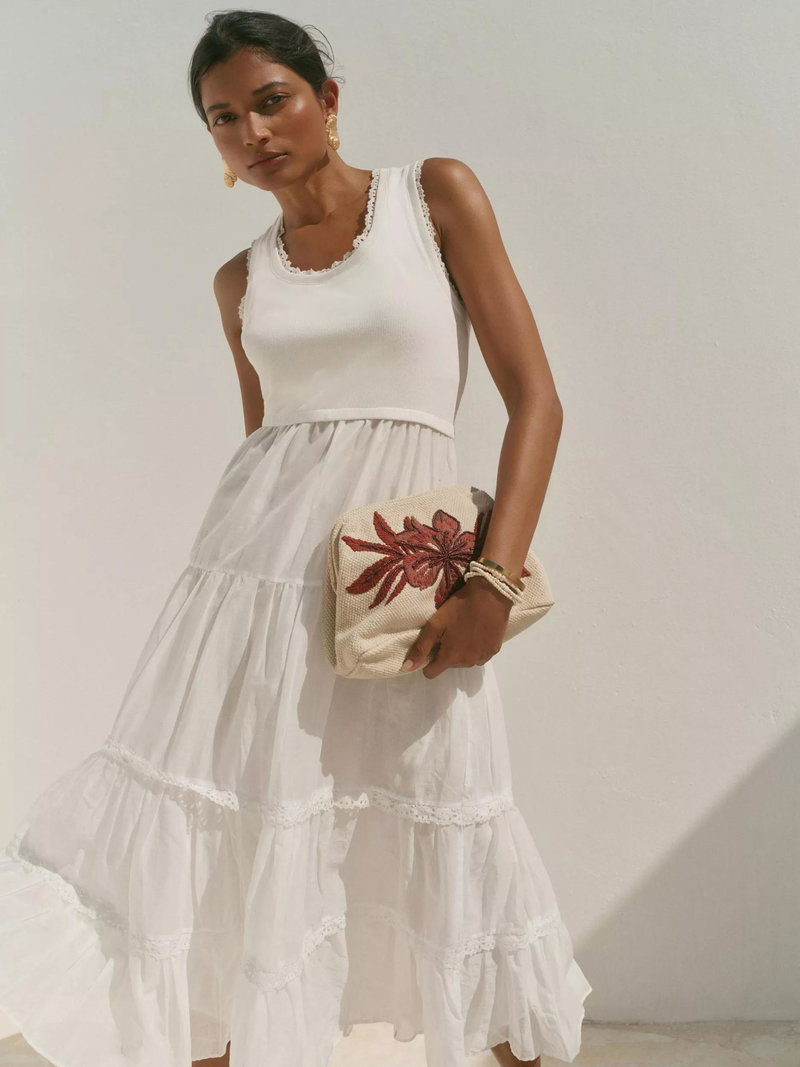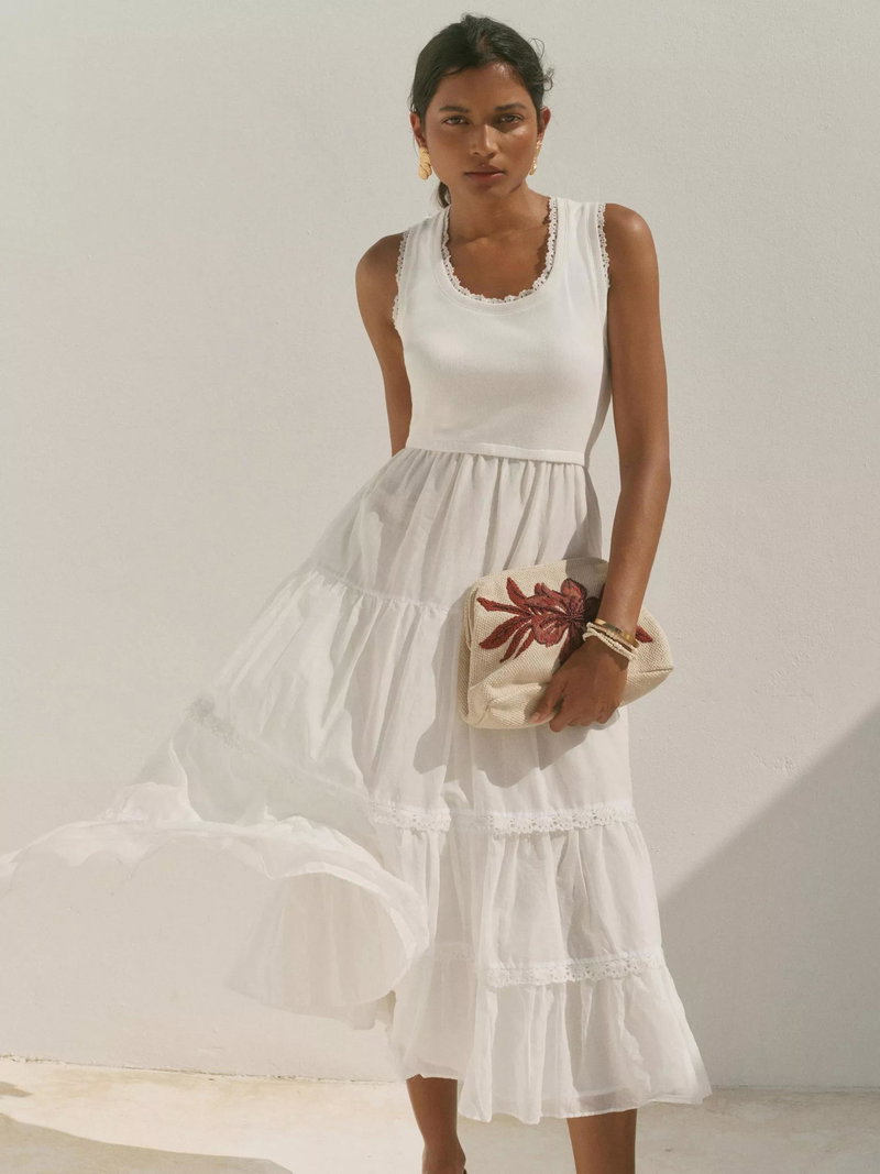 A midi dress shaped with airy tiers and a soft scoop neck, crafted mainly from cotton for day-long comfort, ideal for summer events. The sleeveless design offers freedom of movement and can be easily layered when the weather shifts.