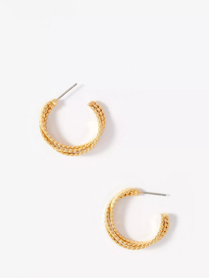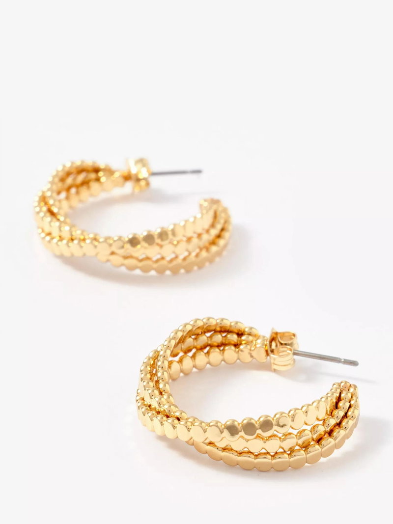 These elegant gold-tone hoop earrings showcase a triple cross-over twist design. The intricate silhouette is secured with a classic butterfly clasp fastening, offering a refined and comfortable finish.