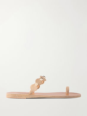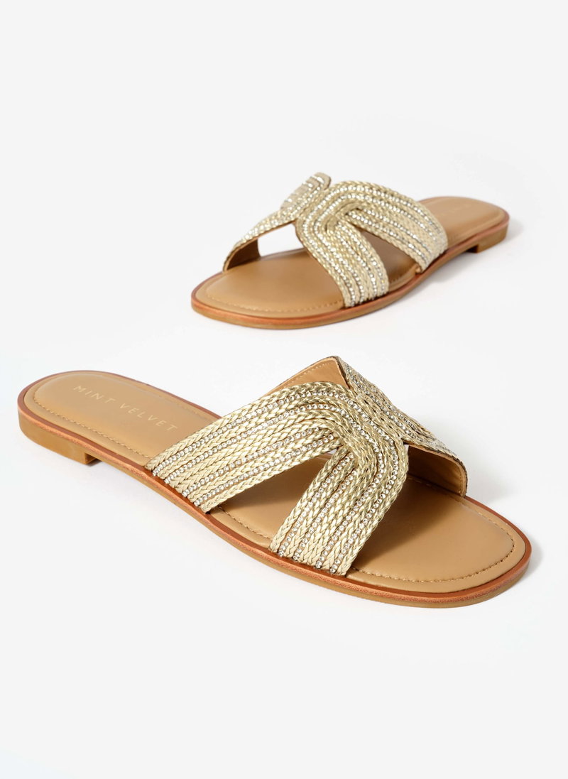 Gold metallic detail open cutwork flat sandals.
