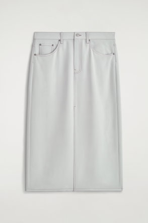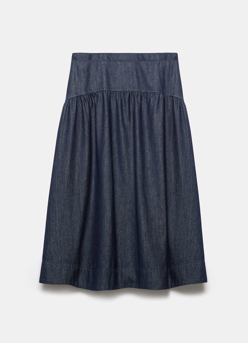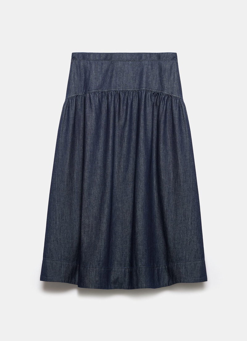 Dark indigo denim skirt in a maxi silhouette featuring a dropped waistband and zip fastening through the side.