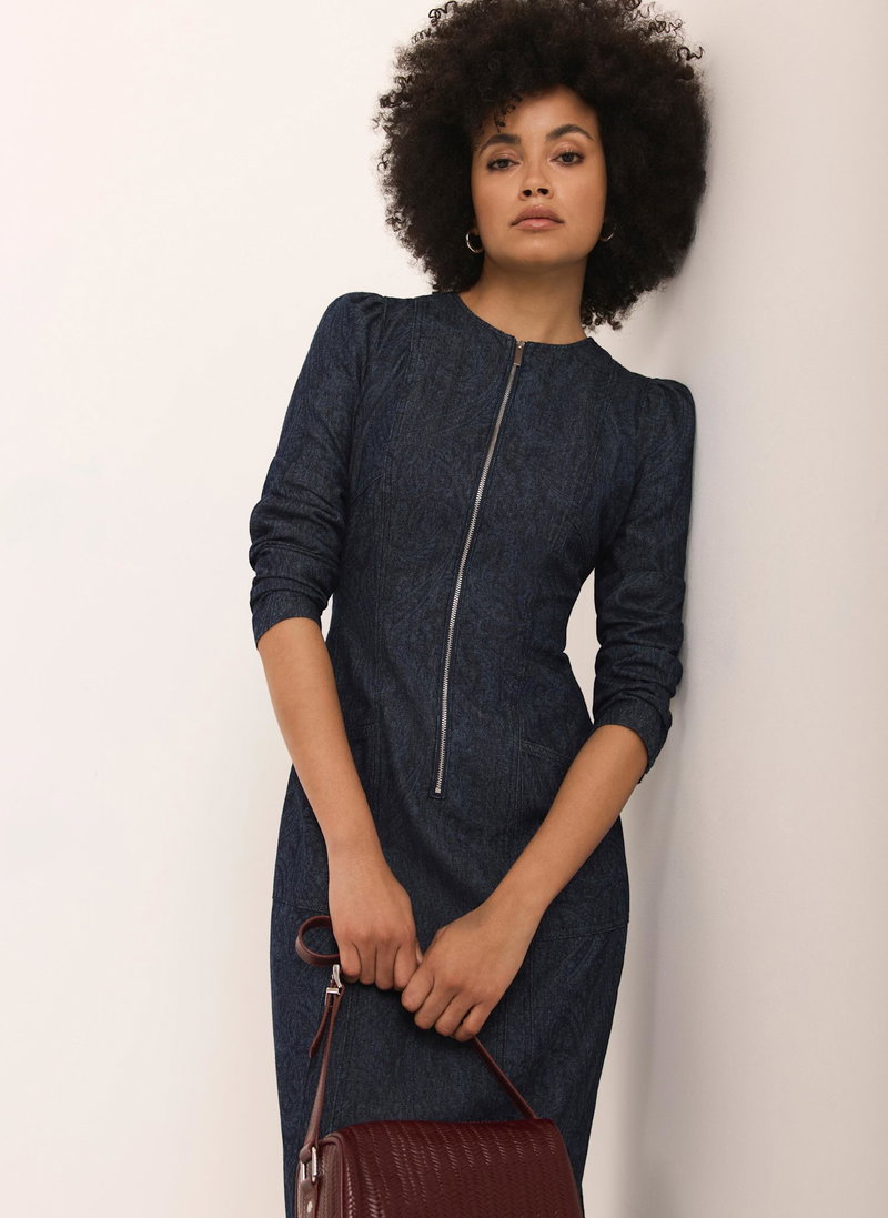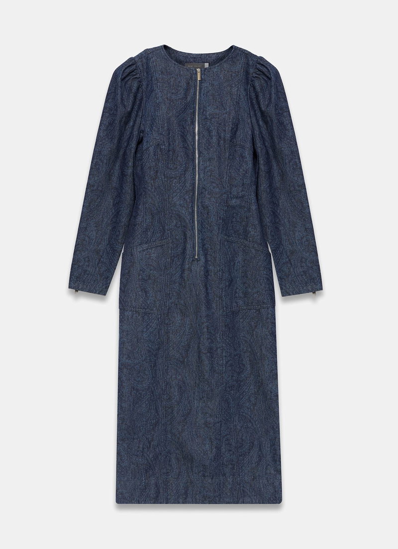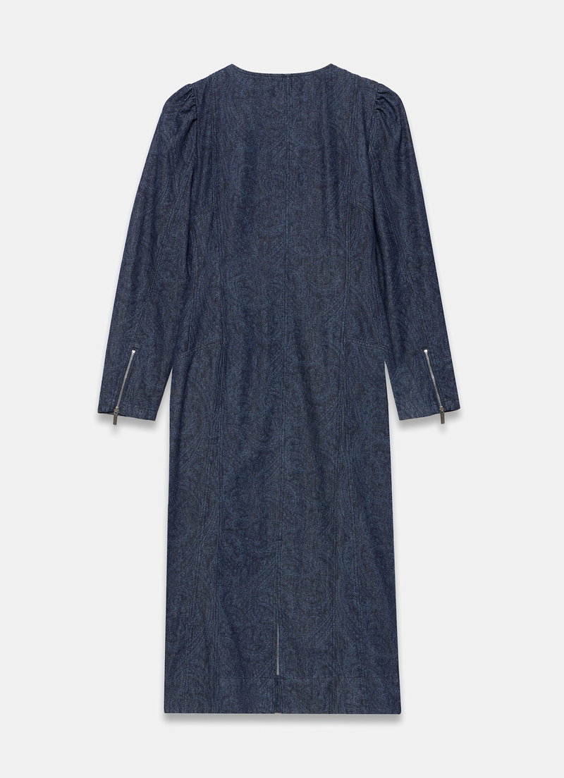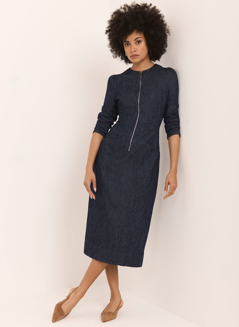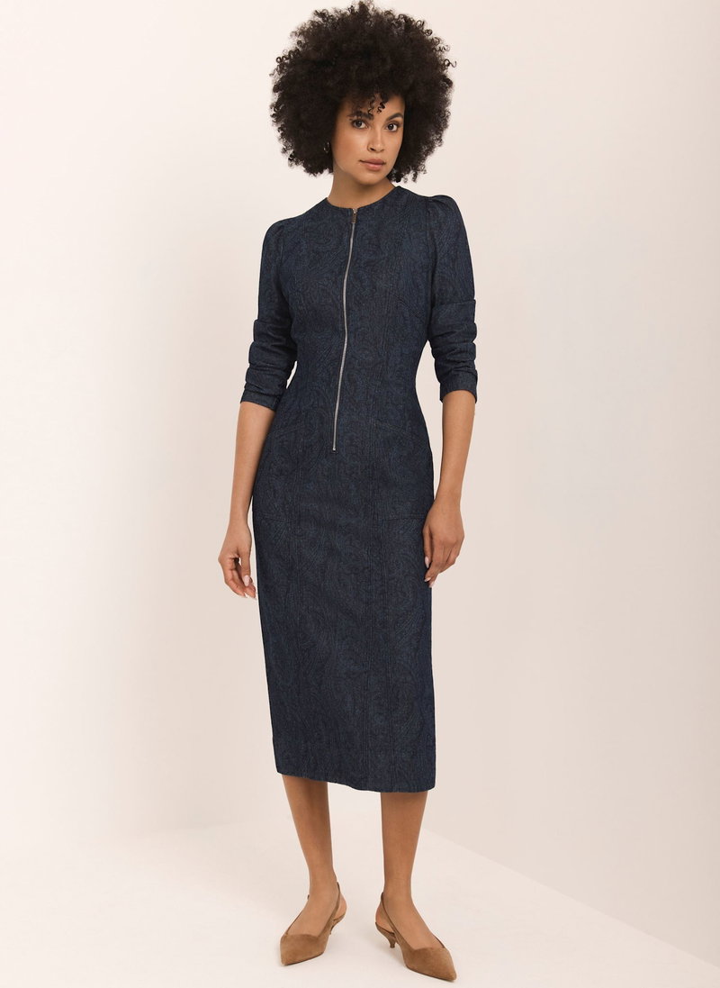 Dark indigo paisley print denim dress in a midi silhouette featuring a crew neckline, long sleeves, zipped cuffs, side pockets, rear split with a zip fastening through the front.
