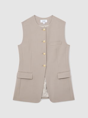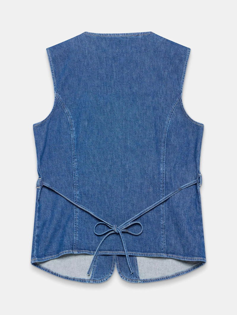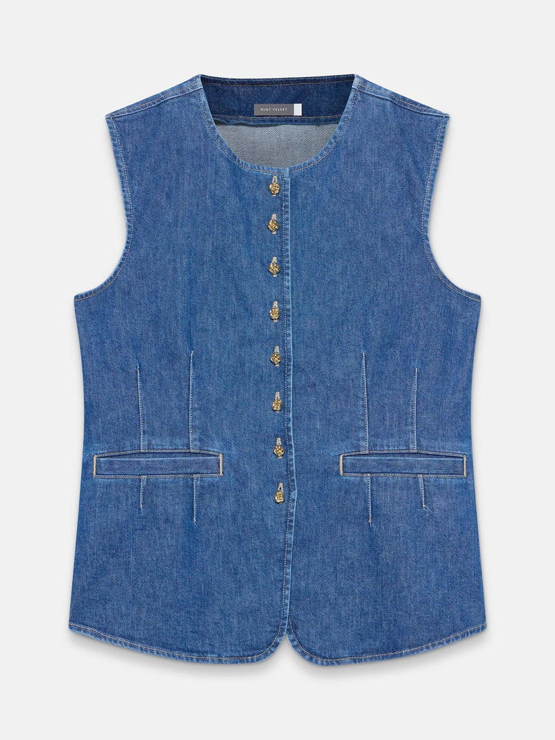 A denim longline waistcoat featuring a crew neckline, welt pockets, adjustable tie back and button fastening through the front.