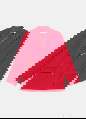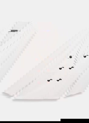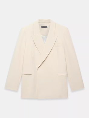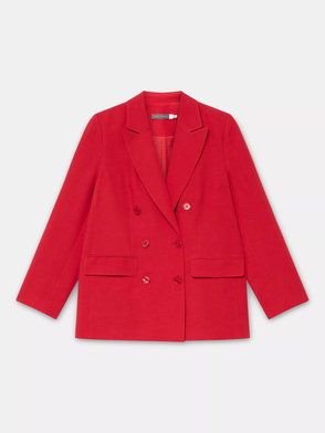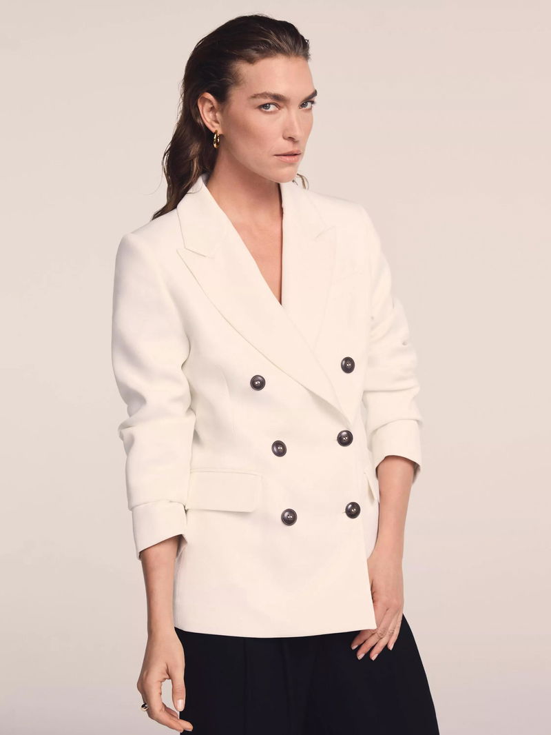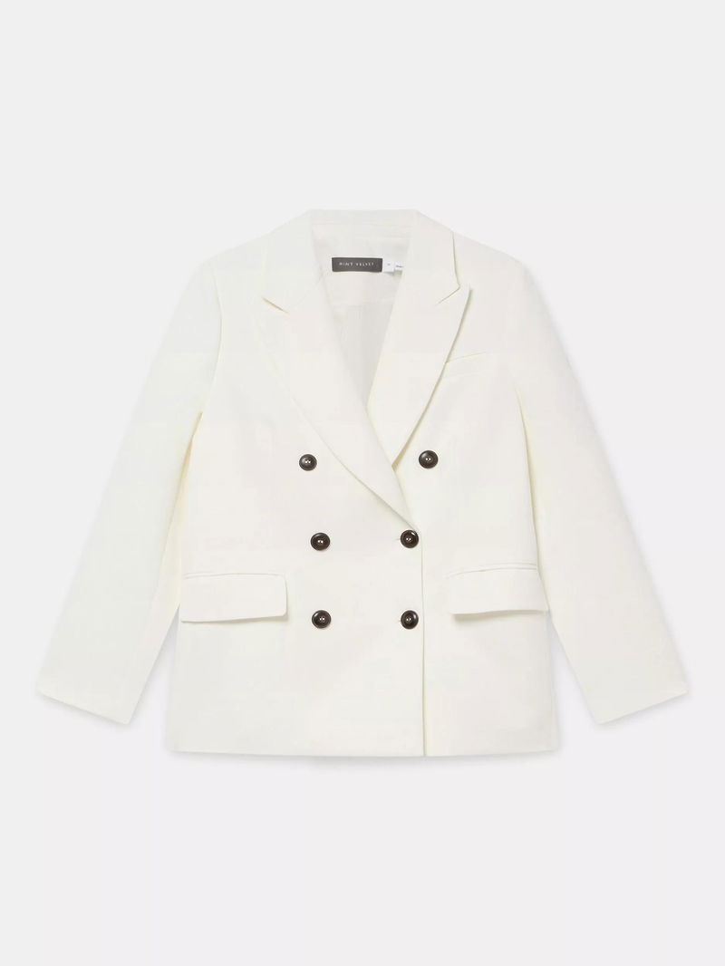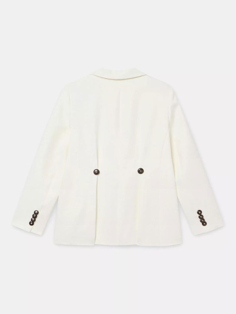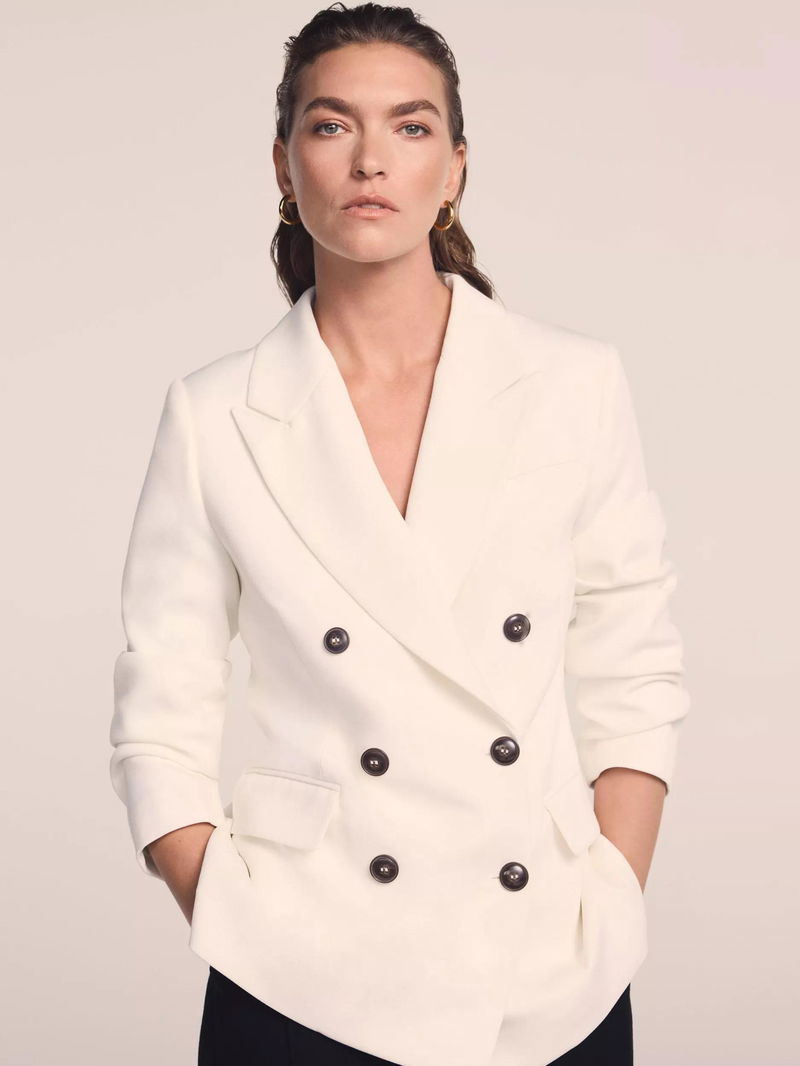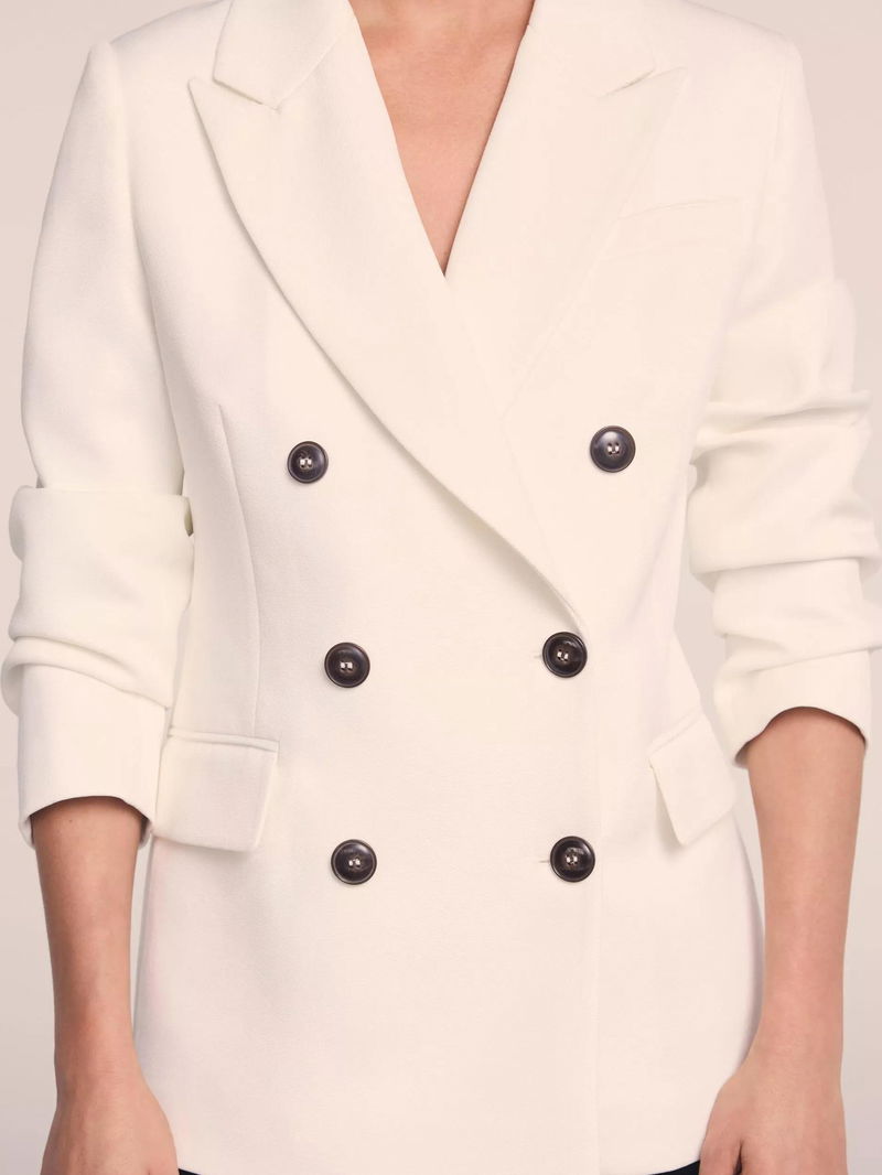 A blazer in a double-breasted silhouette featuring peaked lapels, long sleeves, buttoned cuffs, flap pockets, rear button detailing with a button fastening through the front.