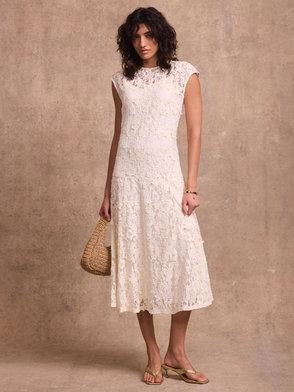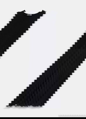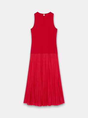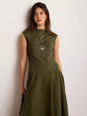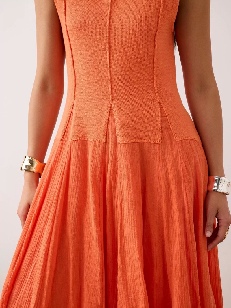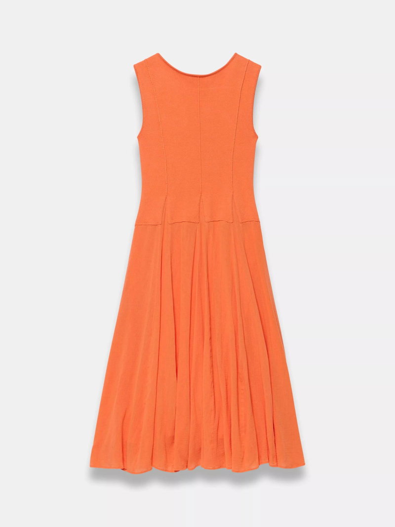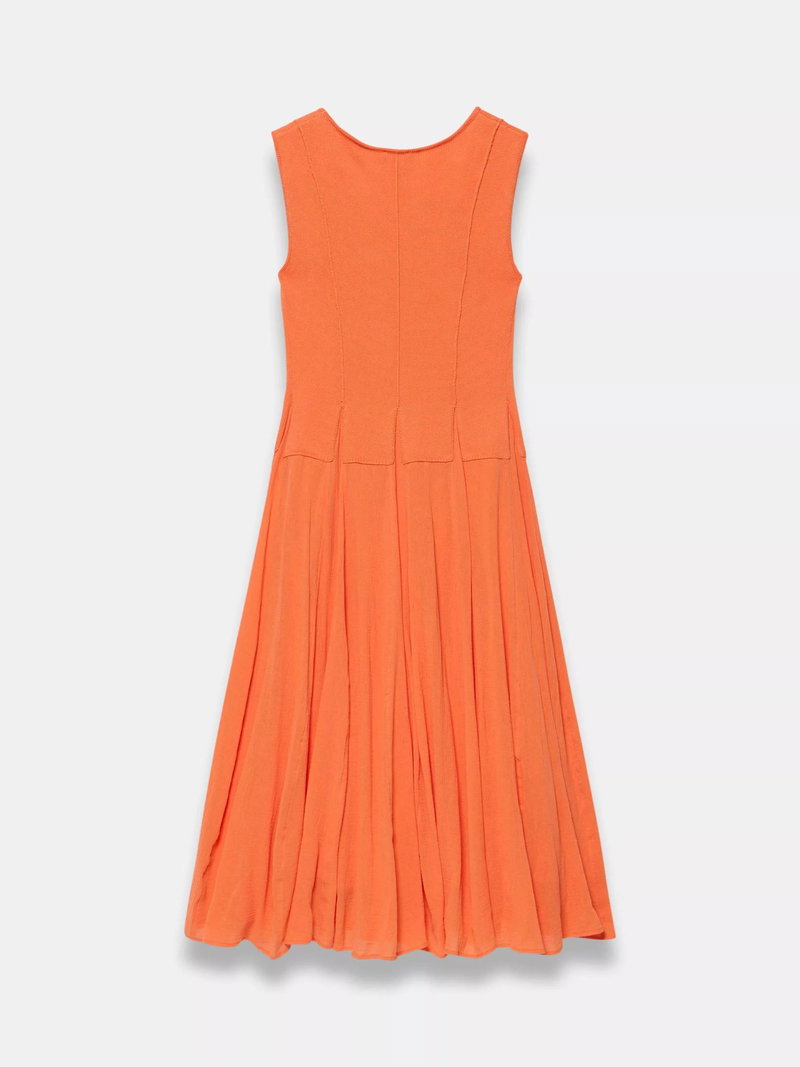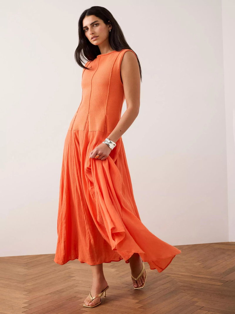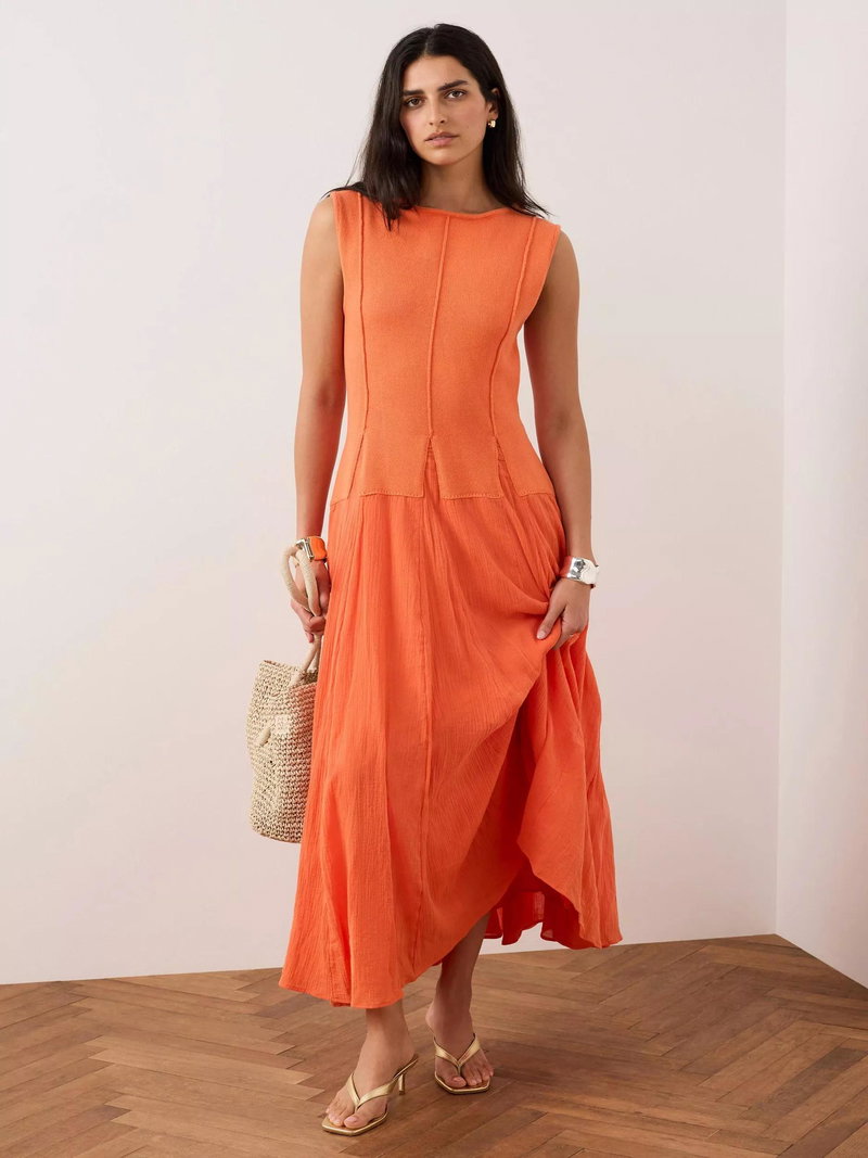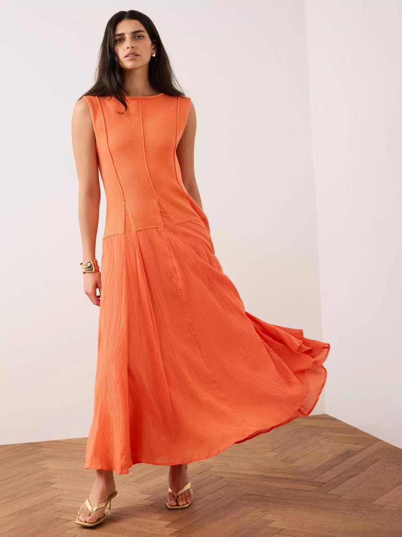 A sleeveless dress in a maxi silhouette featuring a crew neckline, seam detailing with panelled design waistband.
