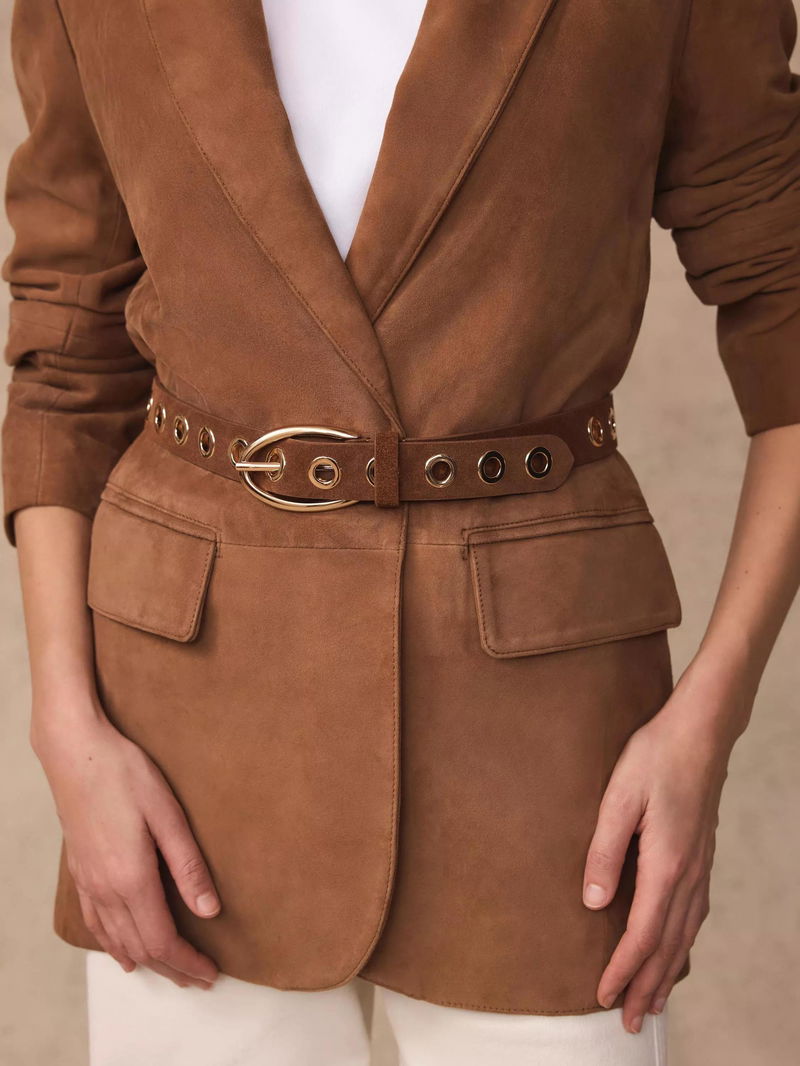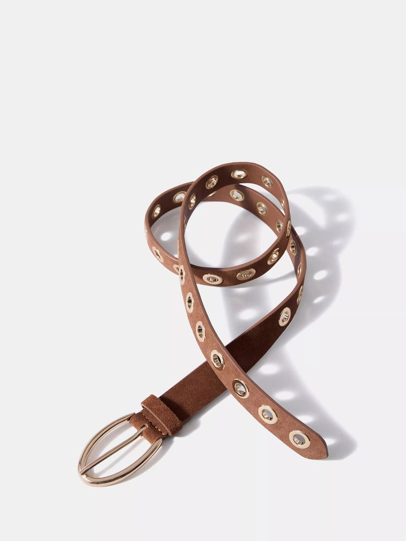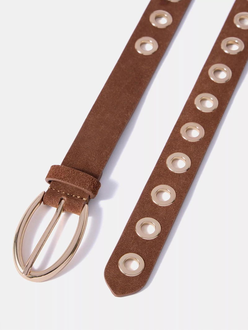 A suede belt featuring eyelet detailing and metallic-tone hardware.