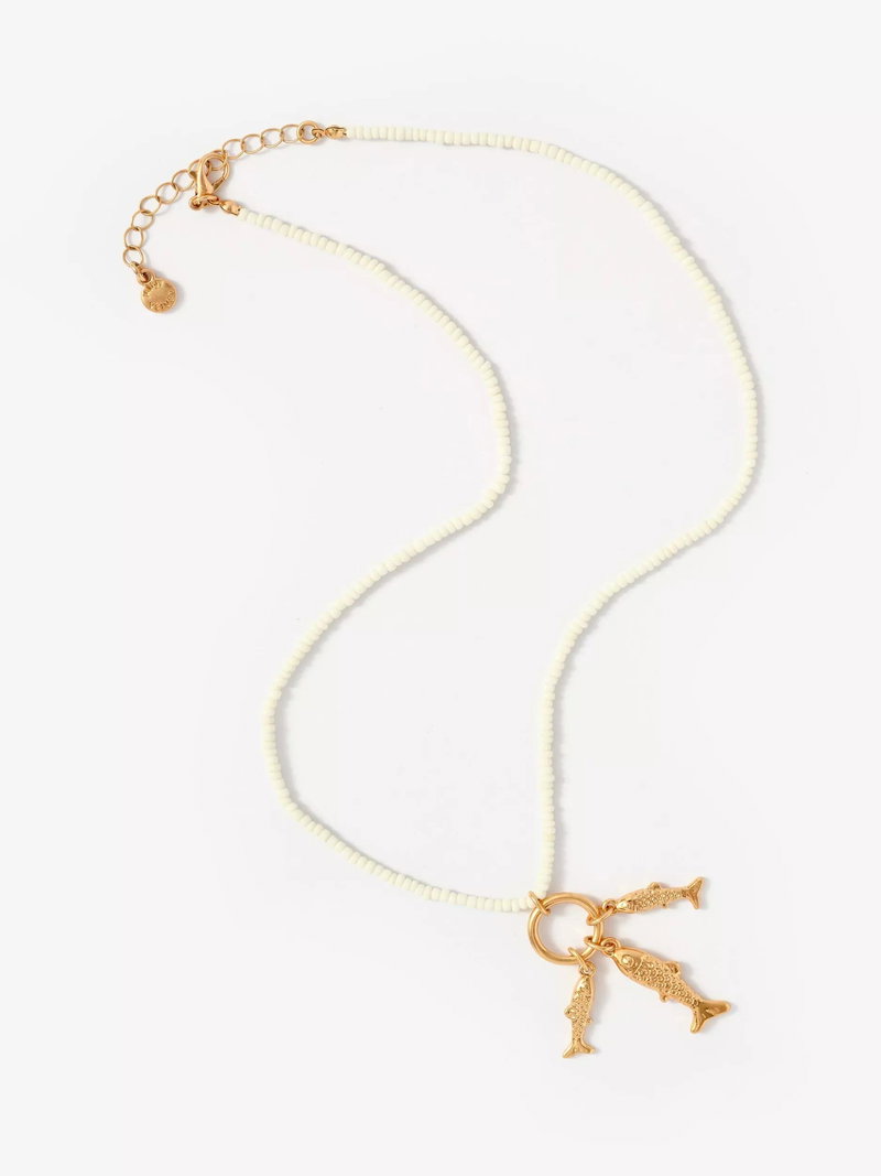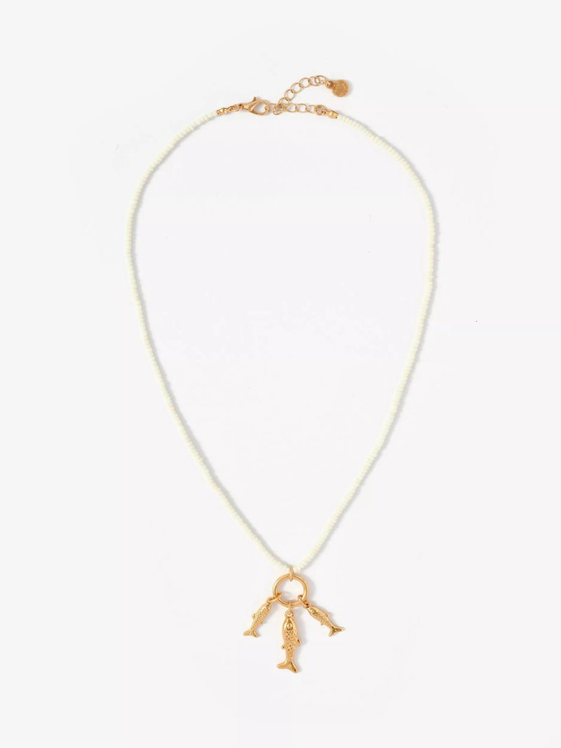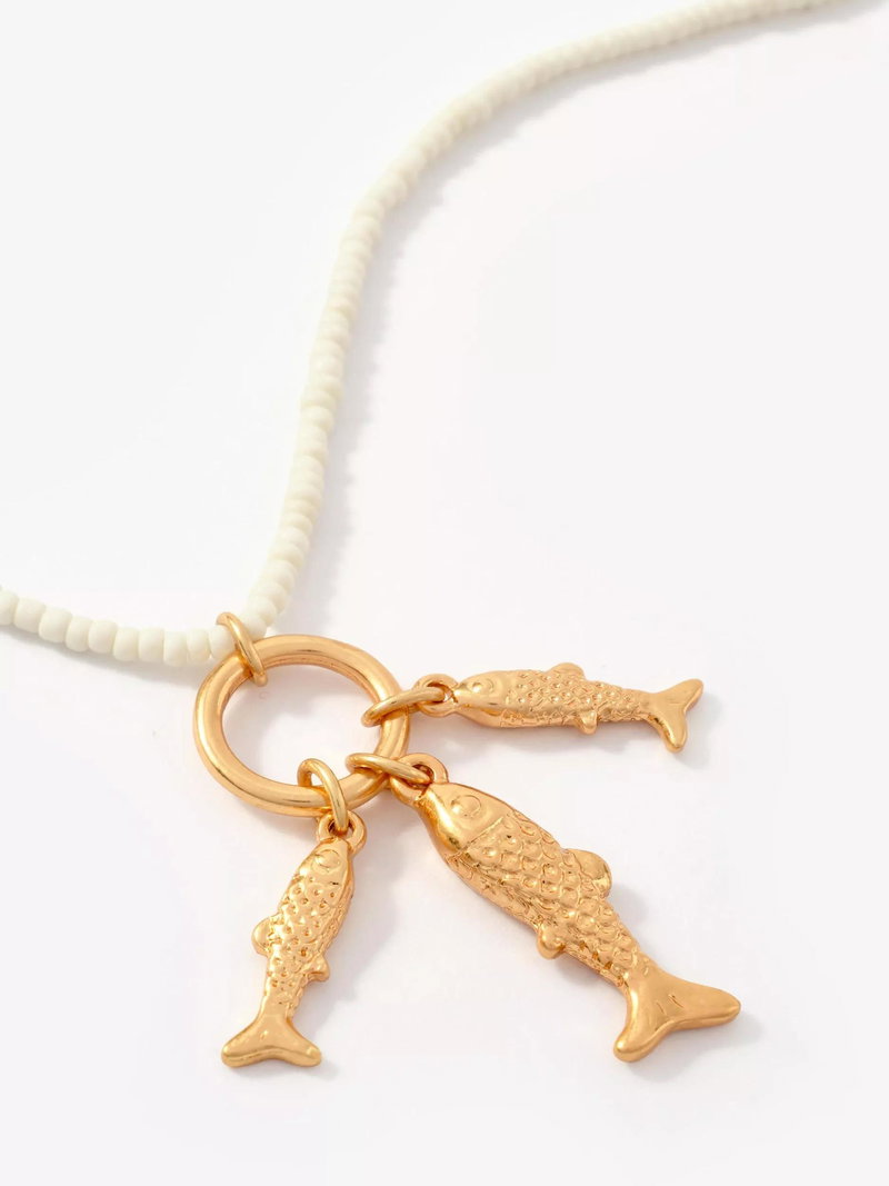 A sophisticated beaded necklace accented with elegant gold-tone fish charm pendants. Features an adjustable lobster clasp fastening for a precise fit.