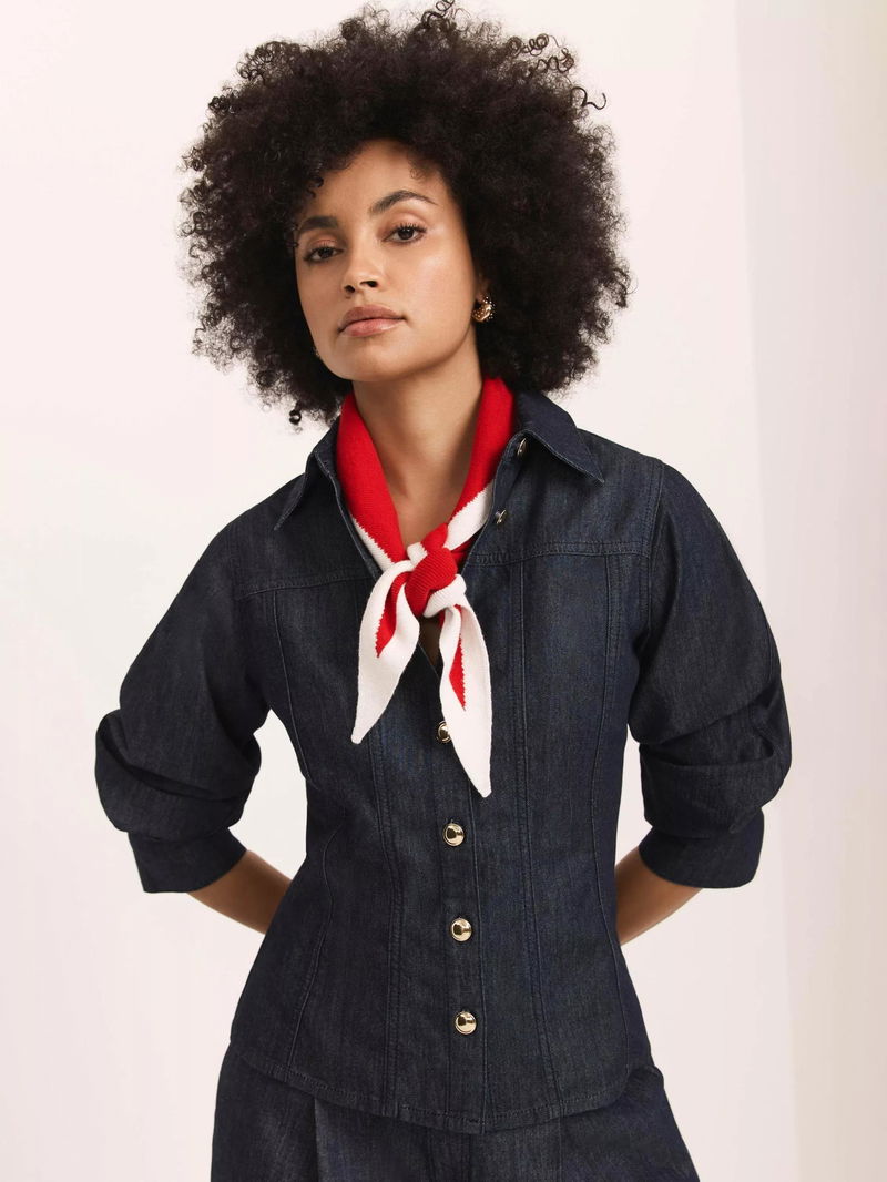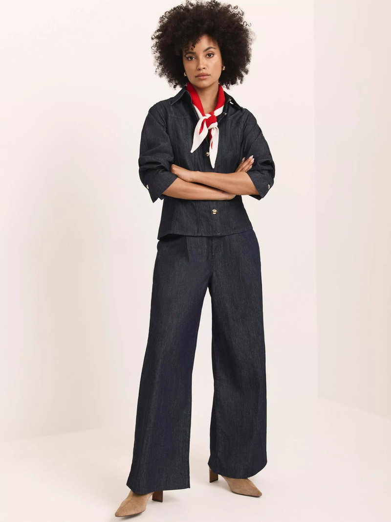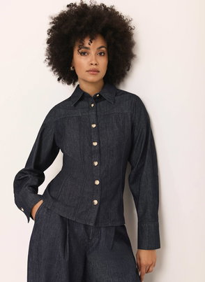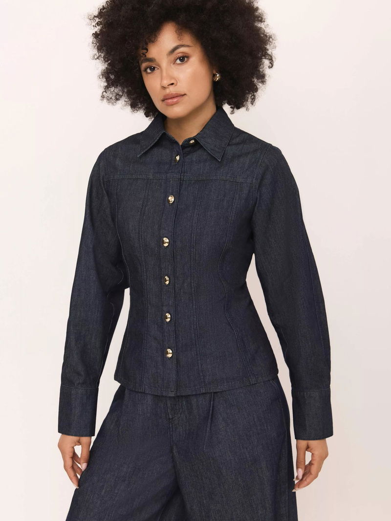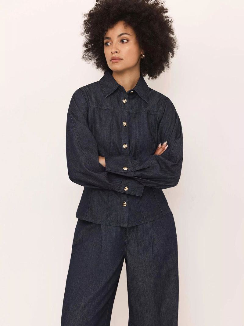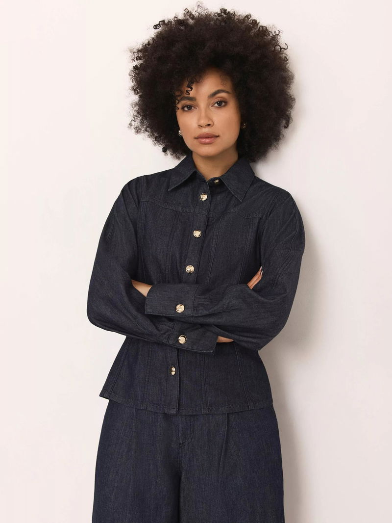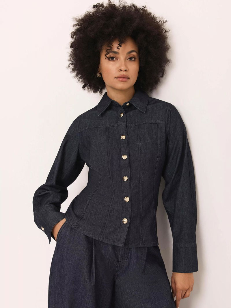 A fitted waist shirt from Mint Velvet, offered in denim. Featuring a collar and long sleeves, it's casual, comfortable, and effortlessly chic.