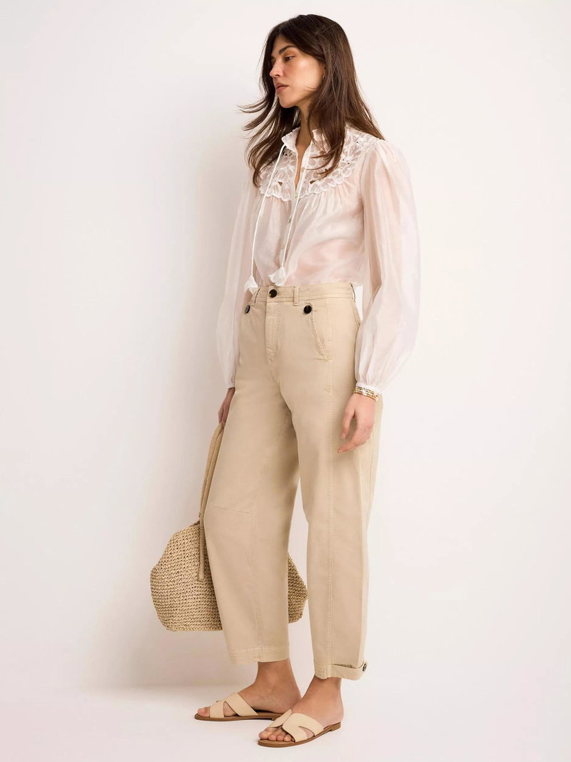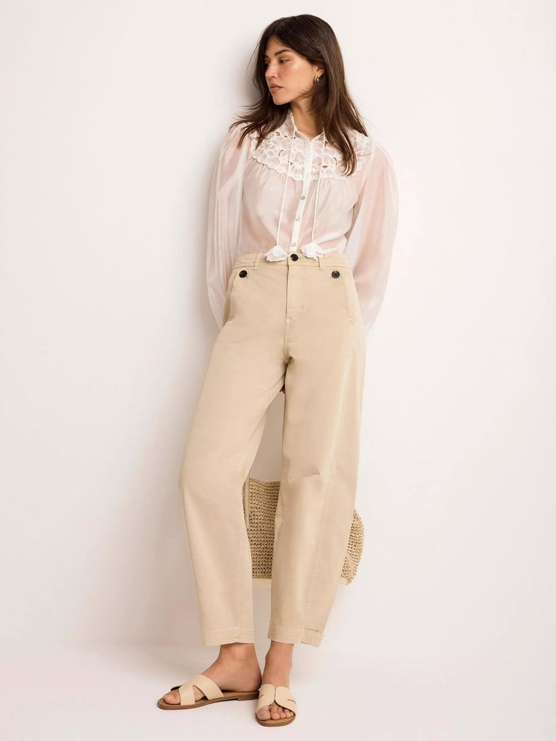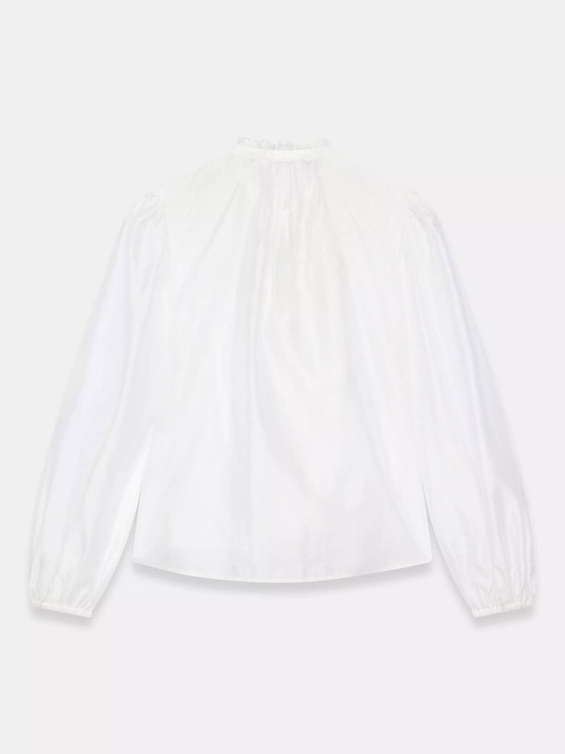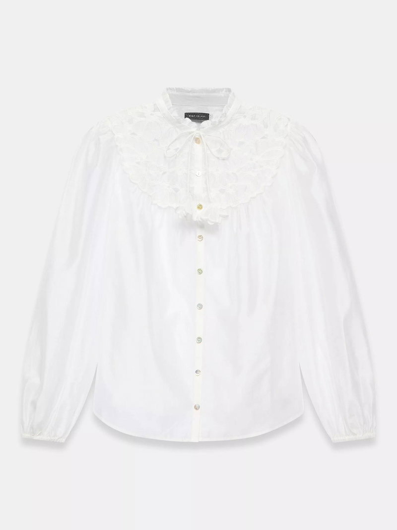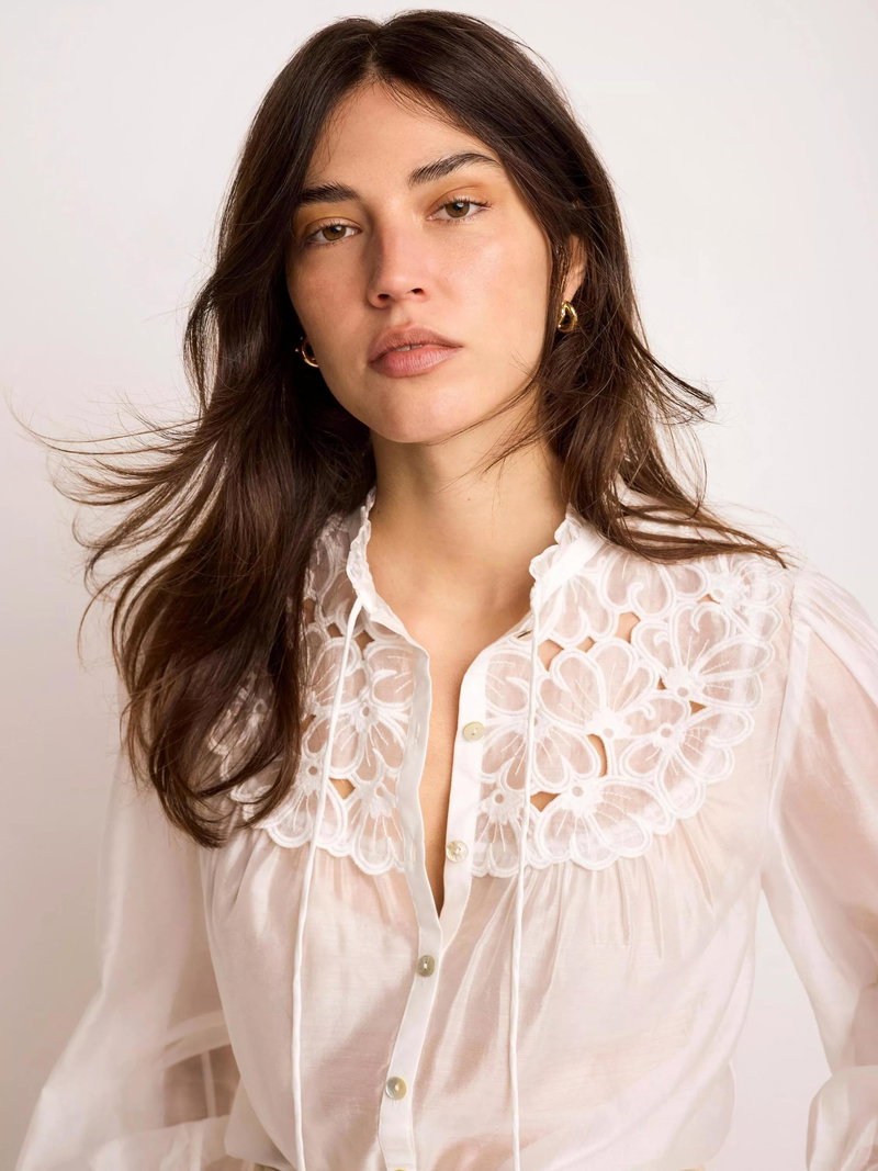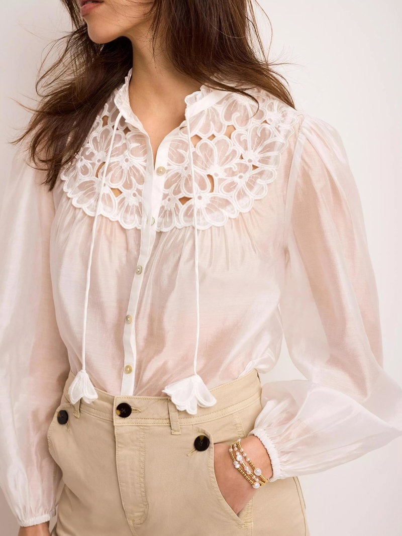 A sheer blouse by Mint Velvet. With a tie neck and long puffy sleeves, it features a floral cutwork detail. Casual, cool, and perfect from morning on.