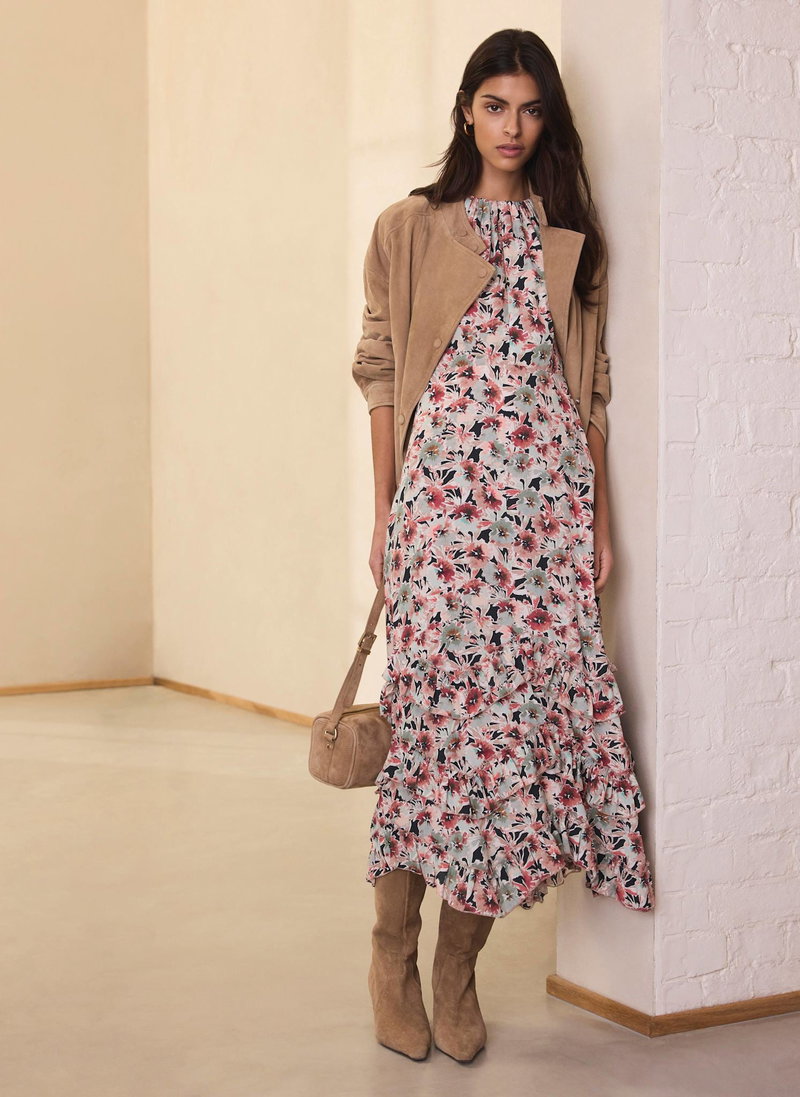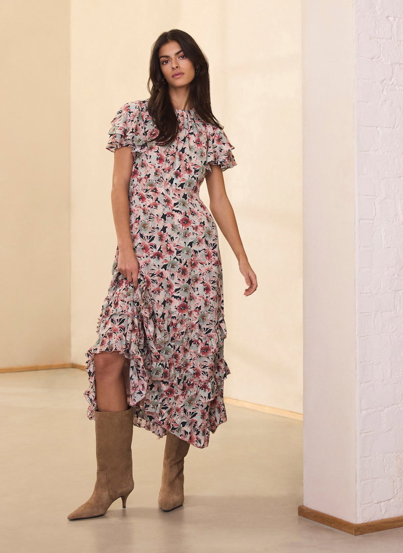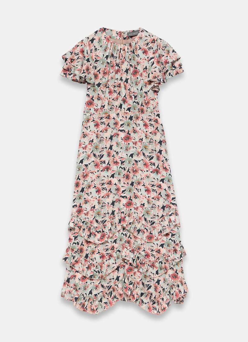 Floral print dress in a maxi silhouette featuring a gathered crew neckline, short ruffle sleeves, layered ruffle hemline with a zip fastening through the back.
