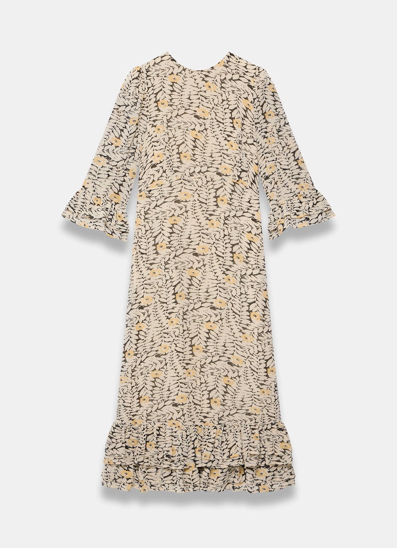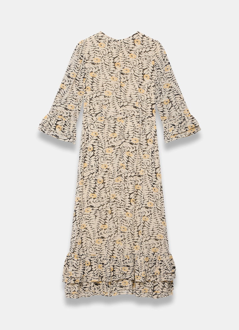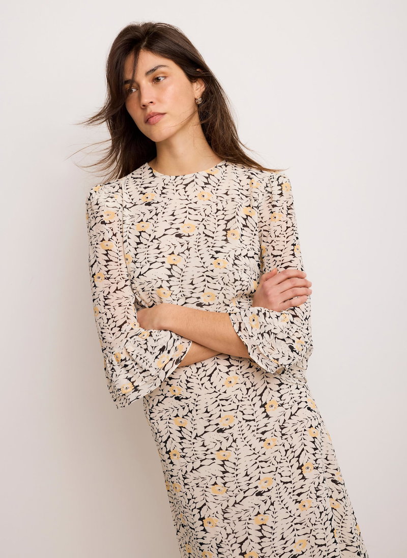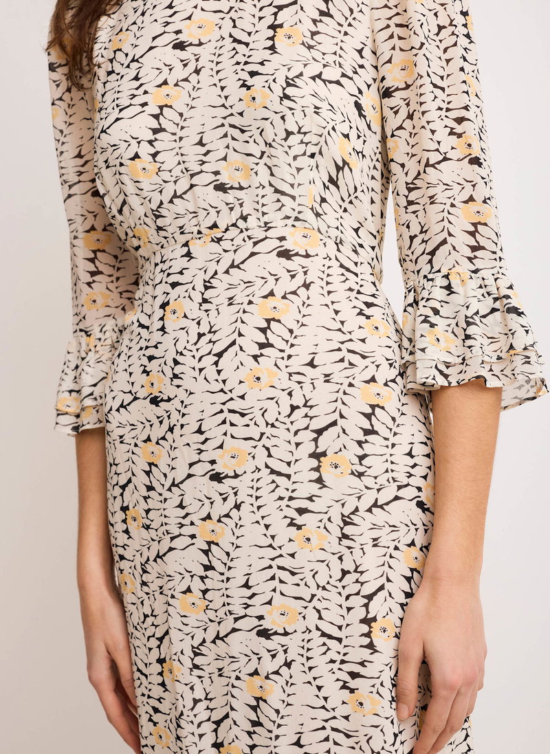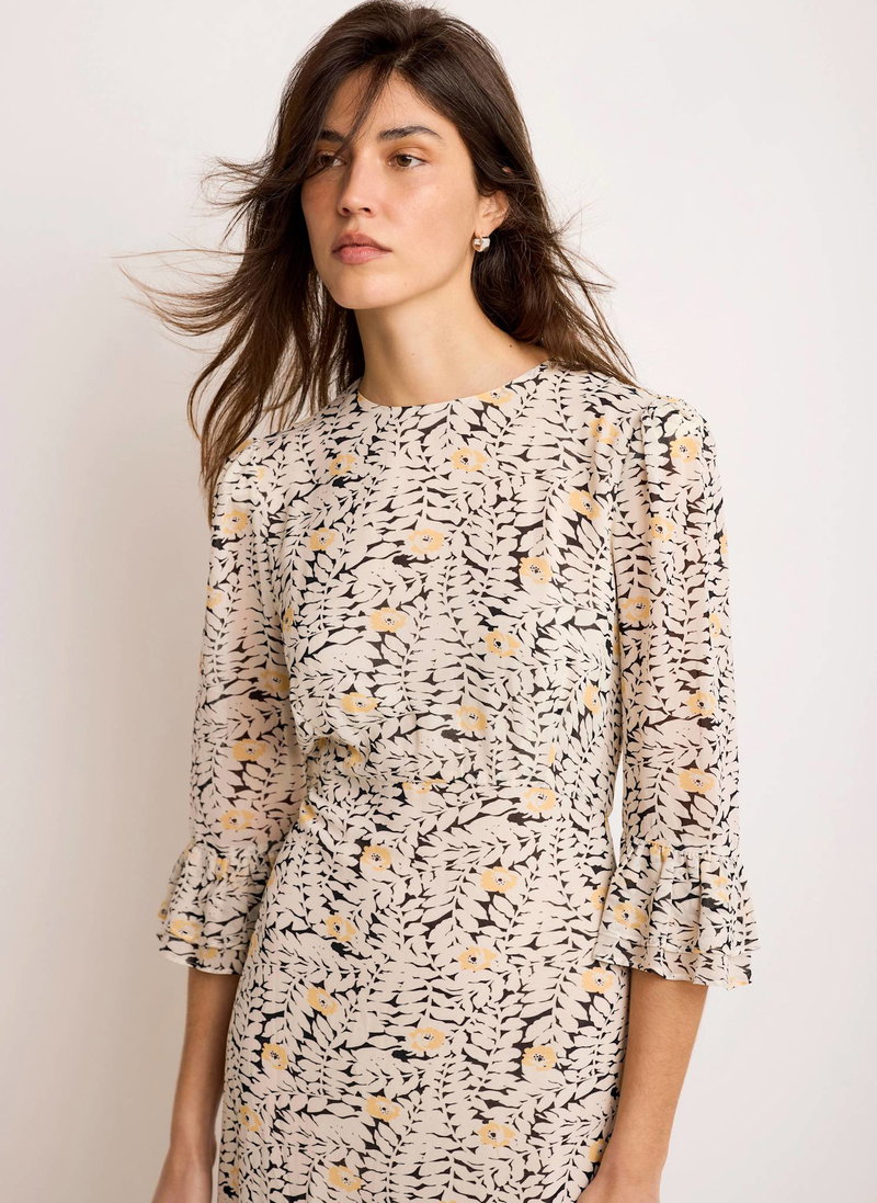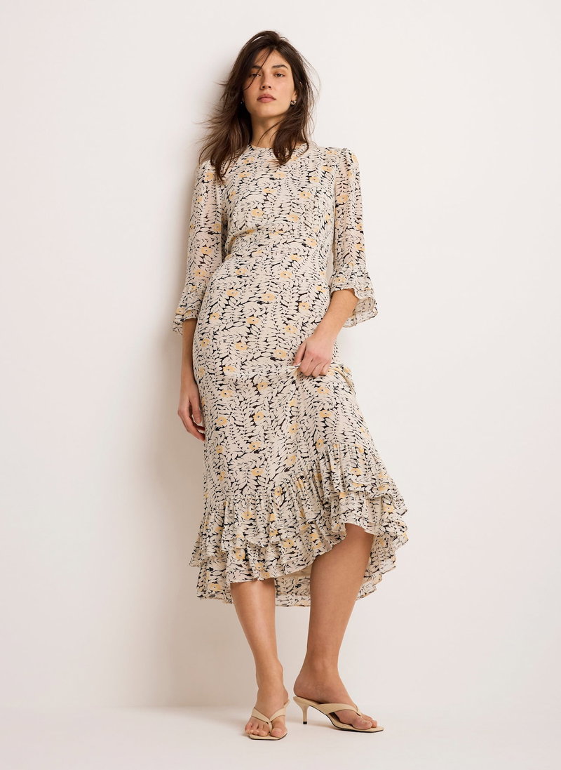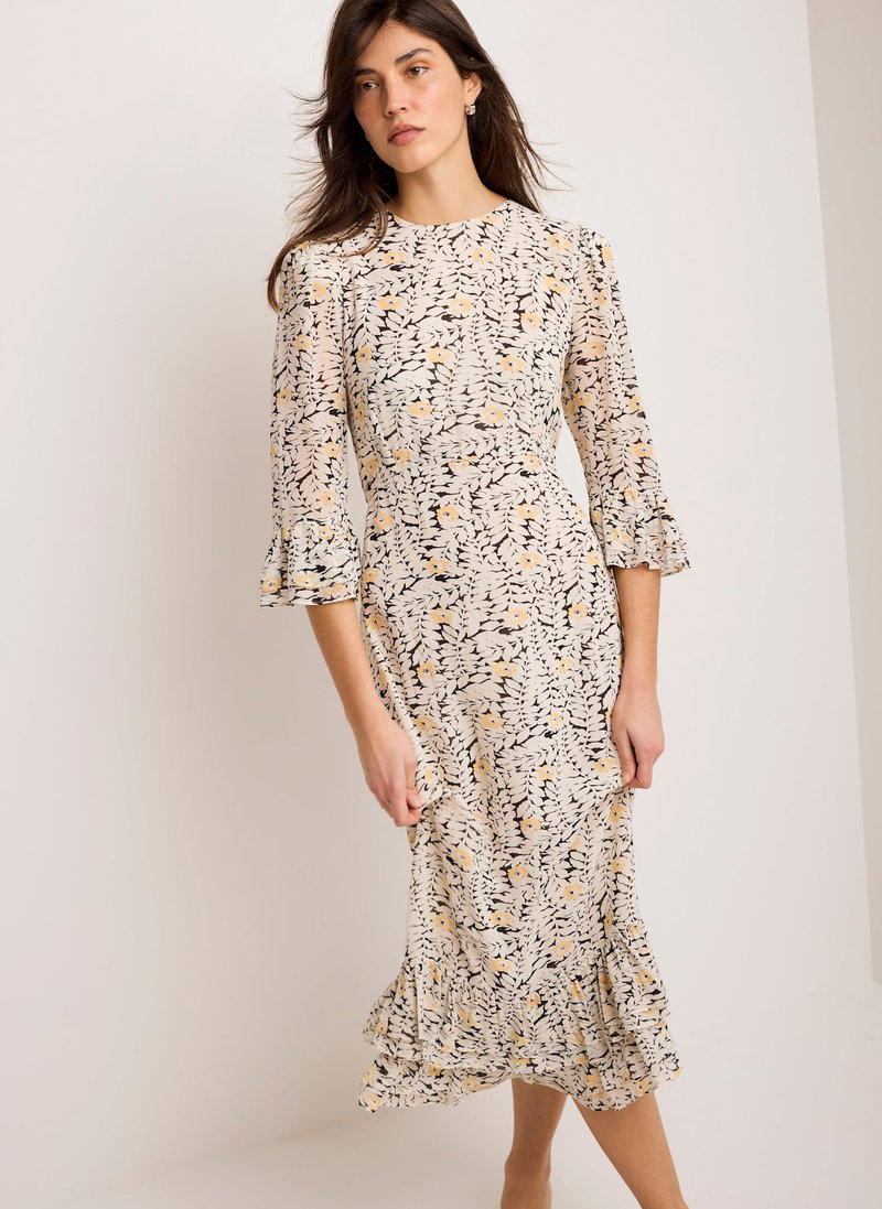 Yellow floral print dress in a midi silhouette featuring a crew neckline, 3/4 length ruffle sleeves, tiered ruffle hemline with a zip fastening through the back.
