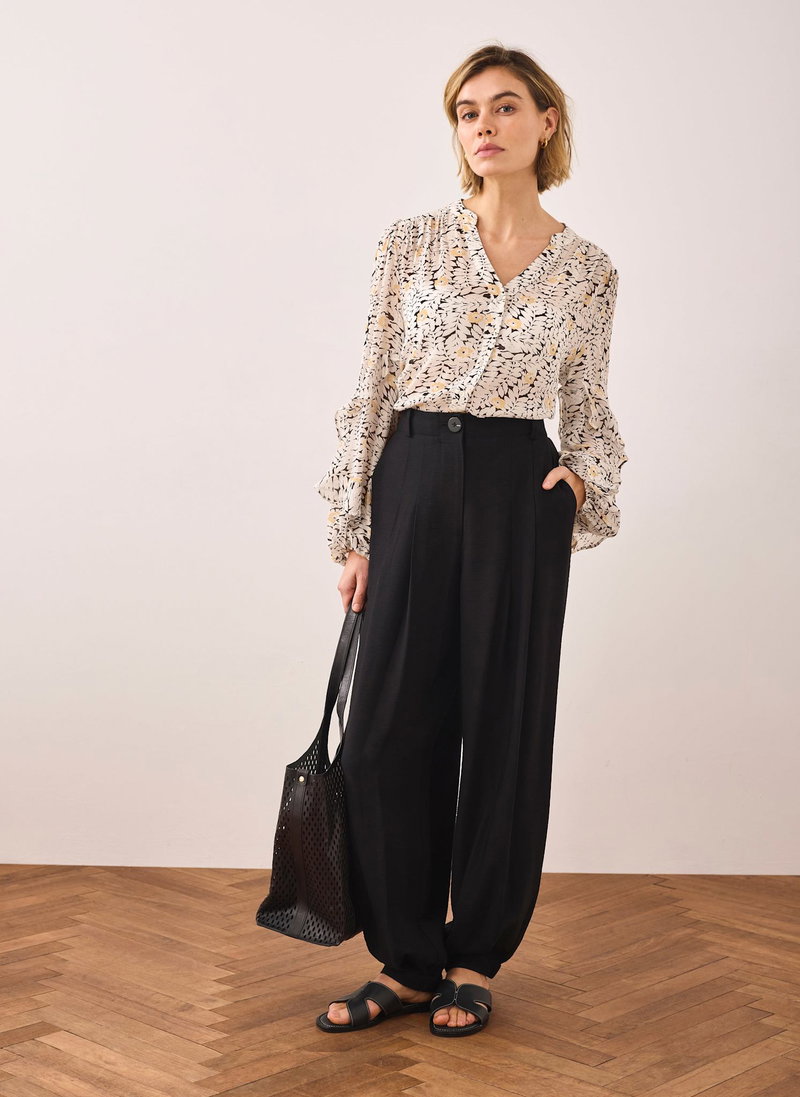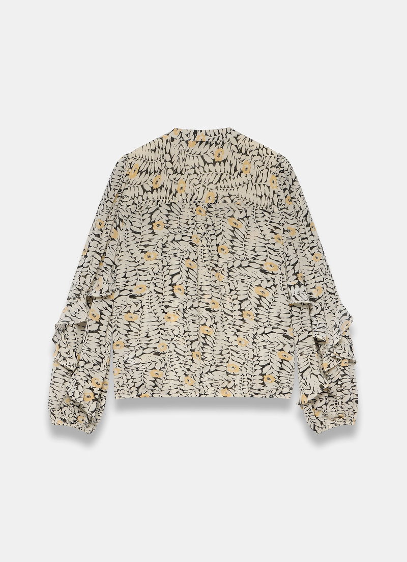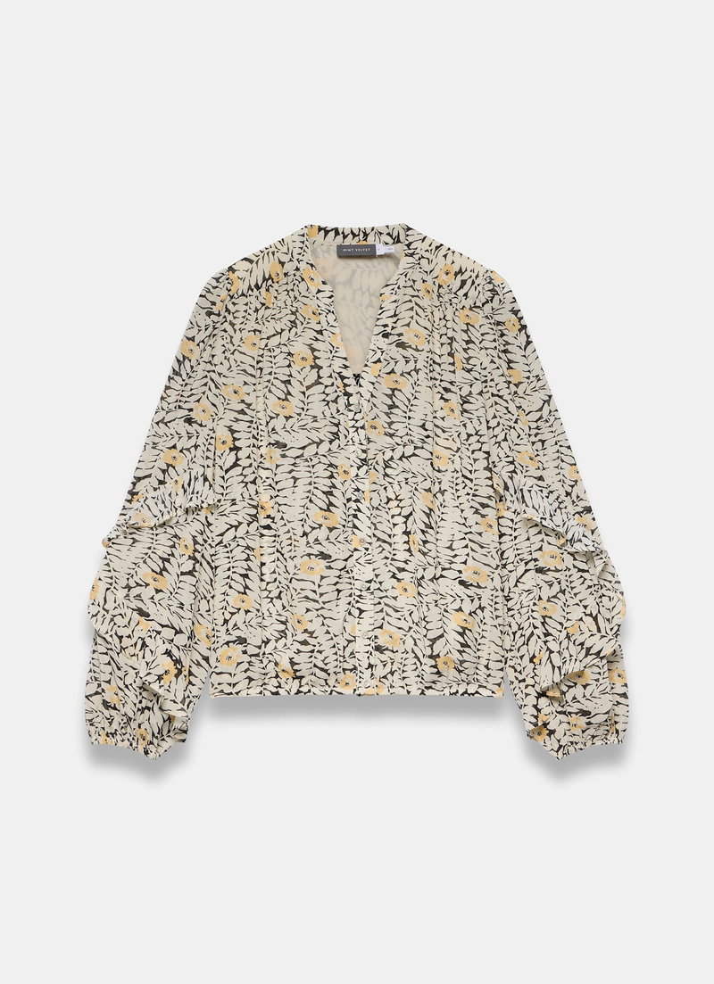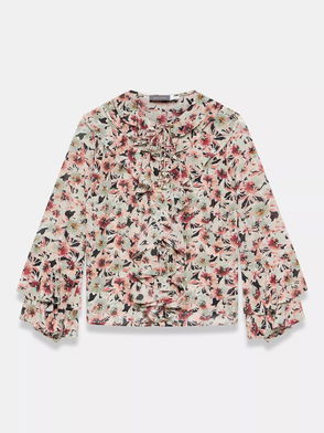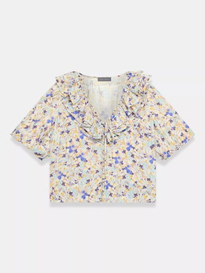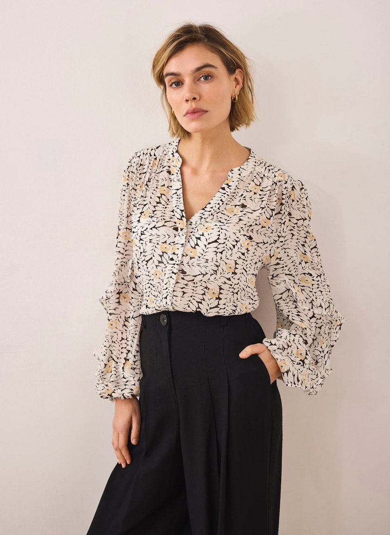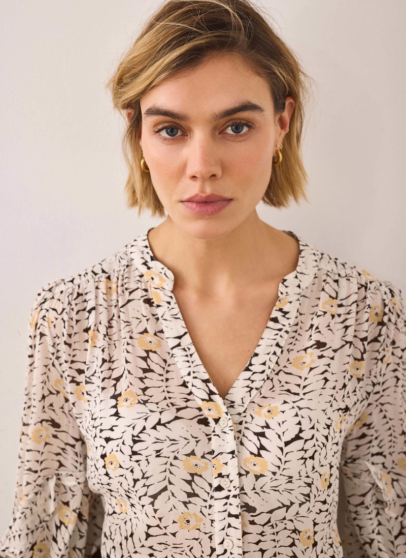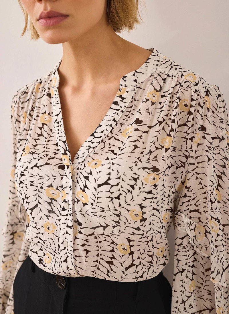 Yellow floral print blouse featuring a V-neckline, ruffle trim, long sleeves, elasticated cuffs with a button fastening through the front.