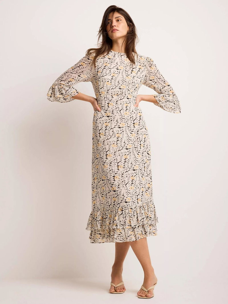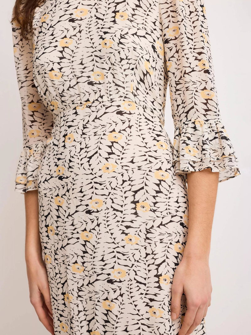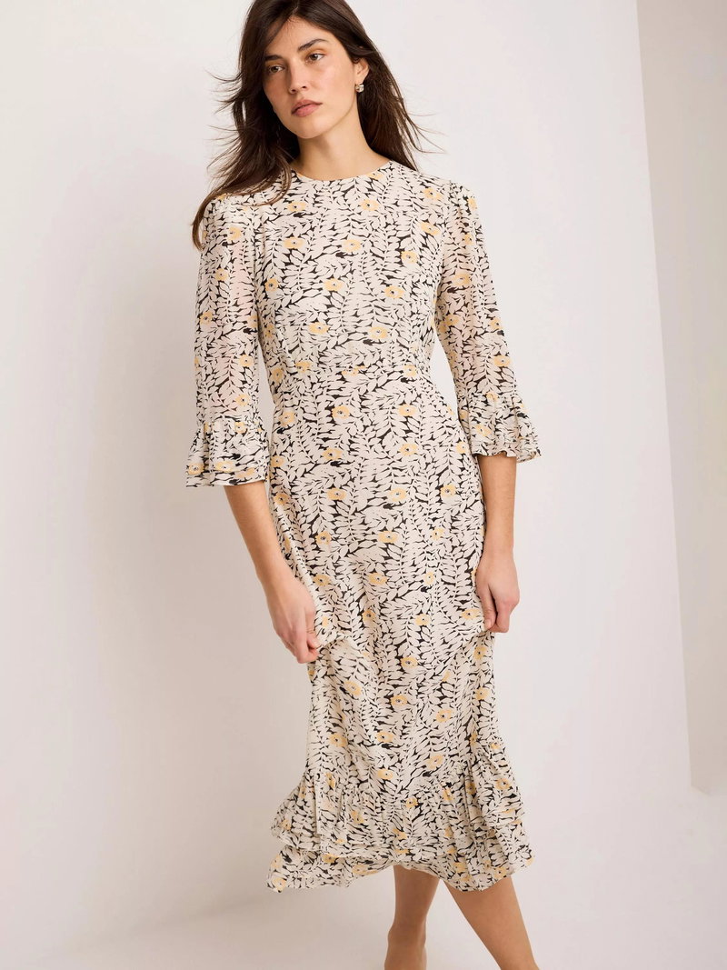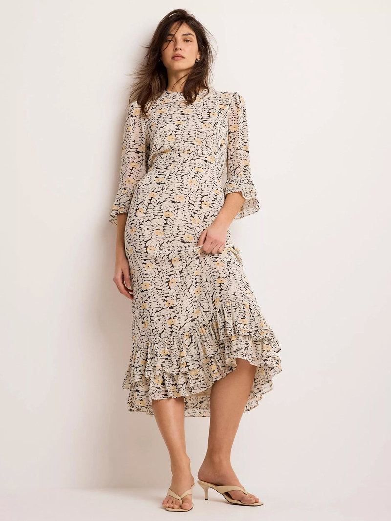 A floral print dress in a midi silhouette featuring a crew neckline, 3/4 length ruffle sleeves, tiered ruffle hemline with a zip fastening through the back.