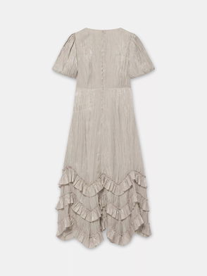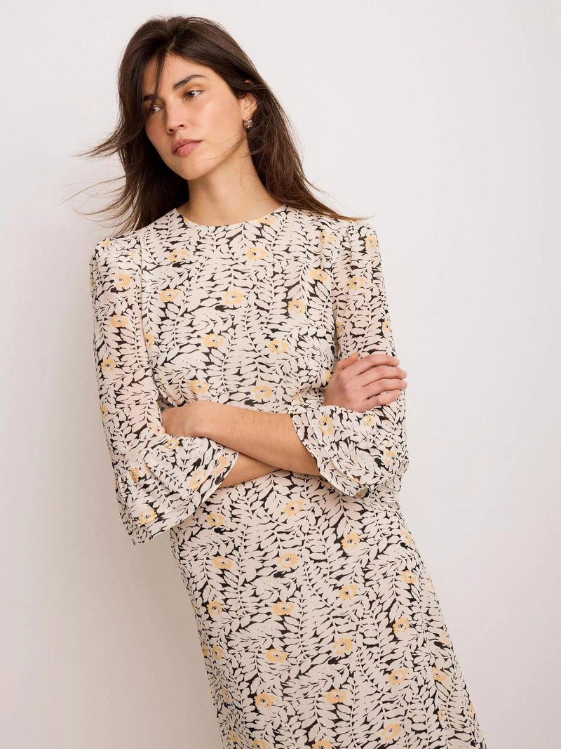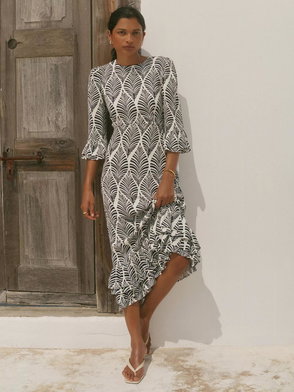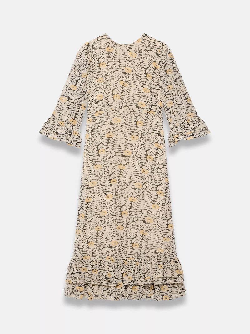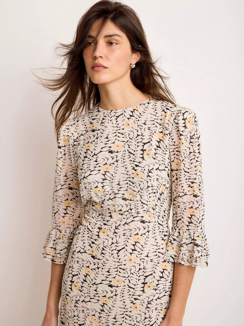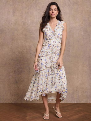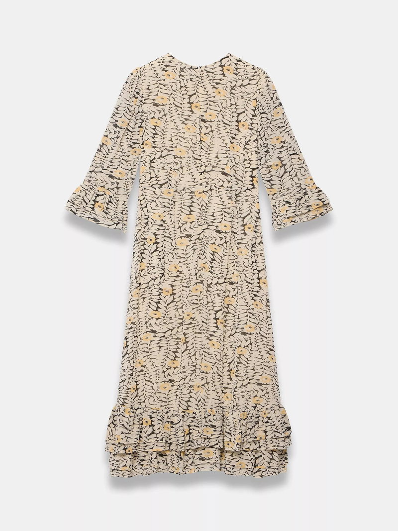 A floral print dress in a midi silhouette featuring a crew neckline, 3/4 length ruffle sleeves, tiered ruffle hemline with a zip fastening through the back.